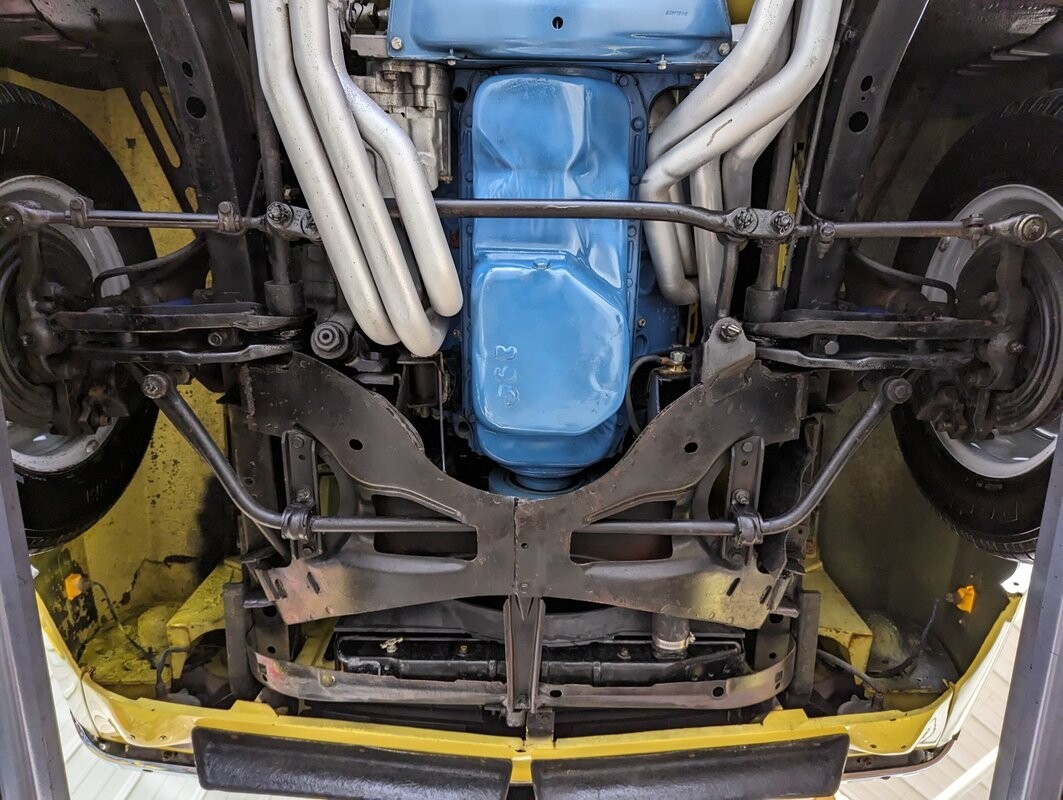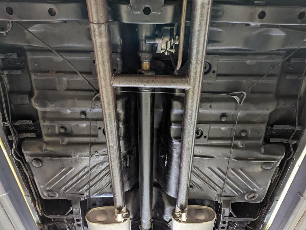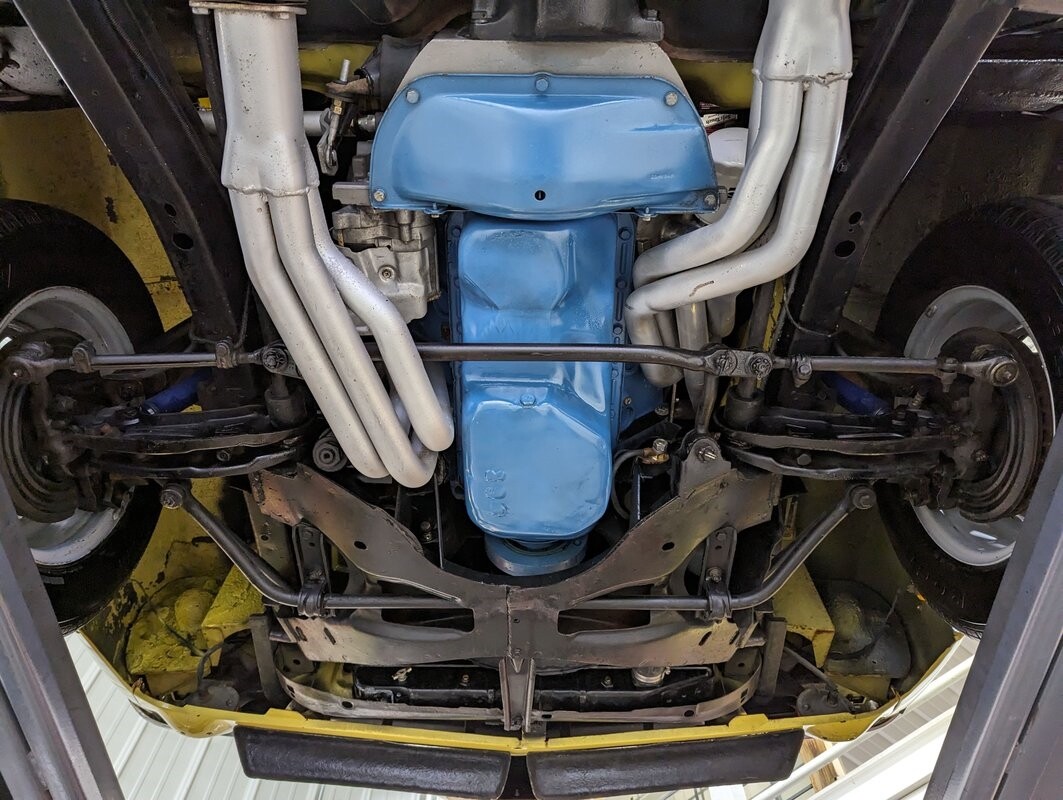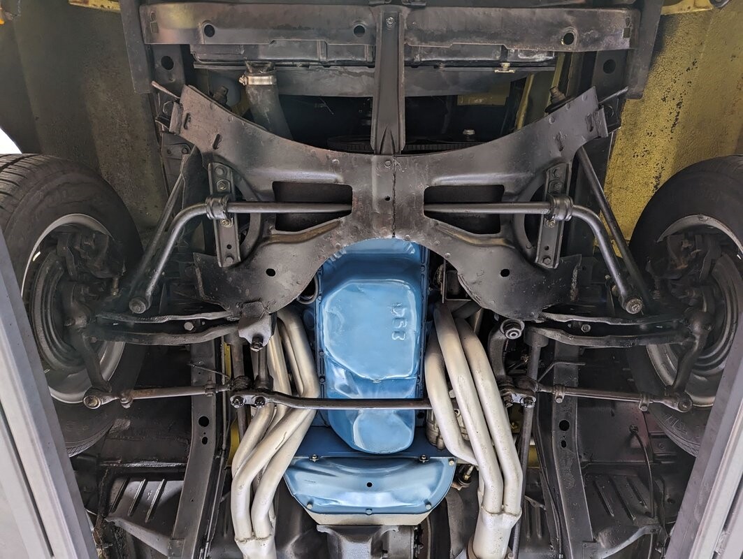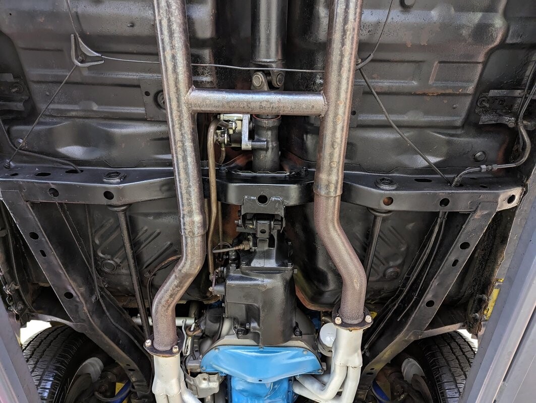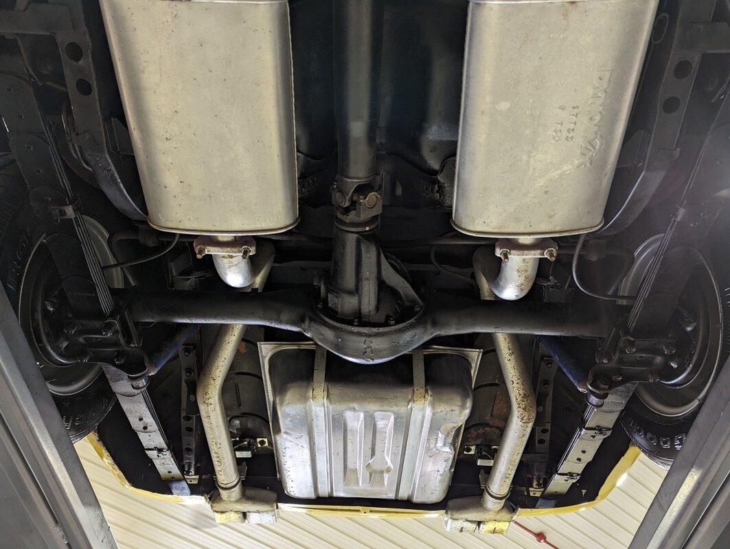 UNDERSIDE: The front end components look real clean. In back the shocks, bushings, springs also look clean. The gas tank has been replaced. The dual exhaust looks recent, it has a crossover pipe and correct square tips. It has disc brakes in front, the e-brake is hooked up. Looking up at the motor it's clean, the starter looks fresh. It has it's VIN number matching 4-speed trans and an 8 3/4 rear end with 3.55 Sure Grip gears. The floors, frame rails and rockers are all very solid.