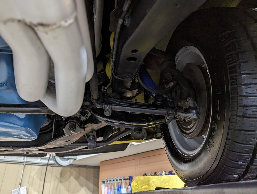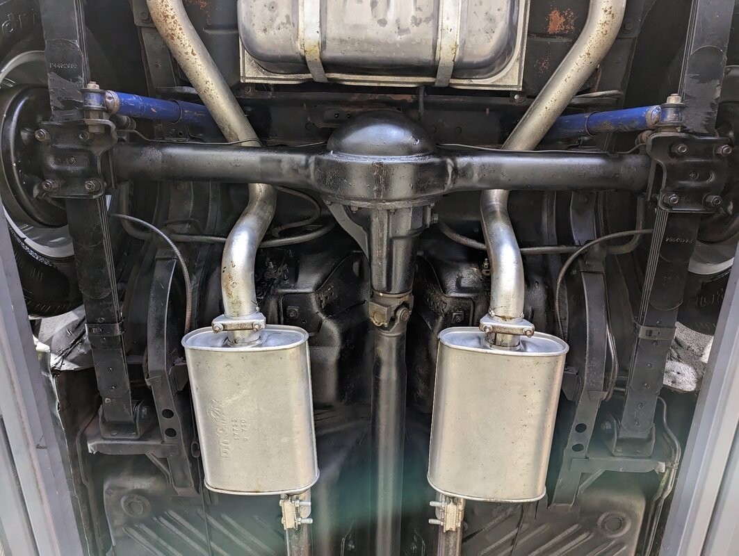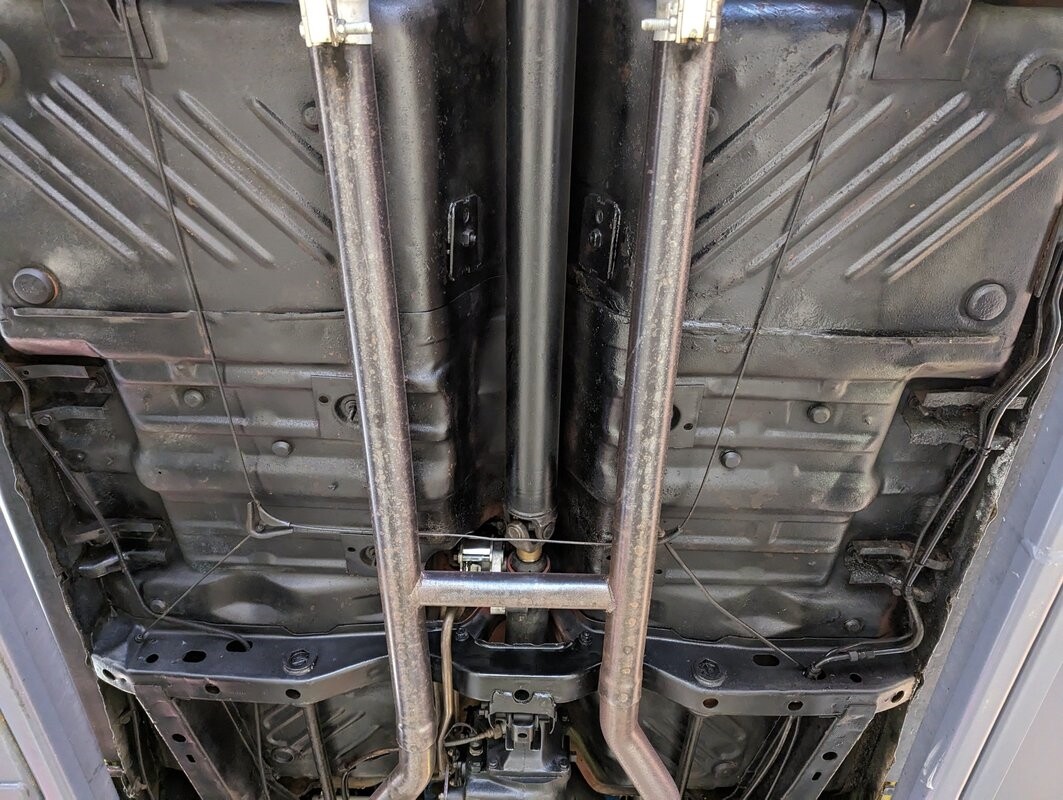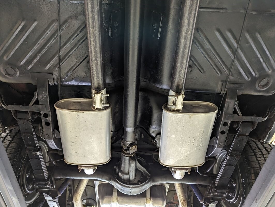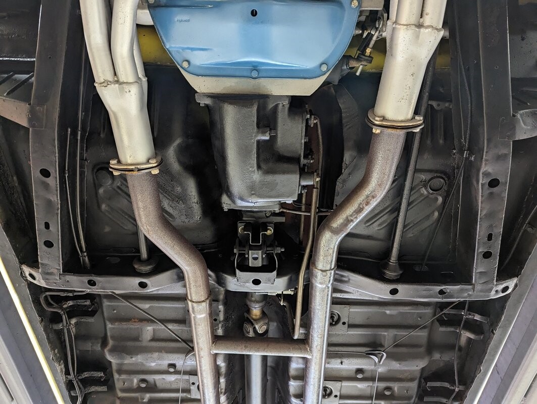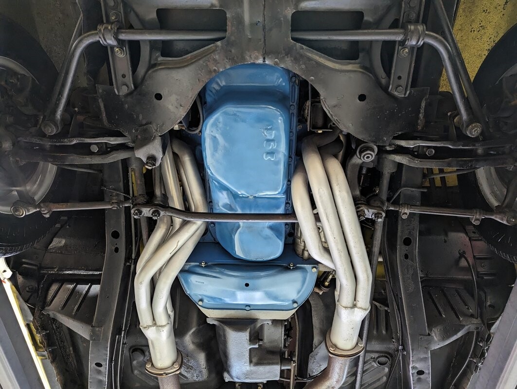 UNDERSIDE: The front end components look real clean. In back the shocks, bushings, springs also look clean. The gas tank has been replaced. The dual exhaust looks recent, it has a crossover pipe and correct square tips. It has disc brakes in front, the e-brake is hooked up. Looking up at the motor it's clean, the starter looks fresh. It has it's VIN number matching 4-speed trans and an 8 3/4 rear end with 3.55 Sure Grip gears. The floors, frame rails and rockers are all very solid.