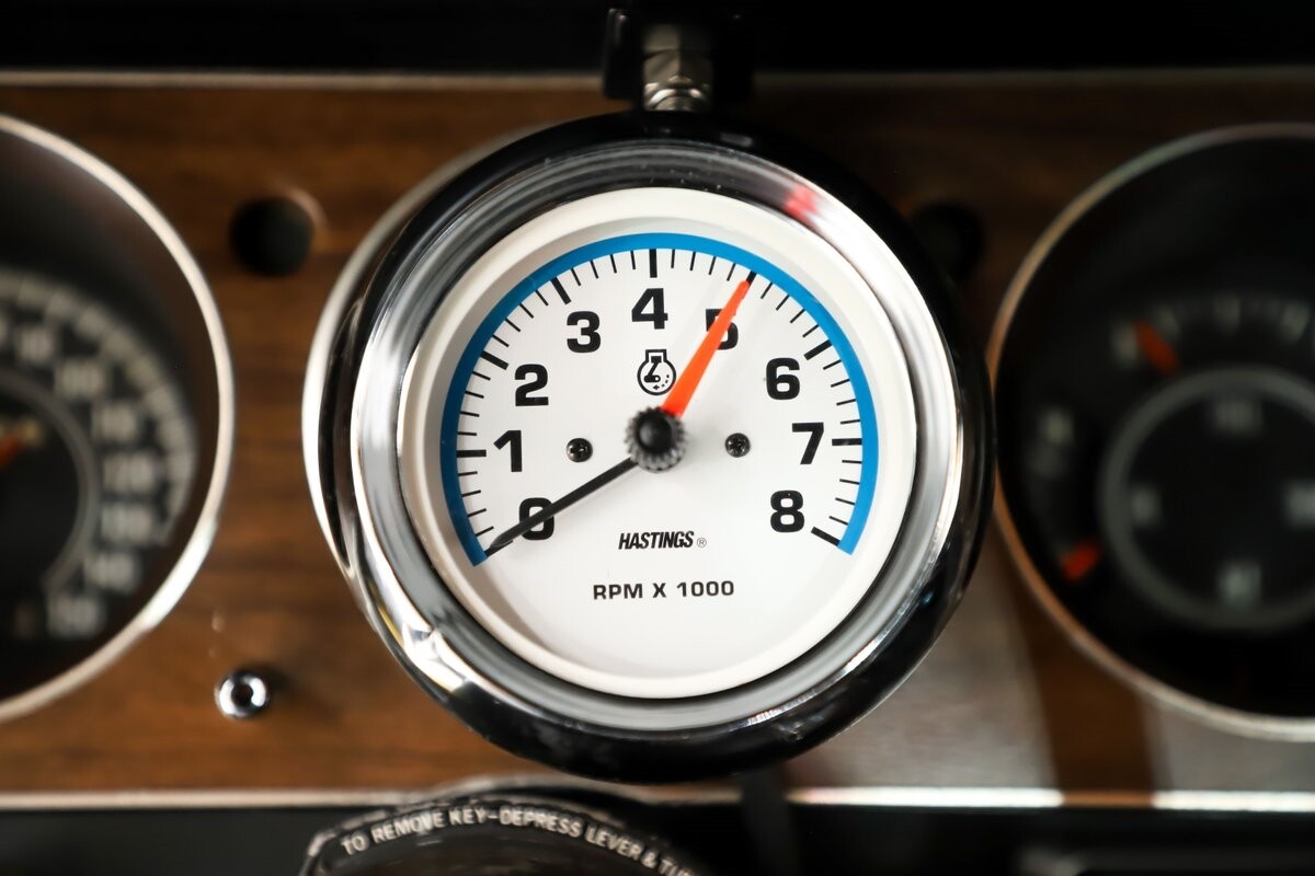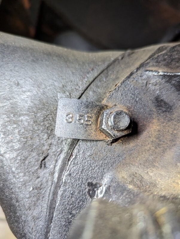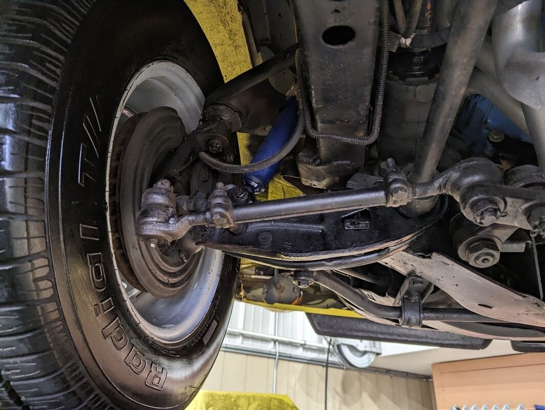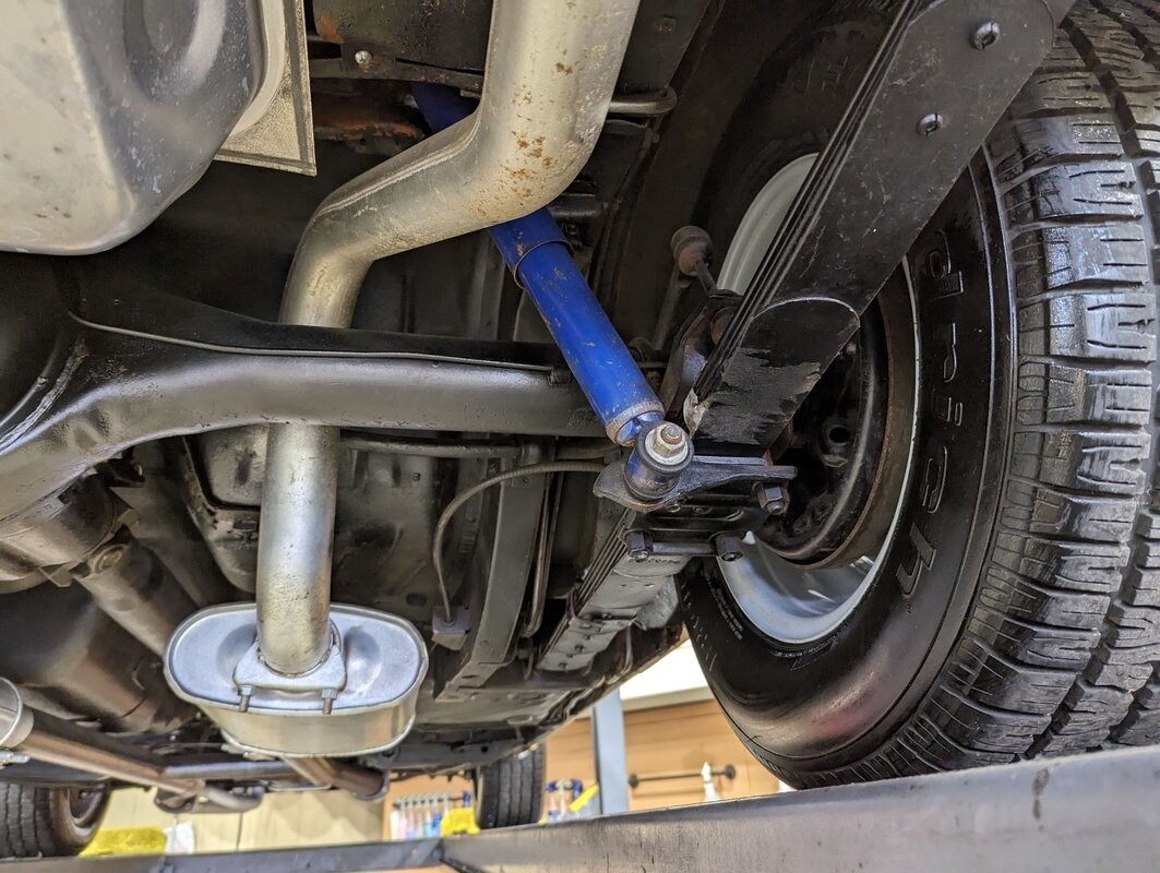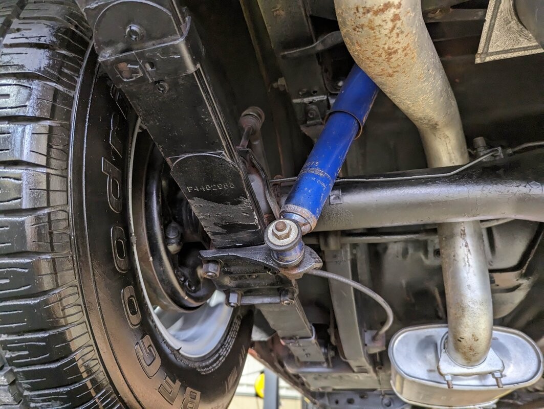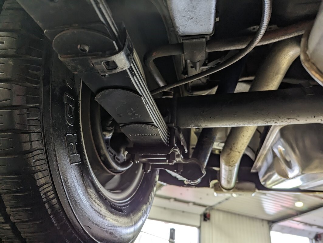UNDERSIDE: The front end components look real clean. In back the shocks, bushings, springs also look clean. The gas tank has been replaced. The dual exhaust looks recent, it has a crossover pipe and correct square tips. It has disc brakes in front, the e-brake is hooked up. Looking up at the motor it's clean, the starter looks fresh. It has it's VIN number matching 4-speed trans and an 8 3/4 rear end with 3.55 Sure Grip gears. The floors, frame rails and rockers are all very solid.