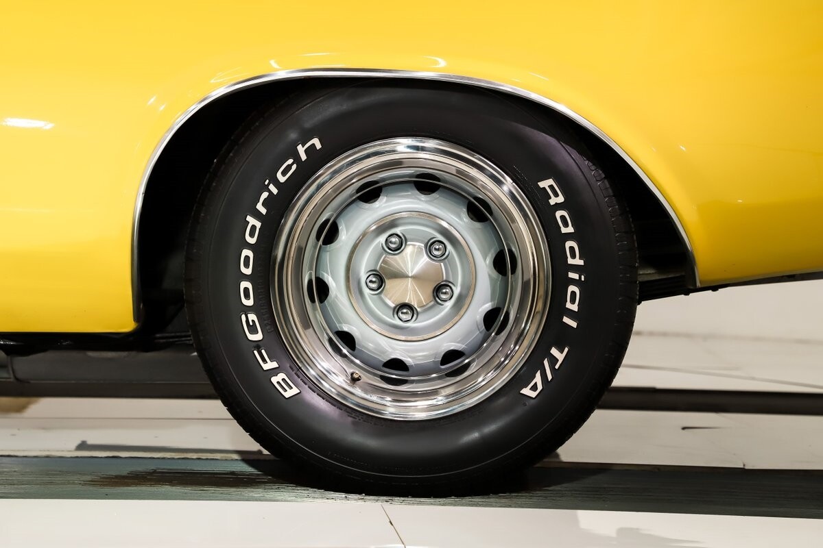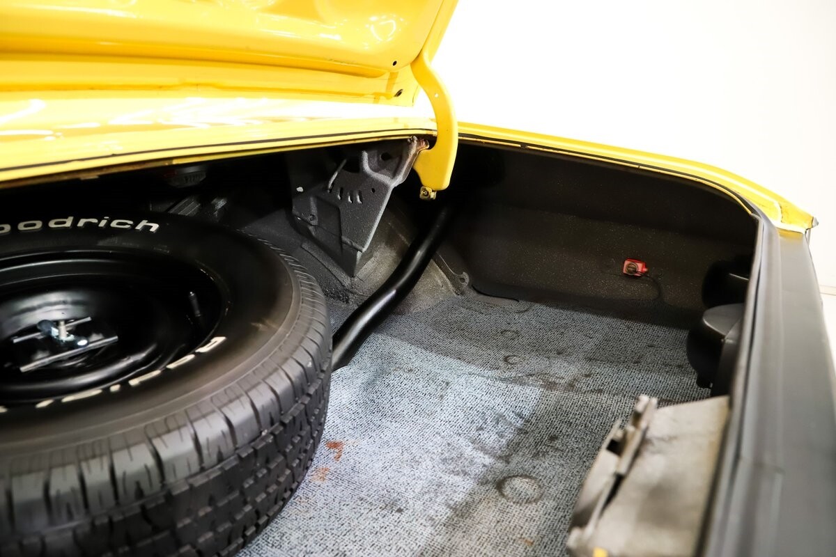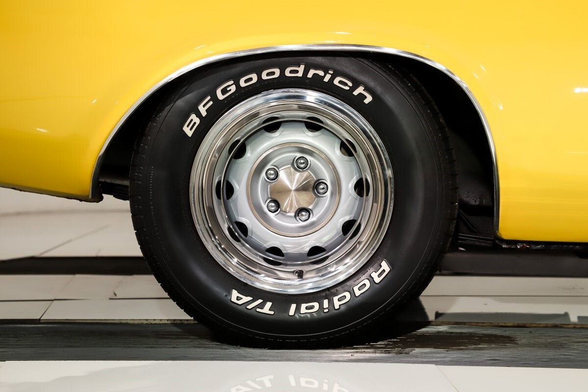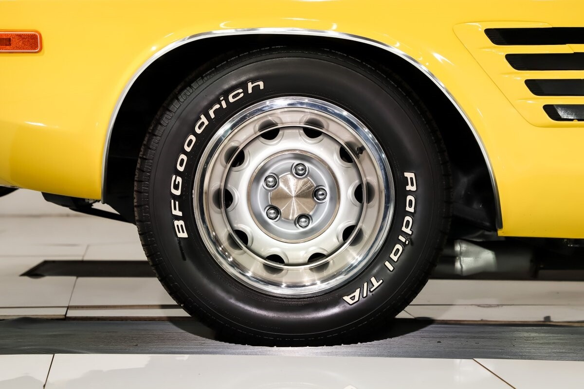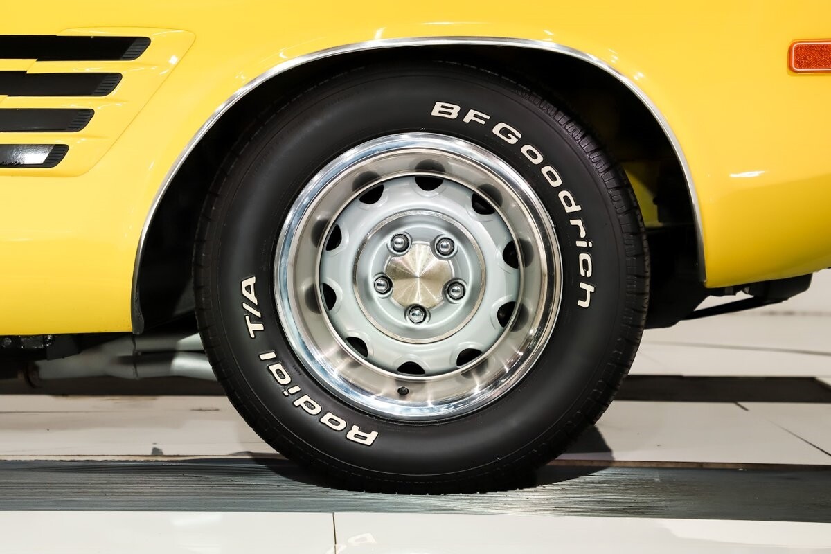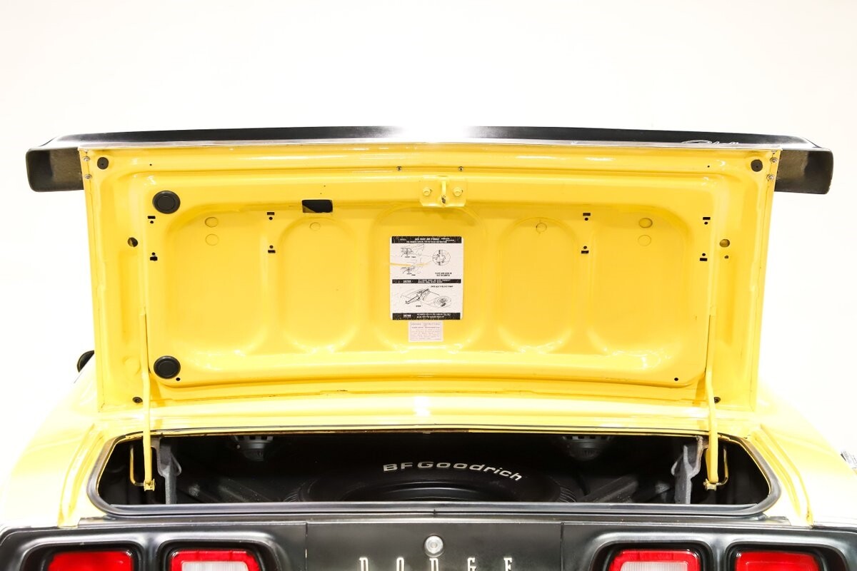 EXTERIOR: This is a great looking car! I love the body lines, colors, and stripes. It's decked out with the power bulge hood with racing pins, rear spoiler, chin spoilers and racing mirrors. The body is clean: straight, fits right, no rust or damage. Beautiful high impact Top Banana Yellow is smooth and glossy, no vinyl top. I love the stripes, especially the strobe strips on the sides. The bumpers are shiny, they left off the ugly bumper guards. All the trim looks great, correct antenna and racing gas cap. The 15 inch Rallye wheels and BFG tires look new.