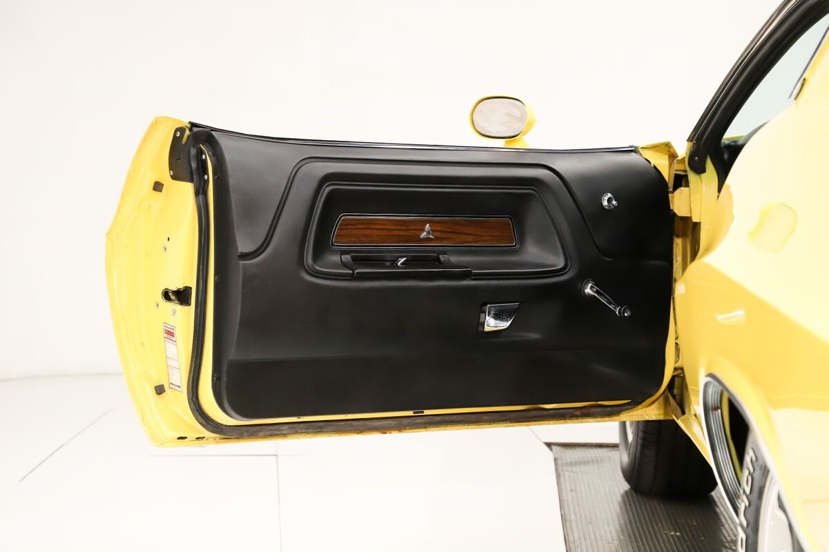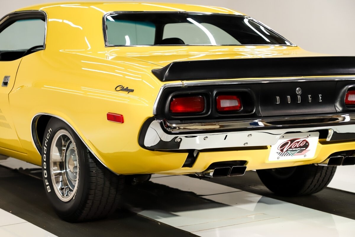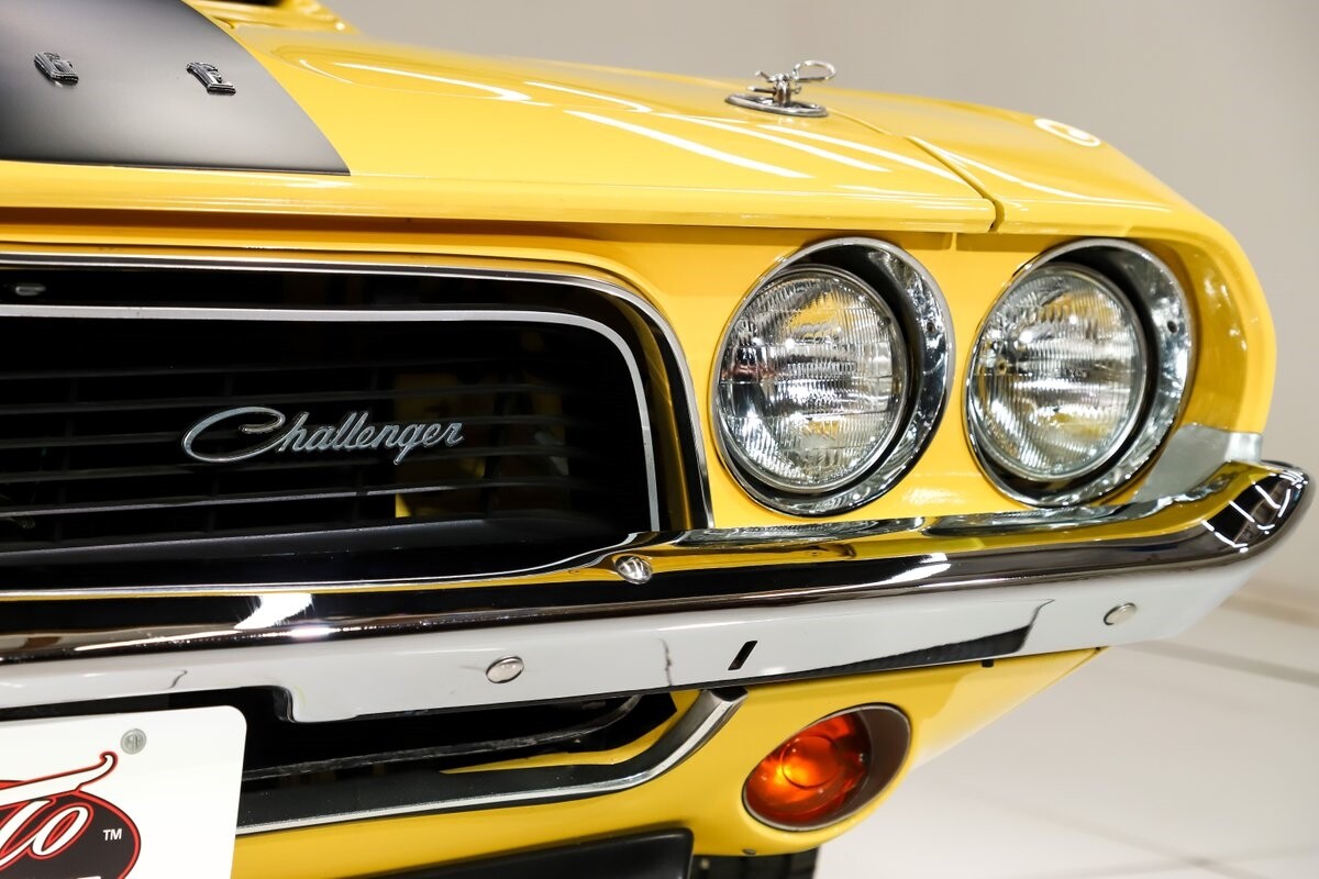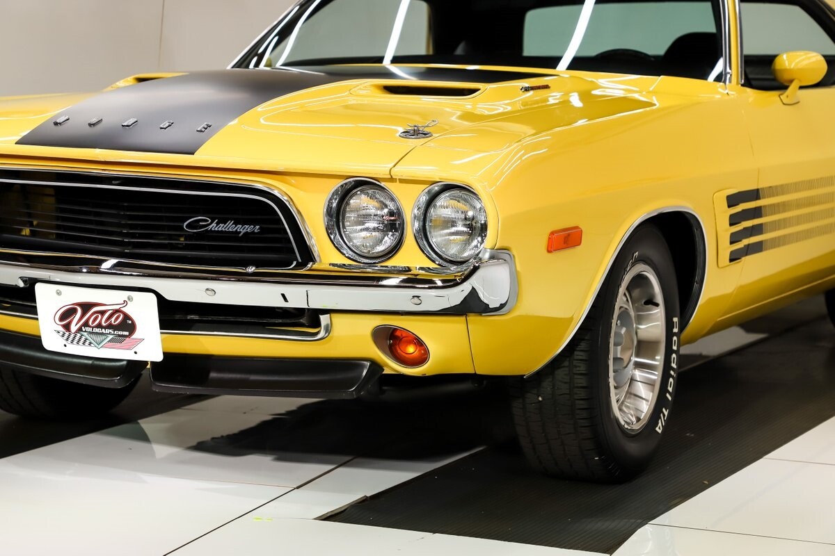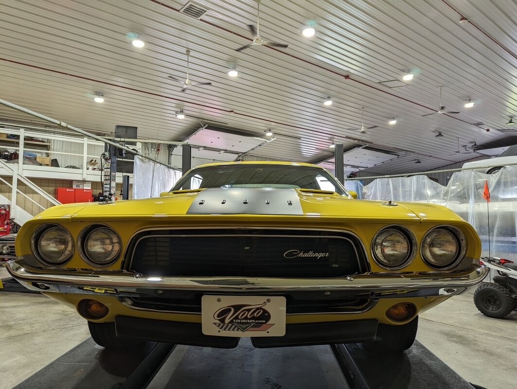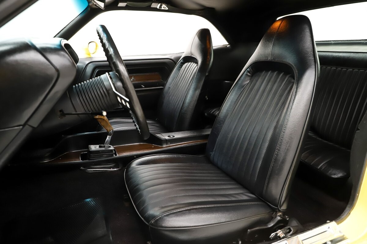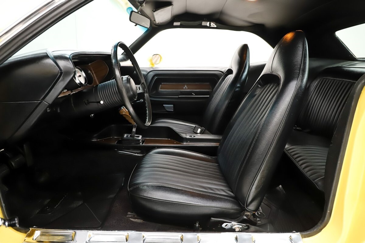 EXTERIOR: This is a great looking car! I love the body lines, colors, and stripes. It's decked out with the power bulge hood with racing pins, rear spoiler, chin spoilers and racing mirrors. The body is clean: straight, fits right, no rust or damage. Beautiful high impact Top Banana Yellow is smooth and glossy, no vinyl top. I love the stripes, especially the strobe strips on the sides. The bumpers are shiny, they left off the ugly bumper guards. All the trim looks great, correct antenna and racing gas cap. The 15 inch Rallye wheels and BFG tires look new.