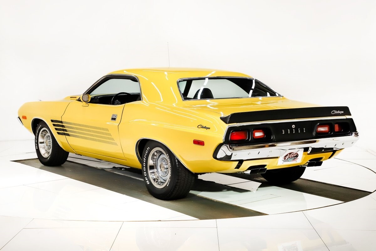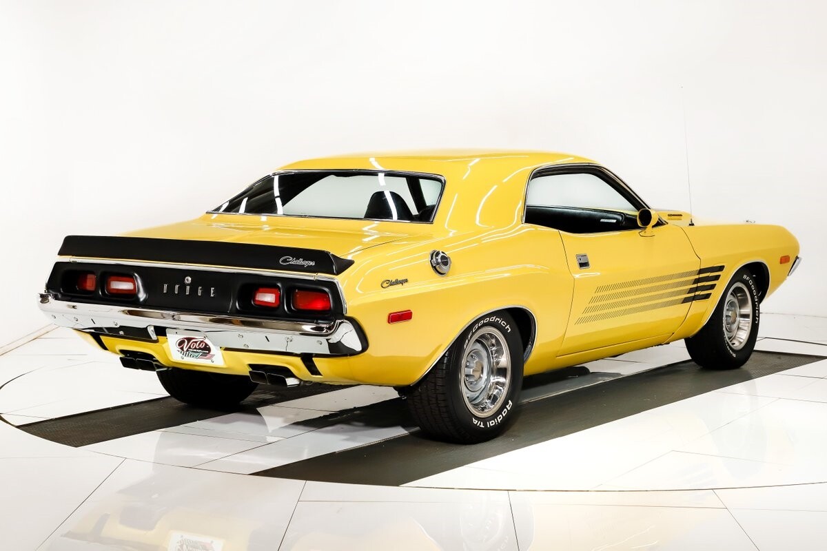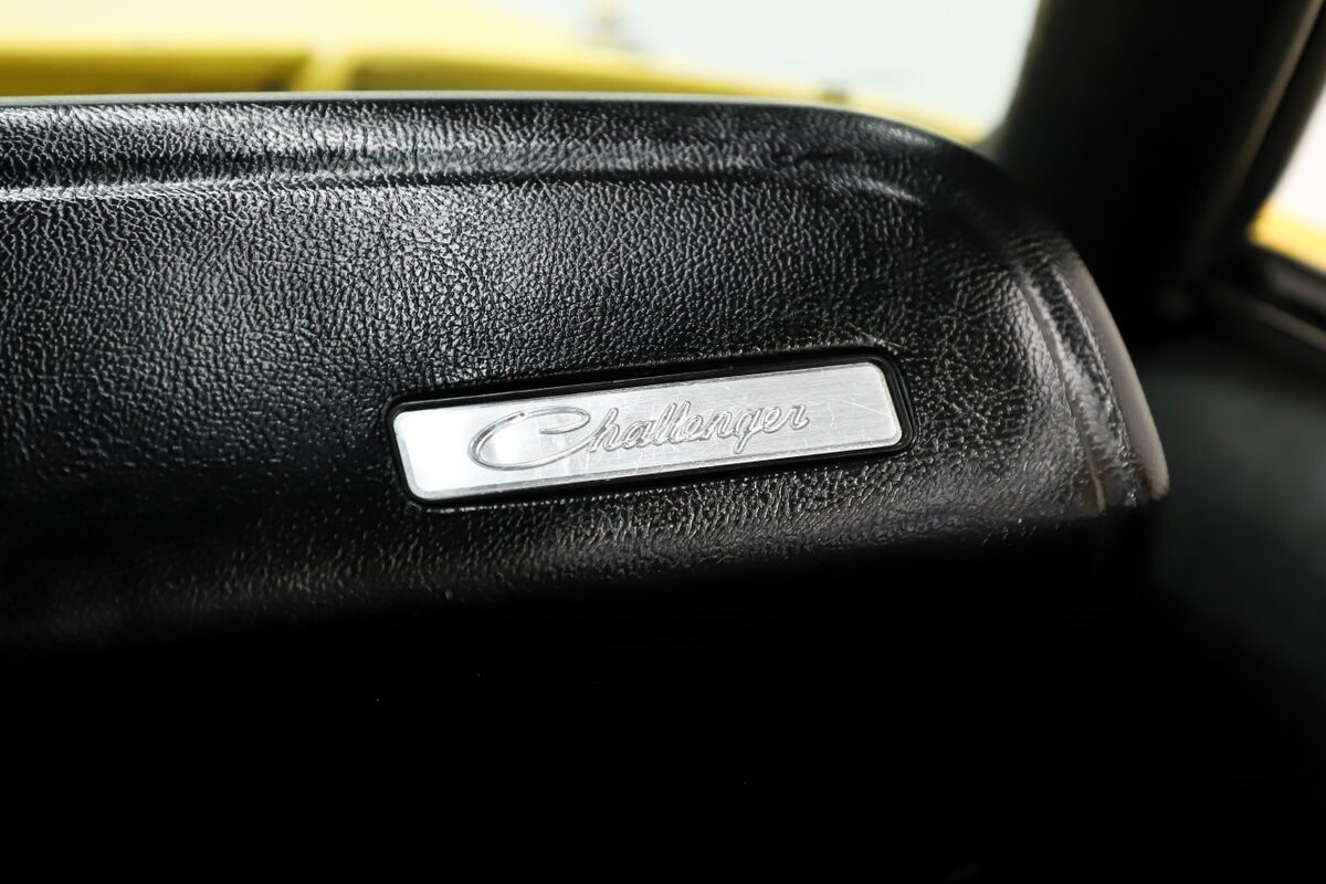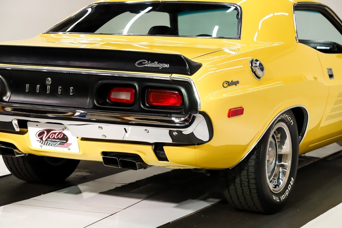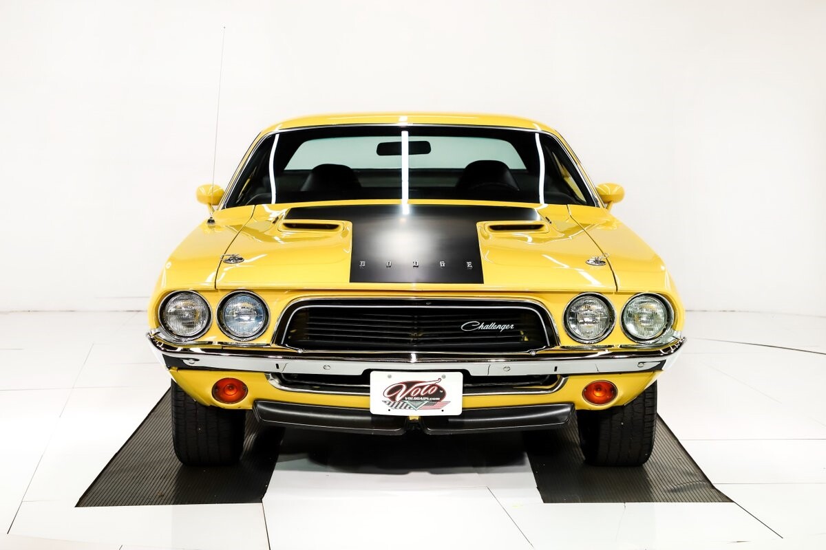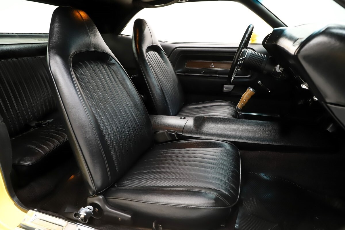 EXTERIOR: This is a great looking car! I love the body lines, colors, and stripes. It's decked out with the power bulge hood with racing pins, rear spoiler, chin spoilers and racing mirrors. The body is clean: straight, fits right, no rust or damage. Beautiful high impact Top Banana Yellow is smooth and glossy, no vinyl top. I love the stripes, especially the strobe strips on the sides. The bumpers are shiny, they left off the ugly bumper guards. All the trim looks great, correct antenna and racing gas cap. The 15 inch Rallye wheels and BFG tires look new.