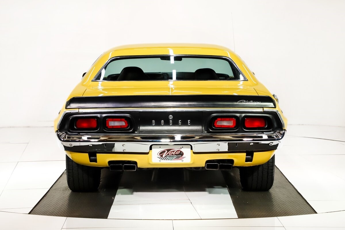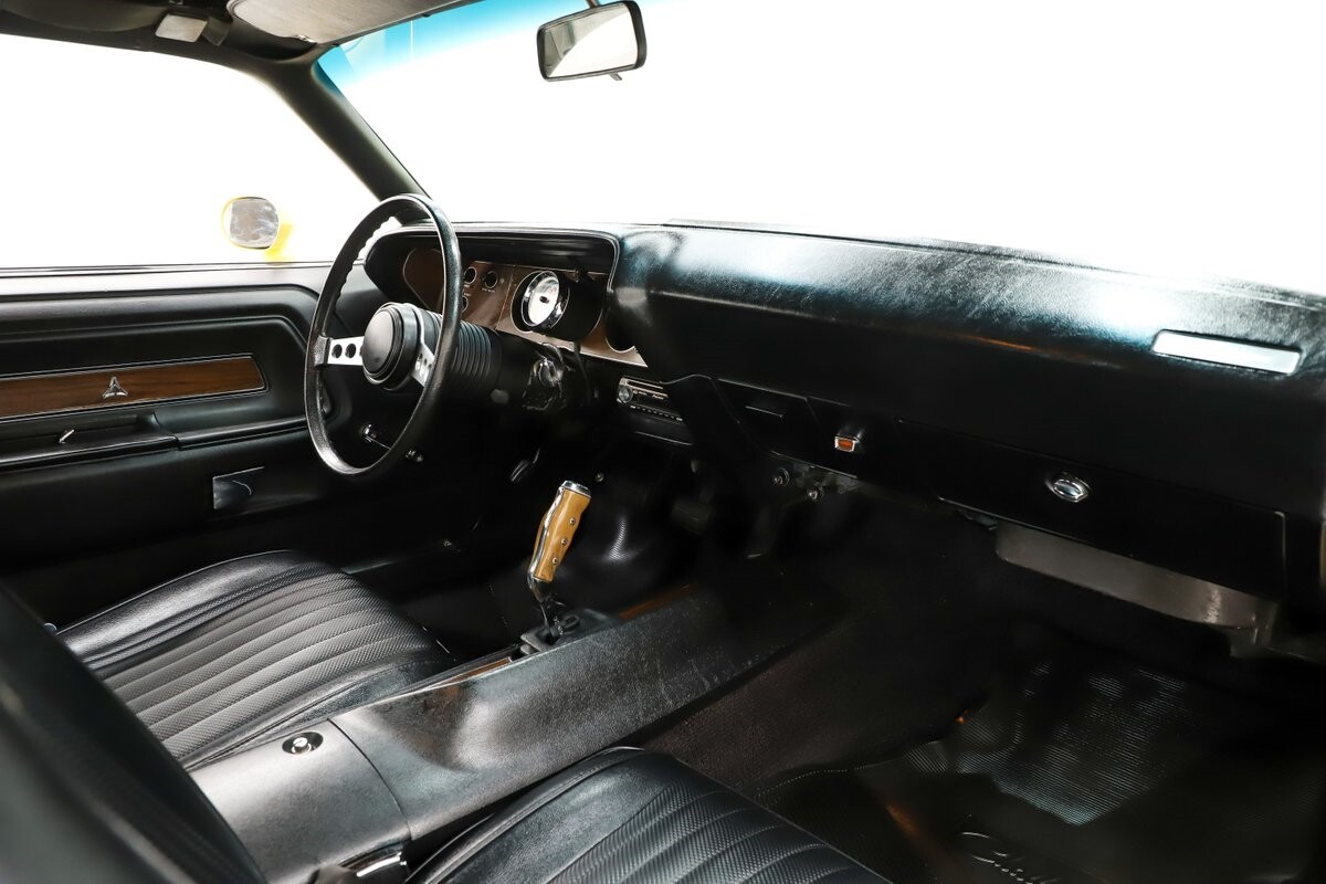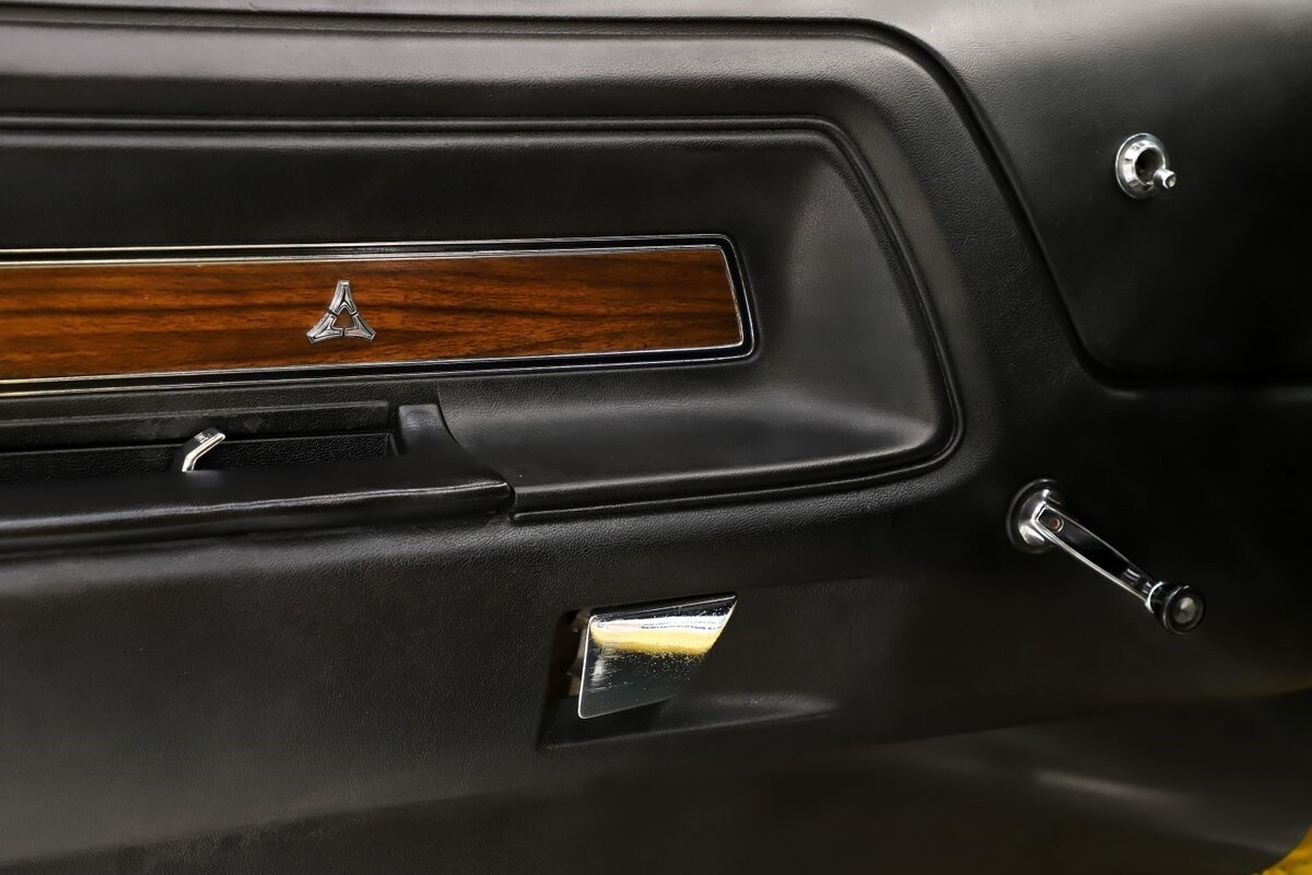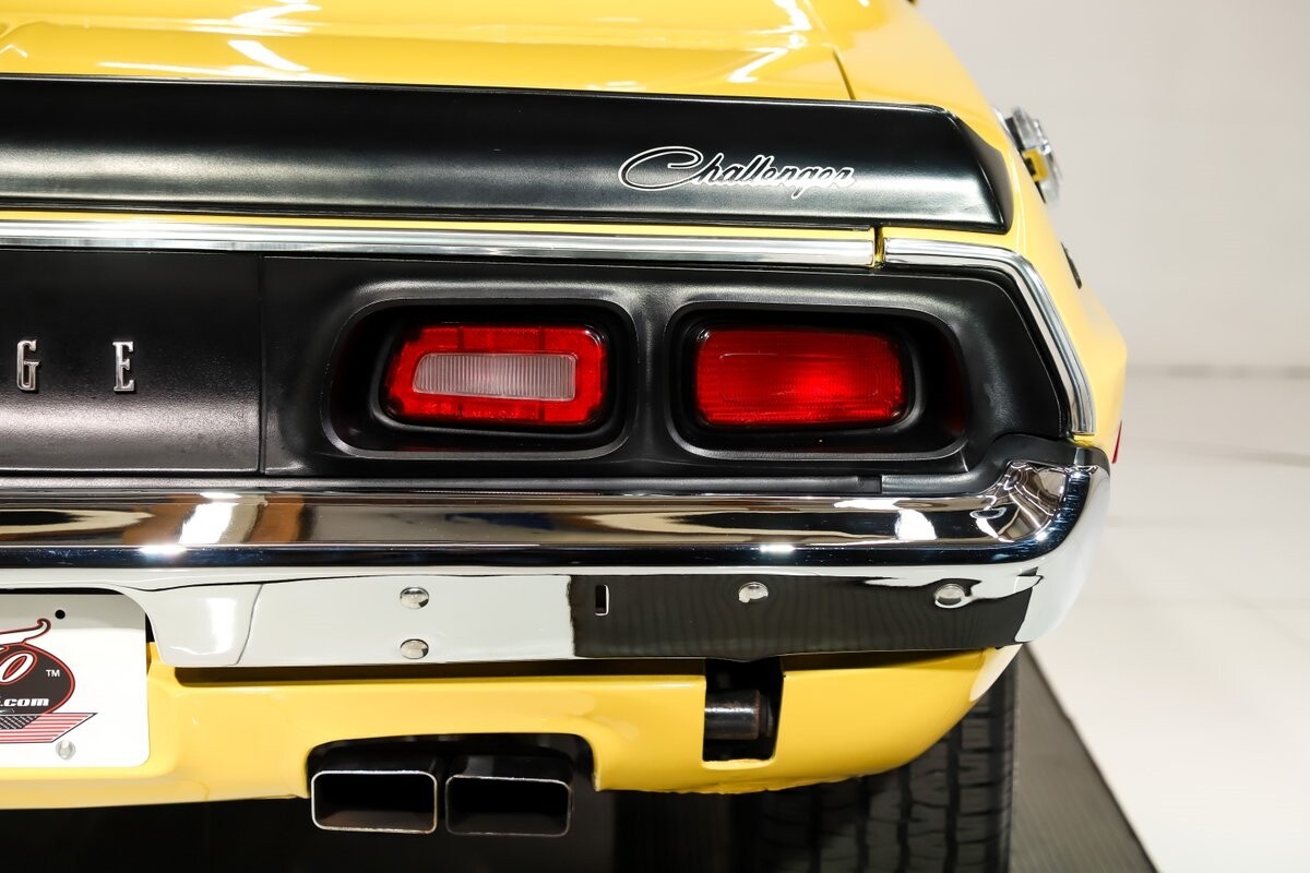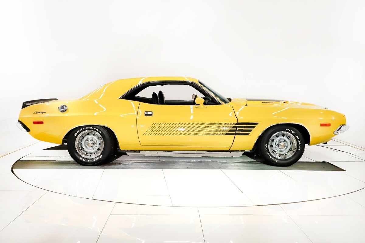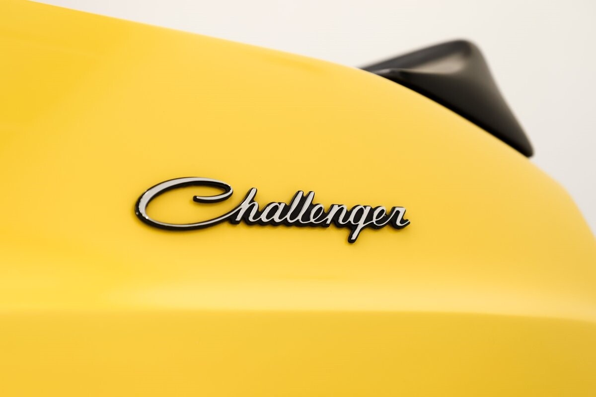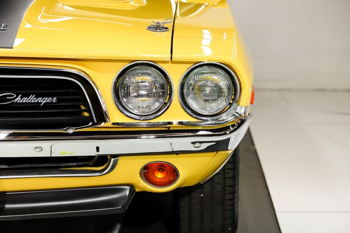 EXTERIOR: This is a great looking car! I love the body lines, colors, and stripes. It's decked out with the power bulge hood with racing pins, rear spoiler, chin spoilers and racing mirrors. The body is clean: straight, fits right, no rust or damage. Beautiful high impact Top Banana Yellow is smooth and glossy, no vinyl top. I love the stripes, especially the strobe strips on the sides. The bumpers are shiny, they left off the ugly bumper guards. All the trim looks great, correct antenna and racing gas cap. The 15 inch Rallye wheels and BFG tires look new.