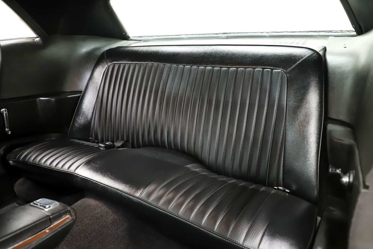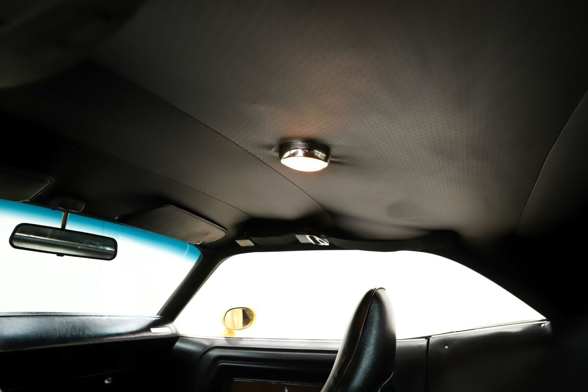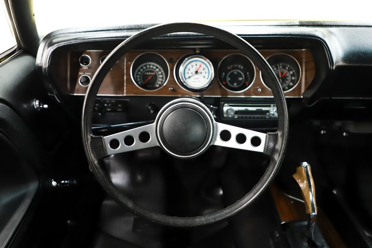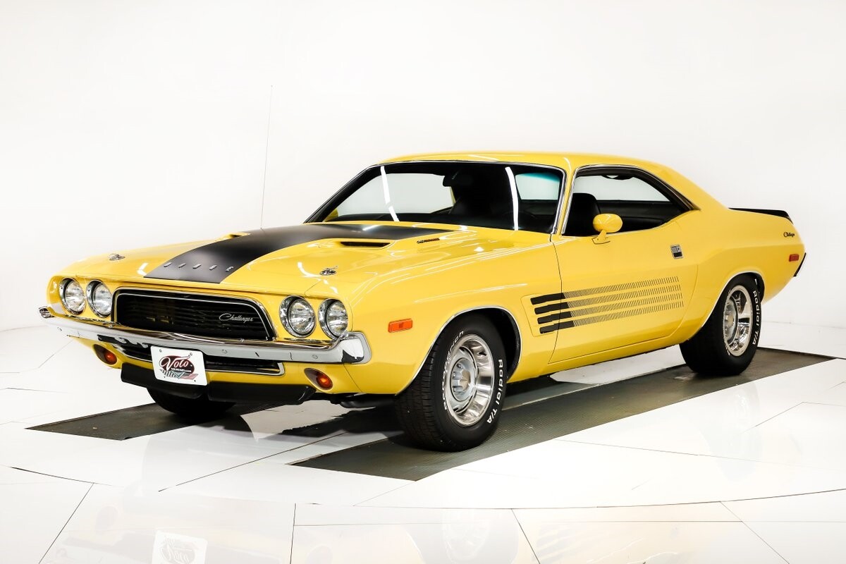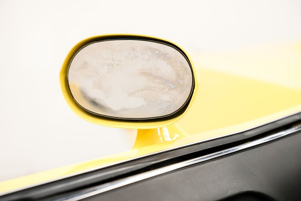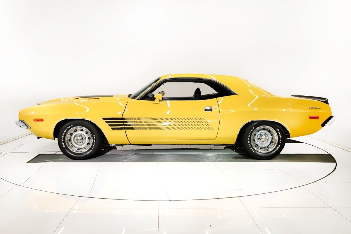 EXTERIOR: This is a great looking car! I love the body lines, colors, and stripes. It's decked out with the power bulge hood with racing pins, rear spoiler, chin spoilers and racing mirrors. The body is clean: straight, fits right, no rust or damage. Beautiful high impact Top Banana Yellow is smooth and glossy, no vinyl top. I love the stripes, especially the strobe strips on the sides. The bumpers are shiny, they left off the ugly bumper guards. All the trim looks great, correct antenna and racing gas cap. The 15 inch Rallye wheels and BFG tires look new.