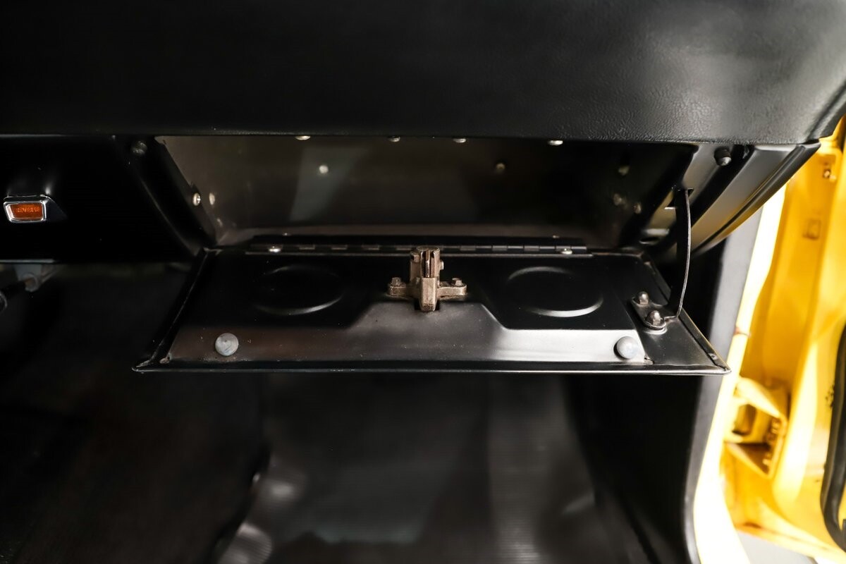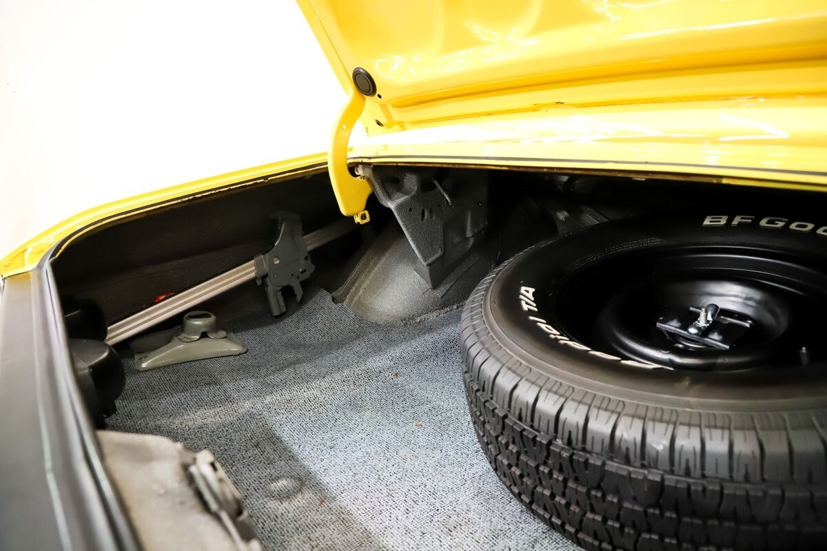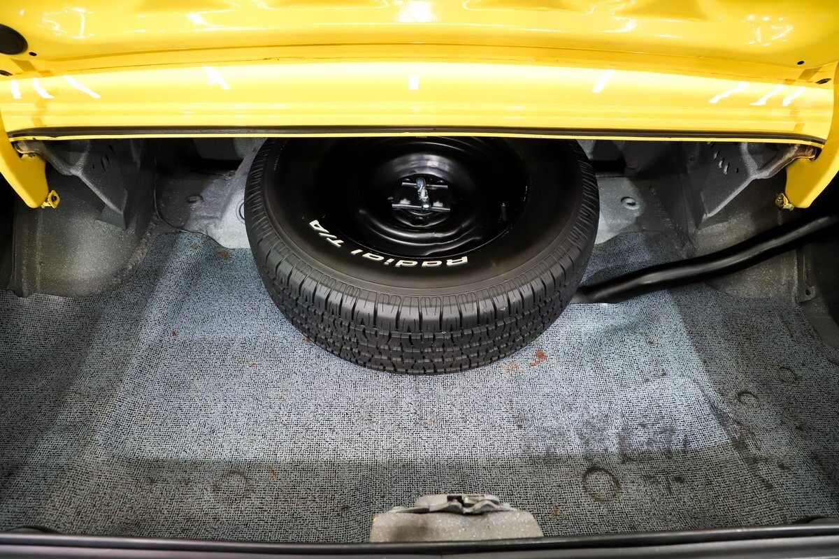 TRUNK COMPARTMENT: It is real nice looking and it's complete. The yellow paint is glossy under the trunk lid and the jamb. Inside is a gray spatter finish on solid metal. It has a BFG tire and a painted rim for a spare, the jack assembly is properly installed.