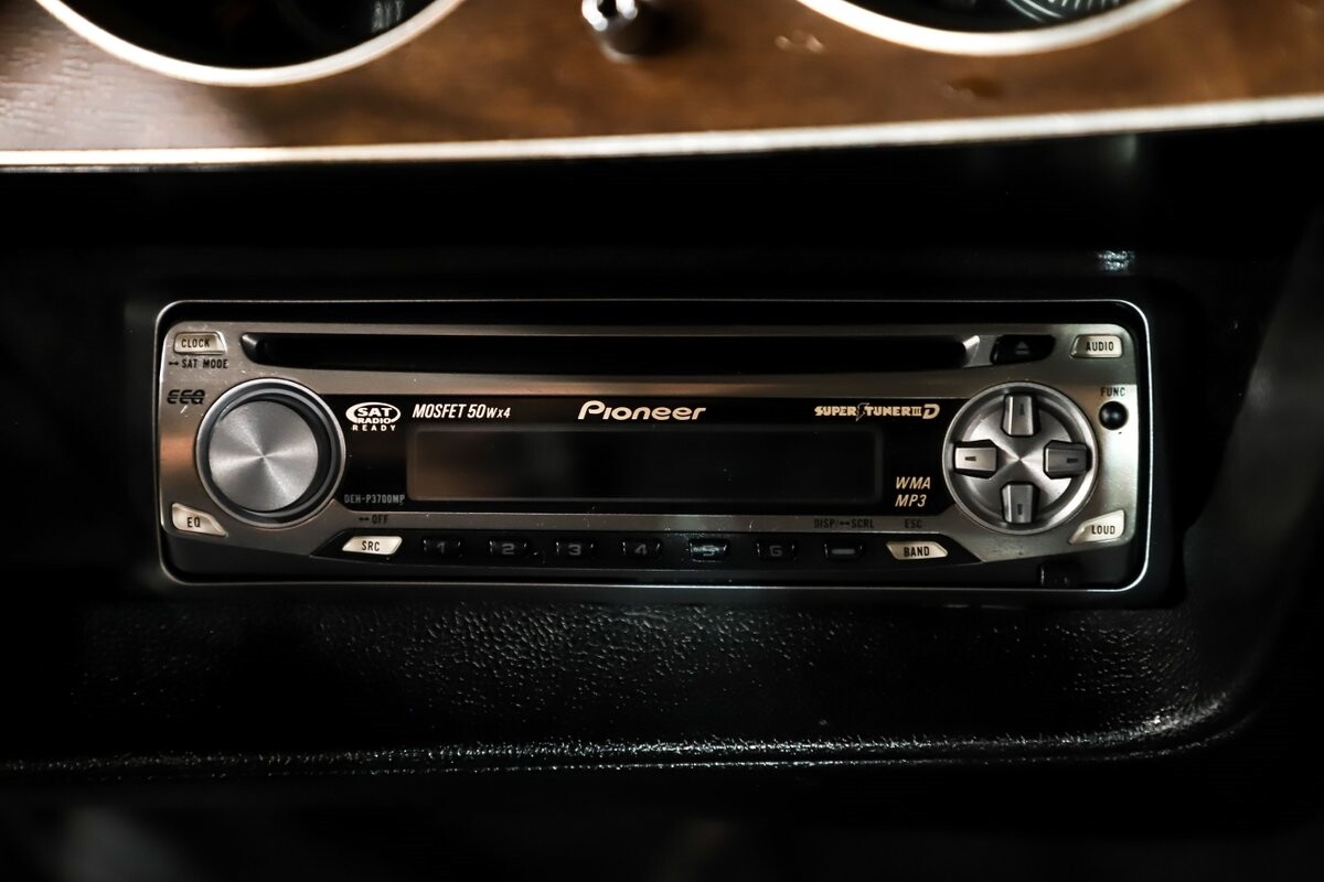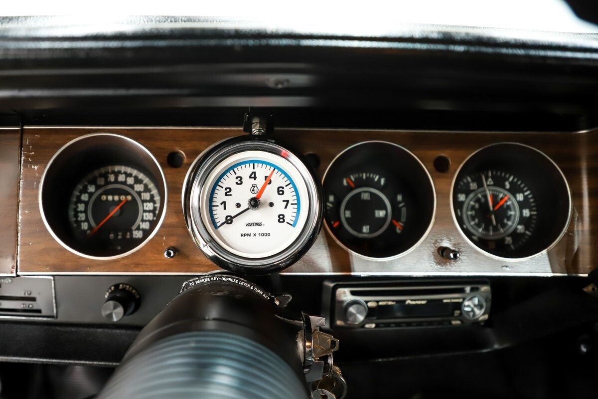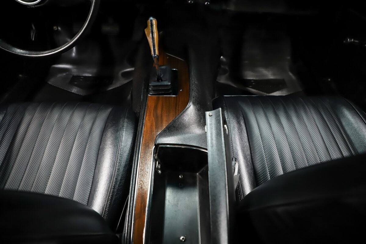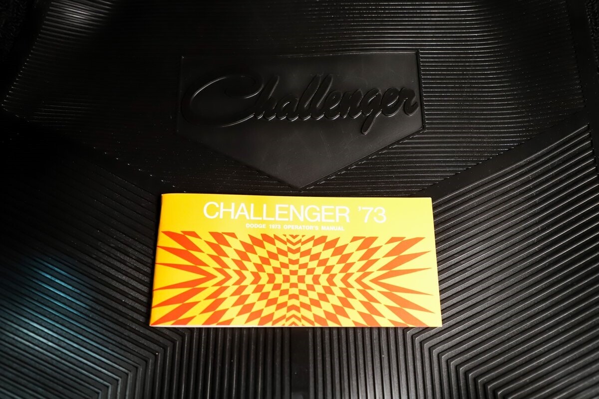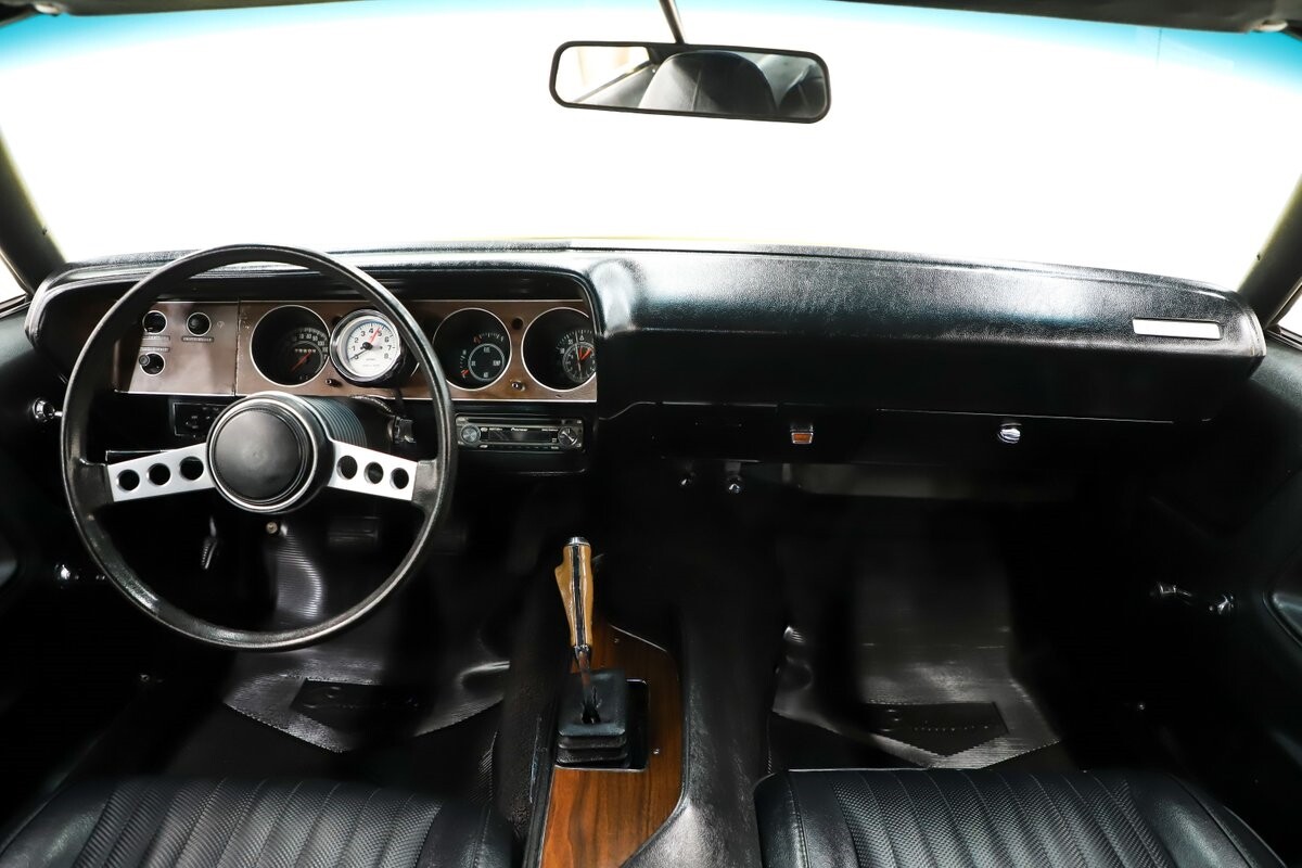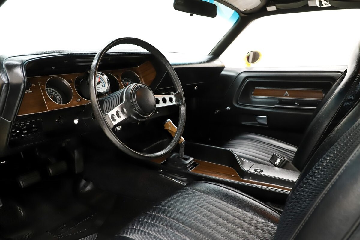 INTERIOR: I'm sitting in the car and it's very impressive everywhere I look. In front of me is a real nice dash pad, it has Rallye gauges, the clock is even working. There's a pioneer CD stereo and an aftermarket tachometer. Down on the floor the carpet is really nice, new Challenger floor mats. The center console is in excellent shape and the best part is the pistol grip shifter sticking out of it. The seats have been reupholstered front and back. The side panels are in excellent shape. The headliner looks new.