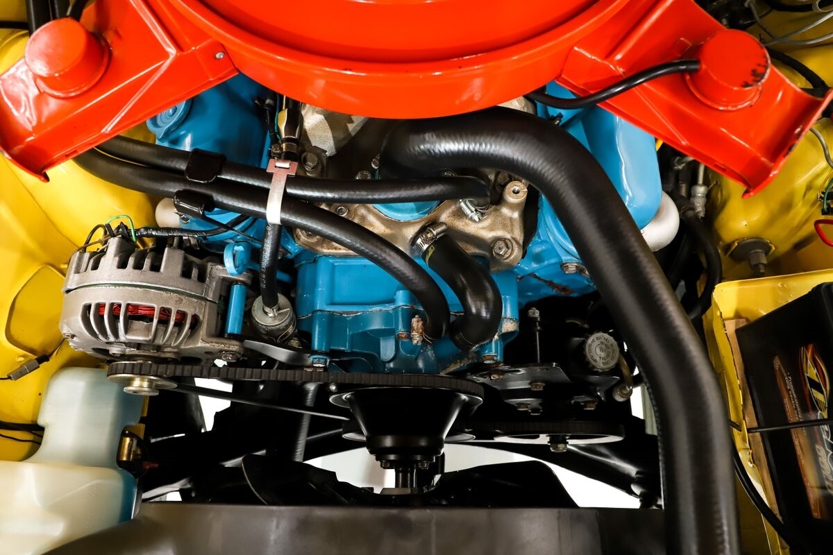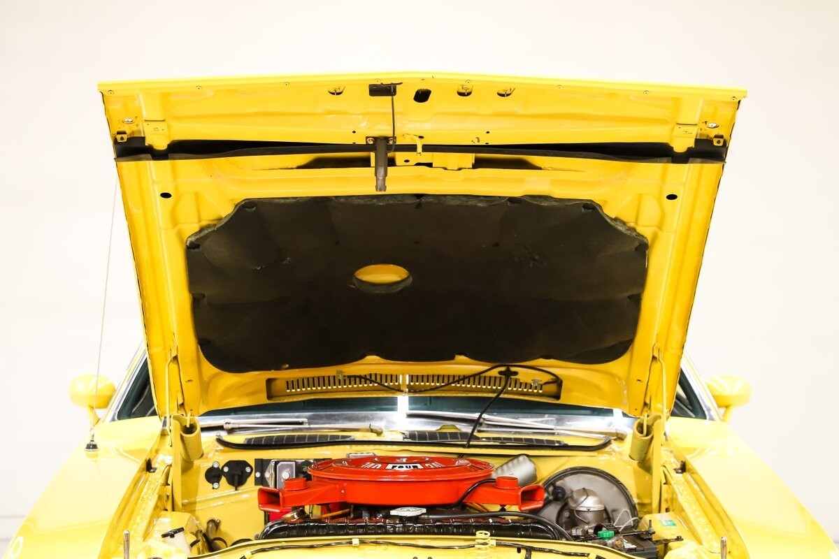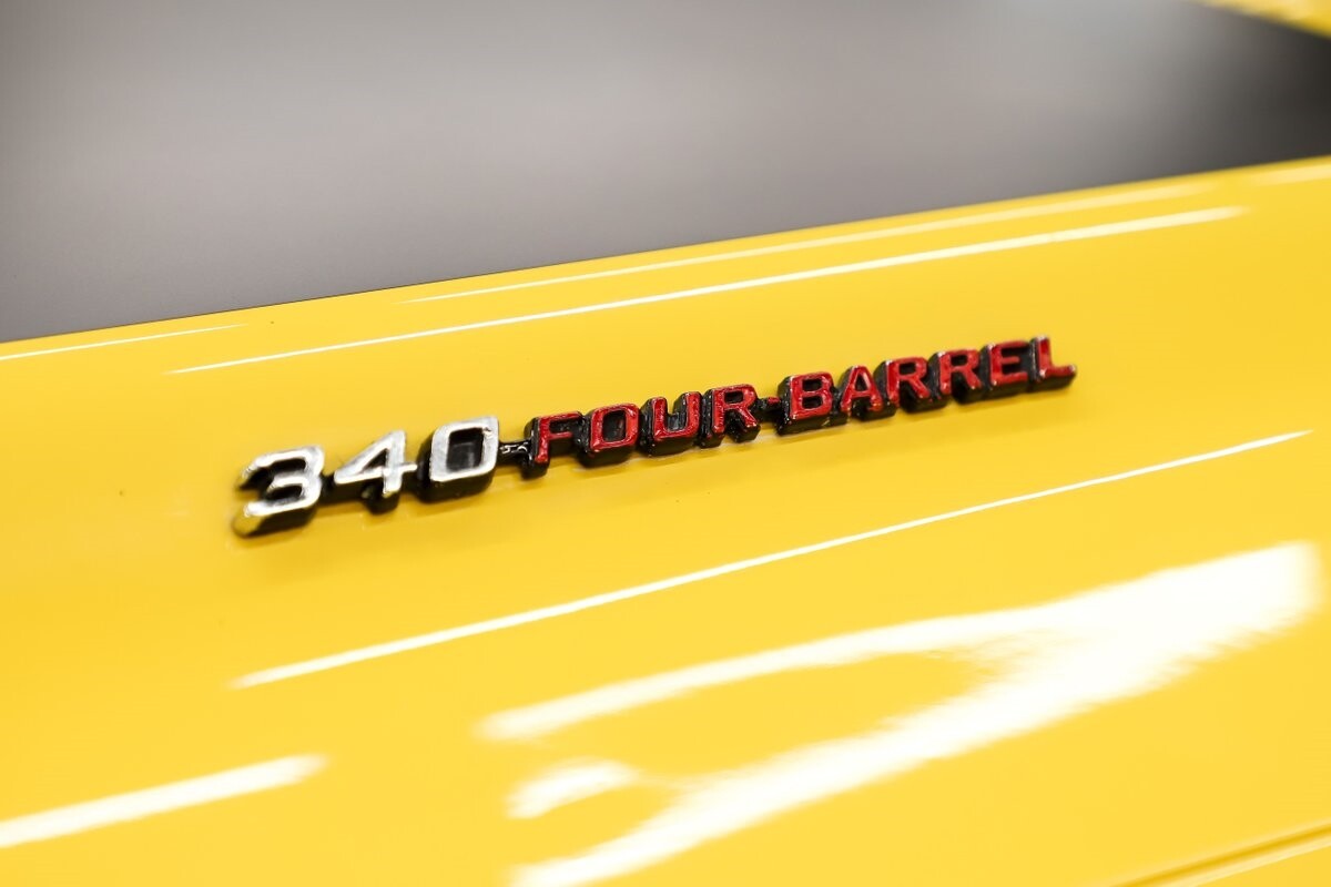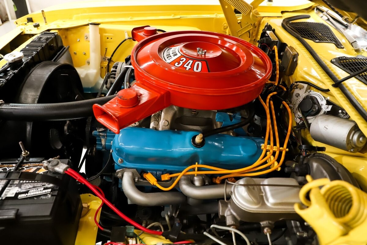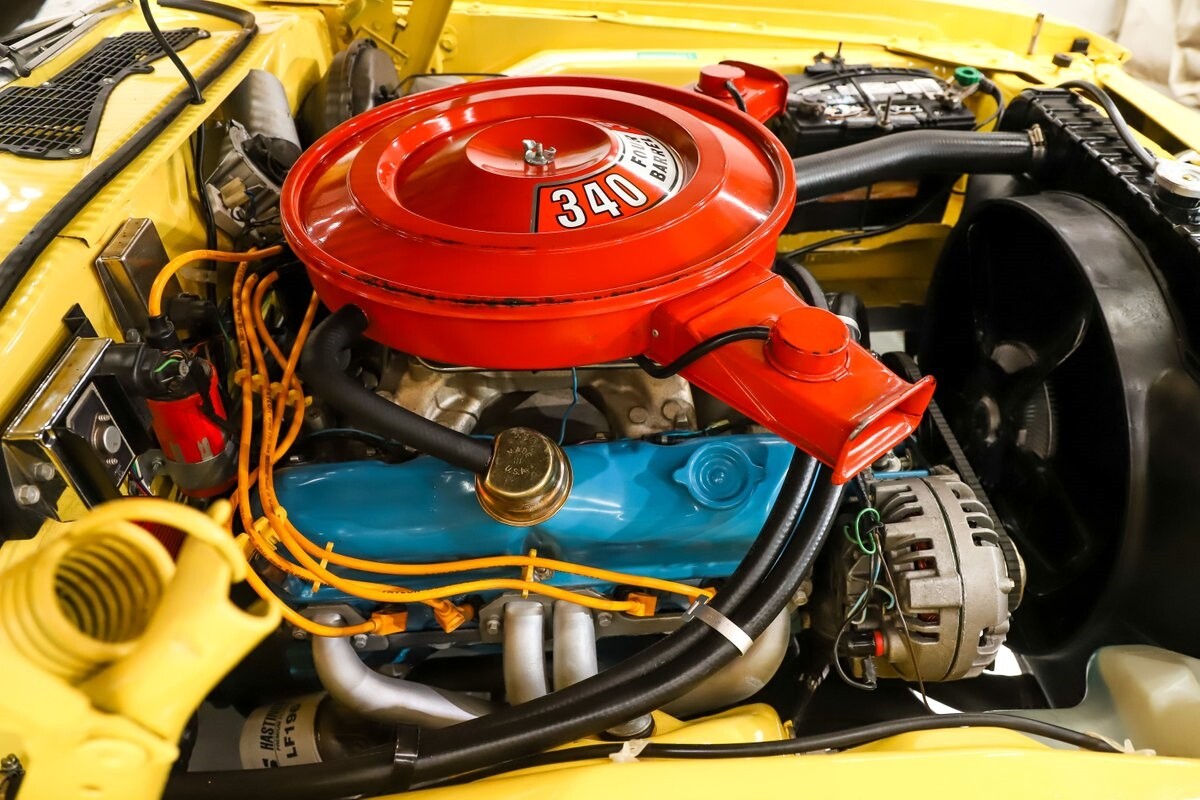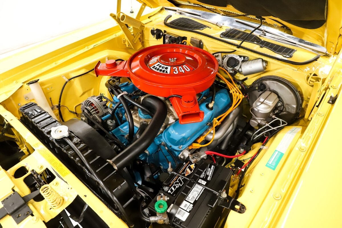 ENGINE COMPARTMENT: Open the hood and you'll see a beautiful engine compartment. At the heart of it is the VIN # matching, date code correct 340 high performance motor. This one's been juiced up a bit more when it was rebuilt with a hotter cam, Edelbrock intake, dual feed Holley carb, electronic ignition, and a set of headers. It is dressed up with the stock air cleaner and valve covers. It features power steering and power brakes. The components look new. The radiator looks clean: has a shroud, new clutch fan and an overflow bottle. The battery is bolted down and has a shut off switch. The engine bay is all clean metal painted gloss yellow, it has hood insulation. The VIN number on the core support and the cowl match the car.