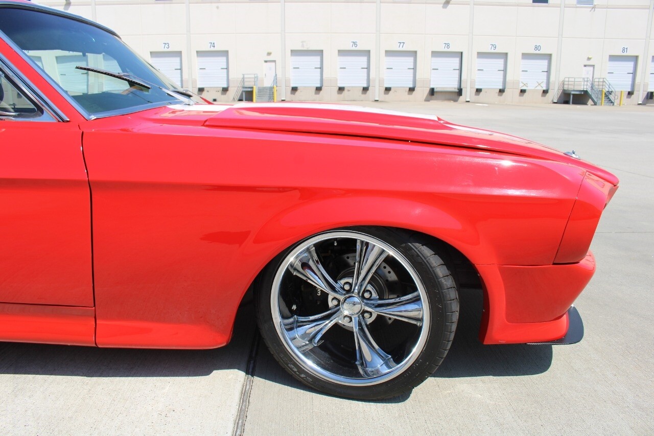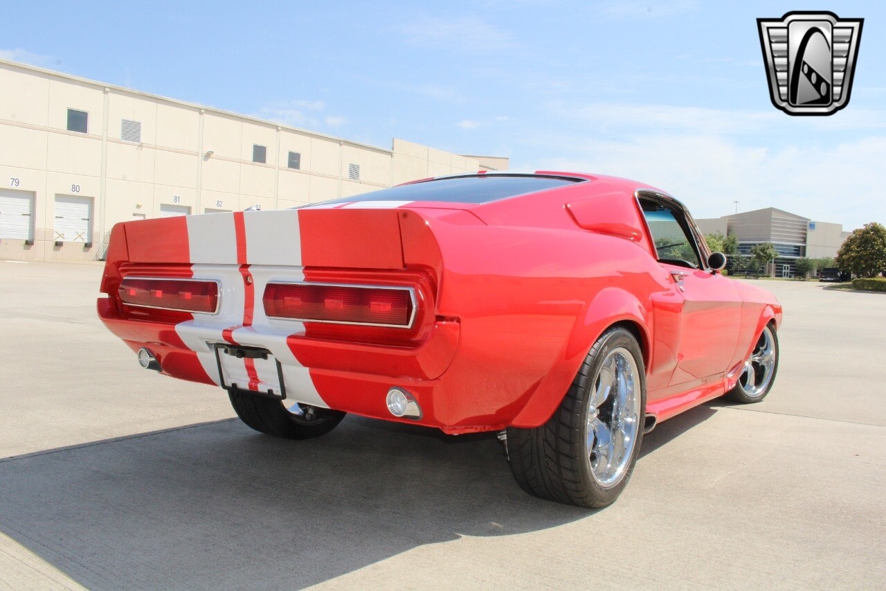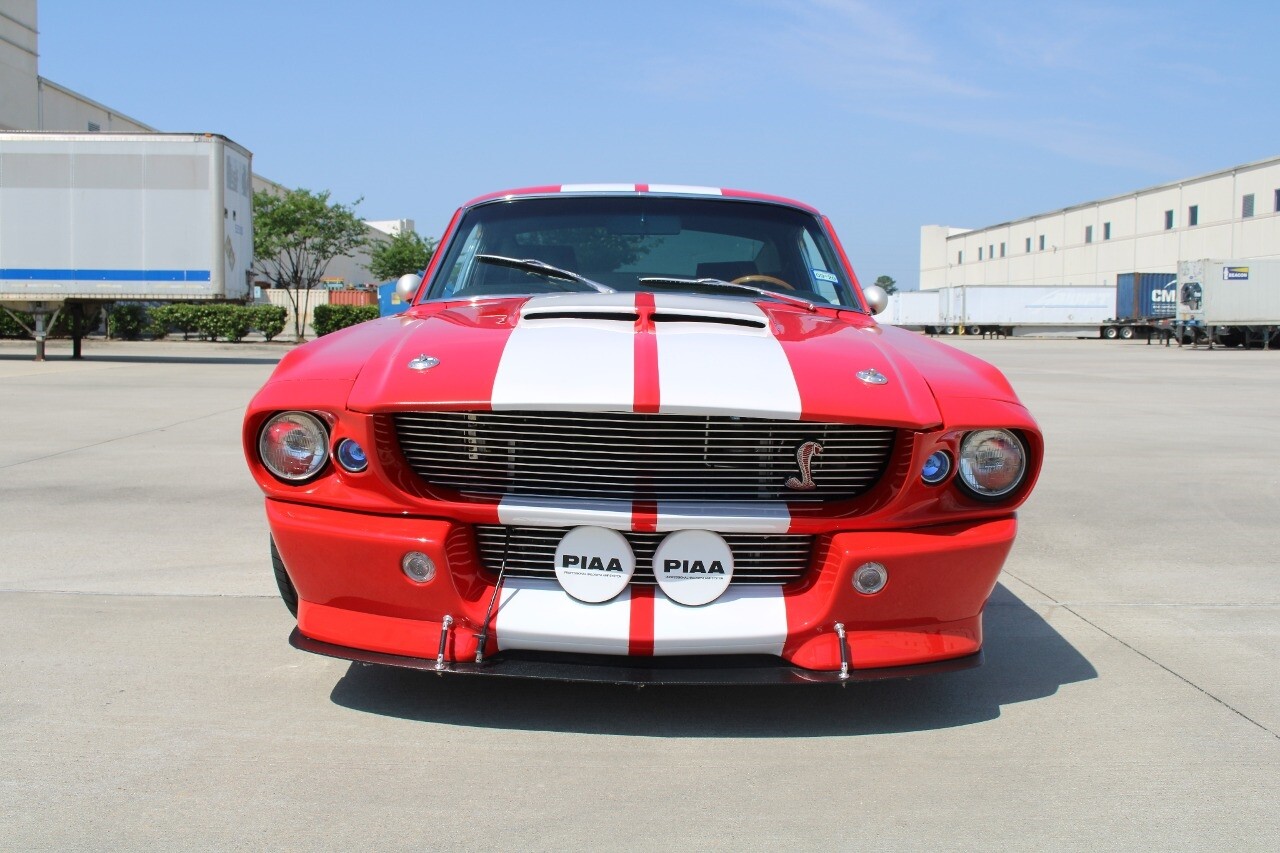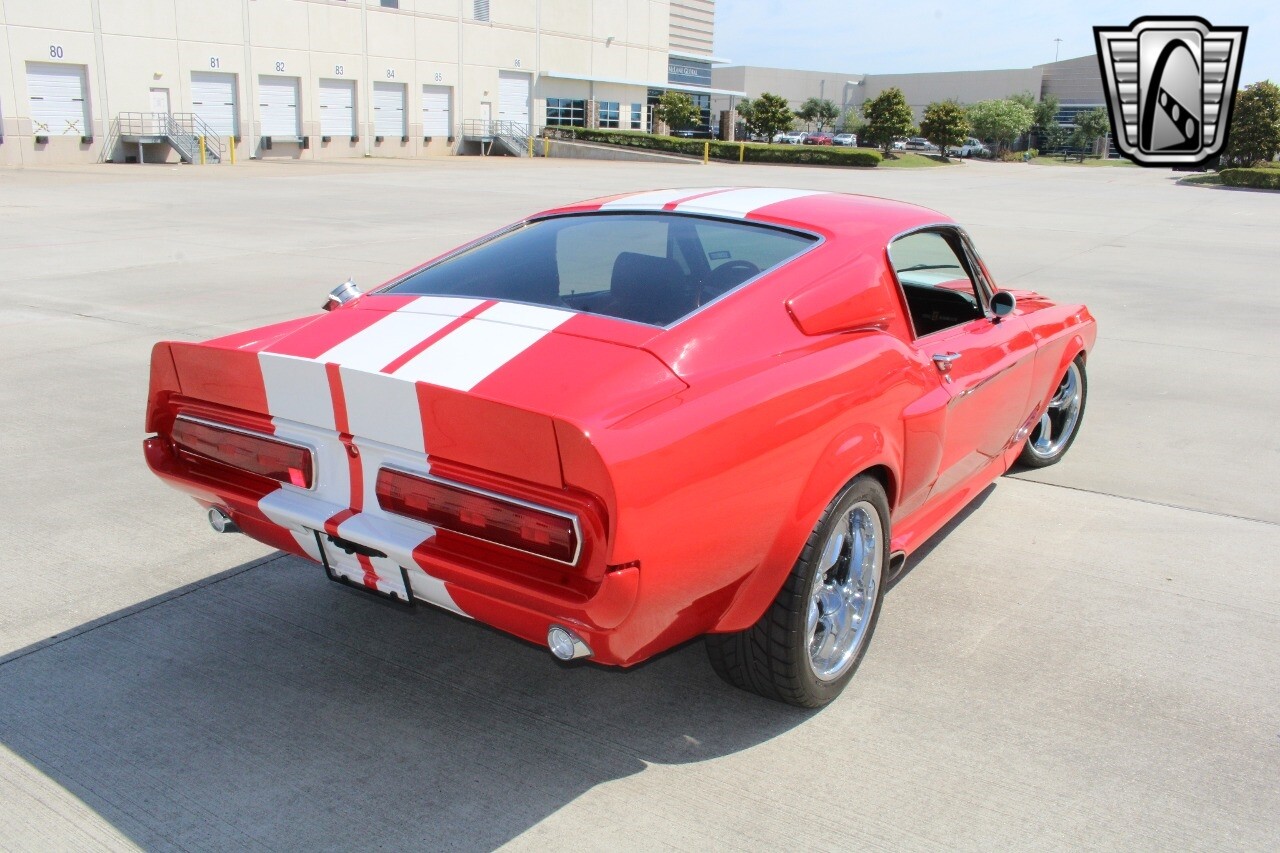 Gateway Classic Cars Houston showroom is thrilled to have one of the baddest Eleanor-style 1967 Mustang fastbacks that we've hosted (or seen, for that matter). Just seeing that carbon fiber front splitter and red Cobra emblem in the grille should tell you that this car has performance to back up its looks. This snarling beast has been treated to a gorgeous red Dupon Nason basecoat/clearcoat finish, and the white racing stripes really add some visual pop. This is one '67 Fastback that just cannot go unnoticed - whether it's parked, or on the open road, it draws attention...so if you're prone to spirited driving, you might become acquainted with another name for this red: "Arrest Me Red"! This is NOT a car for the faint hearted or those that prefer stealth. Powered by a FiTech fuel injected, stroked 351 CID V8 (that was putting out 430HP/450 lb/ft torque before the injection was added), the aluminum-headed beast will quickly remind you why it has 4-point racing harnesses at all four seating positions. A The beefy 351 sends its spent fossils through a set of coated Hedman headers into its dual exhaust, which has stainless steel mufflers and that sweet side exit. Backing the potent mill is a Tremec World Class T5 5-speed manual transmission, which sends the grunt out back via a custom aluminum driveshaft to the upgraded Ford 9-inch rear end that's filled with a set of 3.73:1 gears and a limited slip differential; so this baby can both launch hard and still cruise at reasonable RPM on the highway. And speaking of the highway - this beauty is equipped with a giant custom fuel cell, so you should get plenty of miles between stops. If you want to go off-highway and on-track, this Eleanor has the tires, wheels, suspension, steering, and brakes to help you stay ahead of the pack. Nitto NT555 high performance radials (P235/40R18 up front, P275/40/ZR18 out back) wrap the polished, lightweight Boss wheels, urethane suspension bushings, a beefy front sway bar, tubular control arms, fully adjustable coilover shocks (at all 4 corners), a fully adjustable Heidts 4-link rear suspension, heavy duty full length subframe connectors, massive drilled rotors all around, multi-piston Wilwood brake calipers, and Mustang II steering combine to give drivers confidence that this steed can be ridden hard, clipping those apexes every time. Inside, the the driver will find that the beefy billet Hurst pistol grip shifter falls easily to hand. The black synthetic leather seating is comfortable, and the Scat Pro buckets up front, along with the 4-point harnesses, keep the driver held securely in place during hard driving. A tilt steering column supports the fat wood-rimmed billet aluminum steering wheel, and a full set of AutoMeter Phantom gauges keep the driver always informed; while the air conditioning and Memphis Audio-powered sound system (with its massive subwoofers) keeps occupants cool and entertained at the same time. A giant Alpine touch screen control unit provides visual from the backup camera, along with GPS and satellite radio capability. This is one very well thought out build, and likely won't last long: many of these Eleanor style fastbacks are selling for nearly twice the price, so don't let someone else beat you to it!.