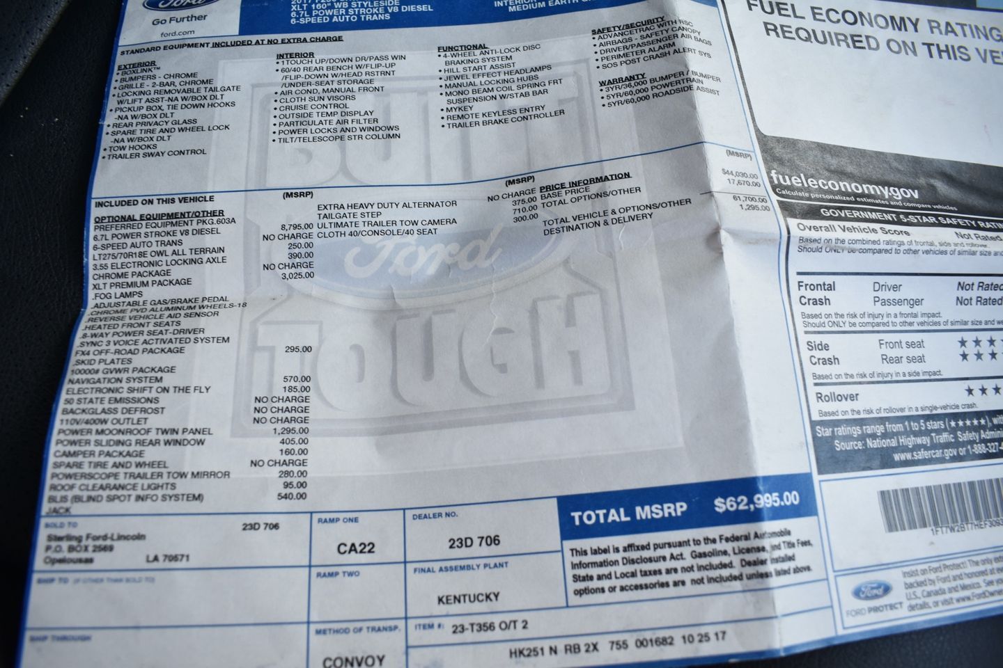 You are looking at a 2017 Ford F-250 Crew Cab XLT FX4 . It is powered with a 6.7L Powerstroke Diesel V-8 and automatic transmission. It is equipped with tilt, cruise, power drivers seat,power windows, power sunroof, power locks, power mirrors, factory navigation with am/fm radio, retractable gooseneck hitch,and receiver hitch. Also included are the owner's manuals and one keyless remote.