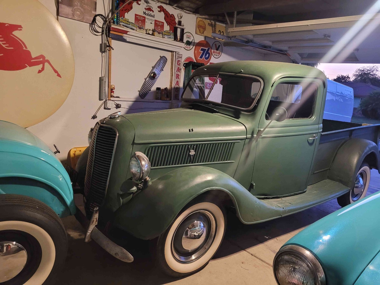 Ready to drive ford pickup rare one year model with 283 chevy v8, with automatic turbo 350 transmission, with a new bob drake gas tank, power front disk brakes,new dual master cylinder from mechanical to hydraulic breakes, re-core radiator, new hoses, coil, alternator and starter,newer rear shocks, new fuel electric fuel pump, rebuilt 1937 rear end with 3.54 gears all new bearings and seals. 1940 ford brakes, split front and rear wish bones. New original style headliner and door panels Reupholster seat with carpet. With original 1937 California license plates tags up to date with clean title.truck sold as is Remember it's a 87 year old truckSeller's Notes