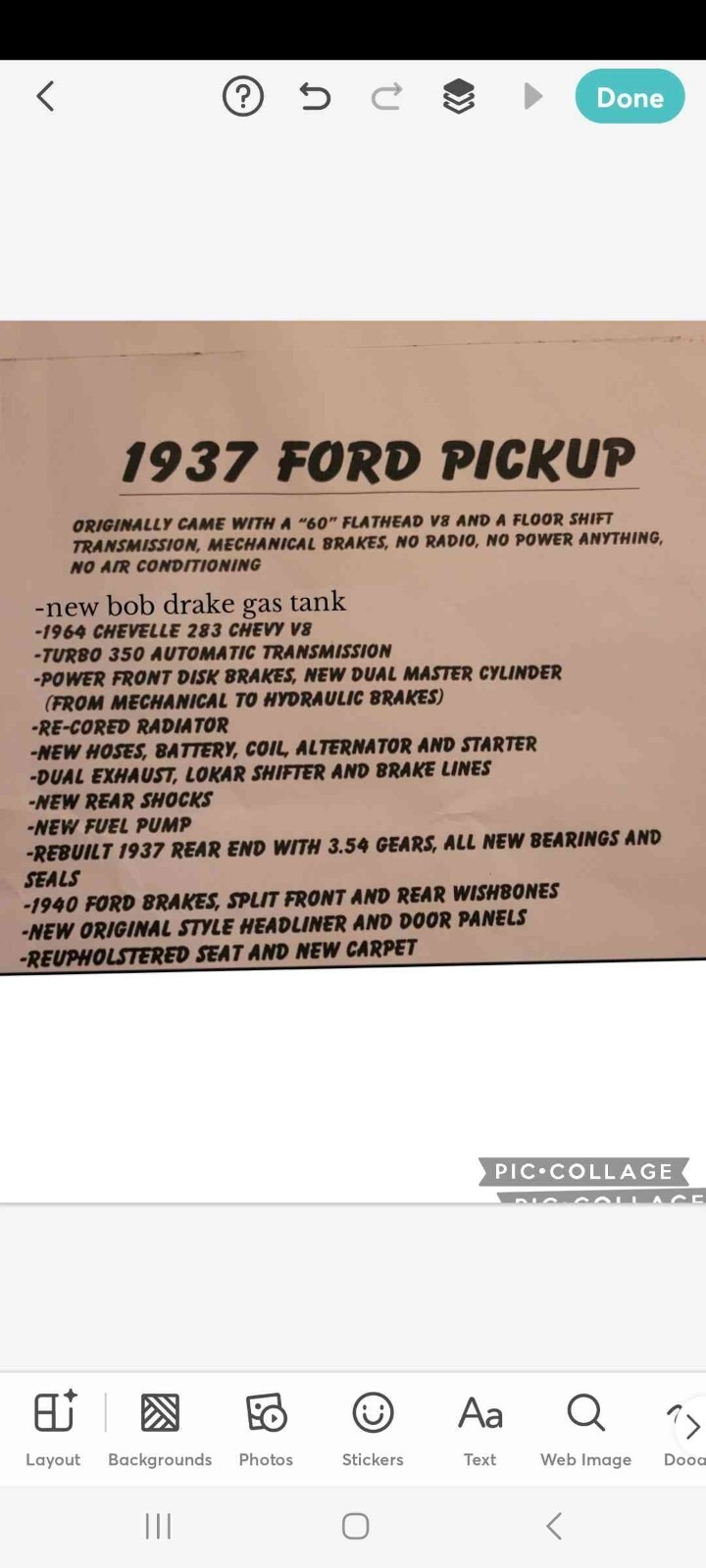 Ready to drive ford pickup rare one year model with 283 chevy v8, with automatic turbo 350 transmission, with a new bob drake gas tank, power front disk brakes,new dual master cylinder from mechanical to hydraulic breakes, re-core radiator, new hoses, coil, alternator and starter,newer rear shocks, new fuel electric fuel pump, rebuilt 1937 rear end with 3.54 gears all new bearings and seals. 1940 ford brakes, split front and rear wish bones.