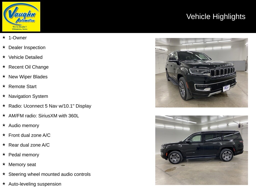 1-Owner, Dealer Inspection, Vehicle Detailed, Recent Oil Change, New Wiper Blades, Remote Start, 3.0L I6, 8-Speed Automatic, 4WD, Diamond Black Crystal Pearlcoat, Global Black w/Leather Trimmed Bucket Seats, 7-Passenger Seating, AM/FM radio: SiriusXM with 360L, Audio memory, Auto-leveling suspension, Electronic Stability Control, Emergency communication system: Automatic SOS Call, Exterior Parking Camera Rear, Front dual zone A/C, Front fog lights, Fully automatic headlights, Garage door transmitter, Heated Front Seats, Heated steering wheel, Memory seat, Navigation System, Pedal memory, Power Liftgate, Radio: Uconnect 5 Nav w/10.1 Display, Rain sensing wipers, Rear dual zone A/C, Reclining 3rd row seat, Security system, Speed-Sensitive Wipers, Steering wheel mounted audio controls, Traction control, Ventilated front seats. 3.0L I6 Diamond Black Crystal Pearlcoat 2023 Jeep Wagoneer Series II Priced below KBB Fair Purchase Price! Odometer is 1289 miles below market average!