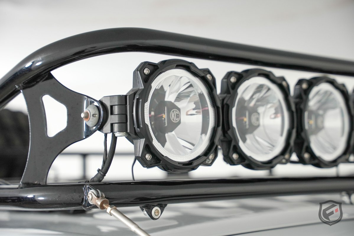 Custom 1/8 chromoly side step/rock slides, powder-coated 6061 aluminum fenders, and a 1/8 chromoly spare tire carrier/roll bar with daytime running lights. The fully powder-coated mandrel-bent chromoly roof rack features a KC light bar, side spotlights, daytime running lights, and limb risers for added functionality.