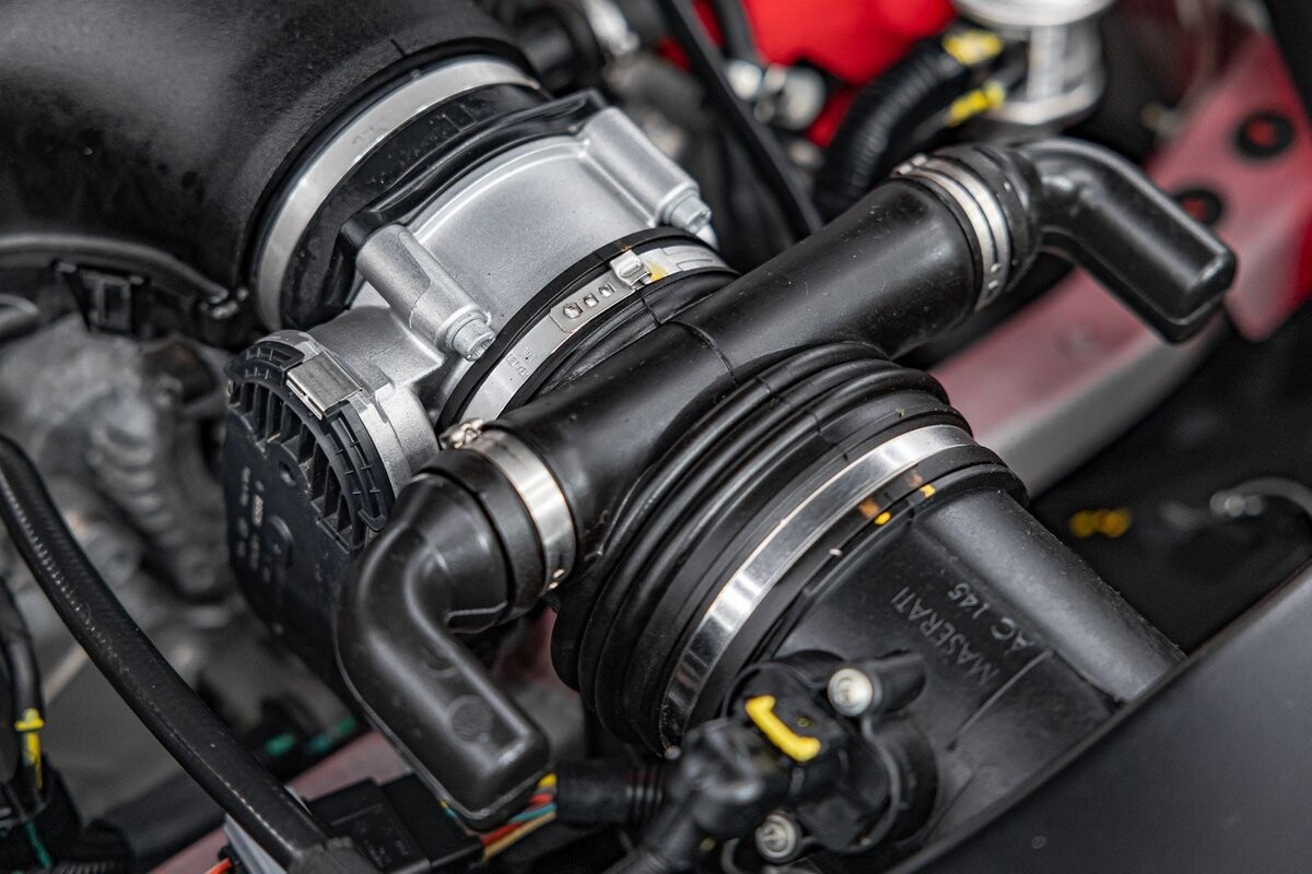 ENGINE COMPARTMENT: Under the hood you'll find the incredible 4.7L 454HP V8 that is also shared with the Ferrari 458. The center piece is a very large intake embedded with the trident Maserati logo. The engine bay is clean with no rust or corrosion. The car lived in Florida for most of its life!