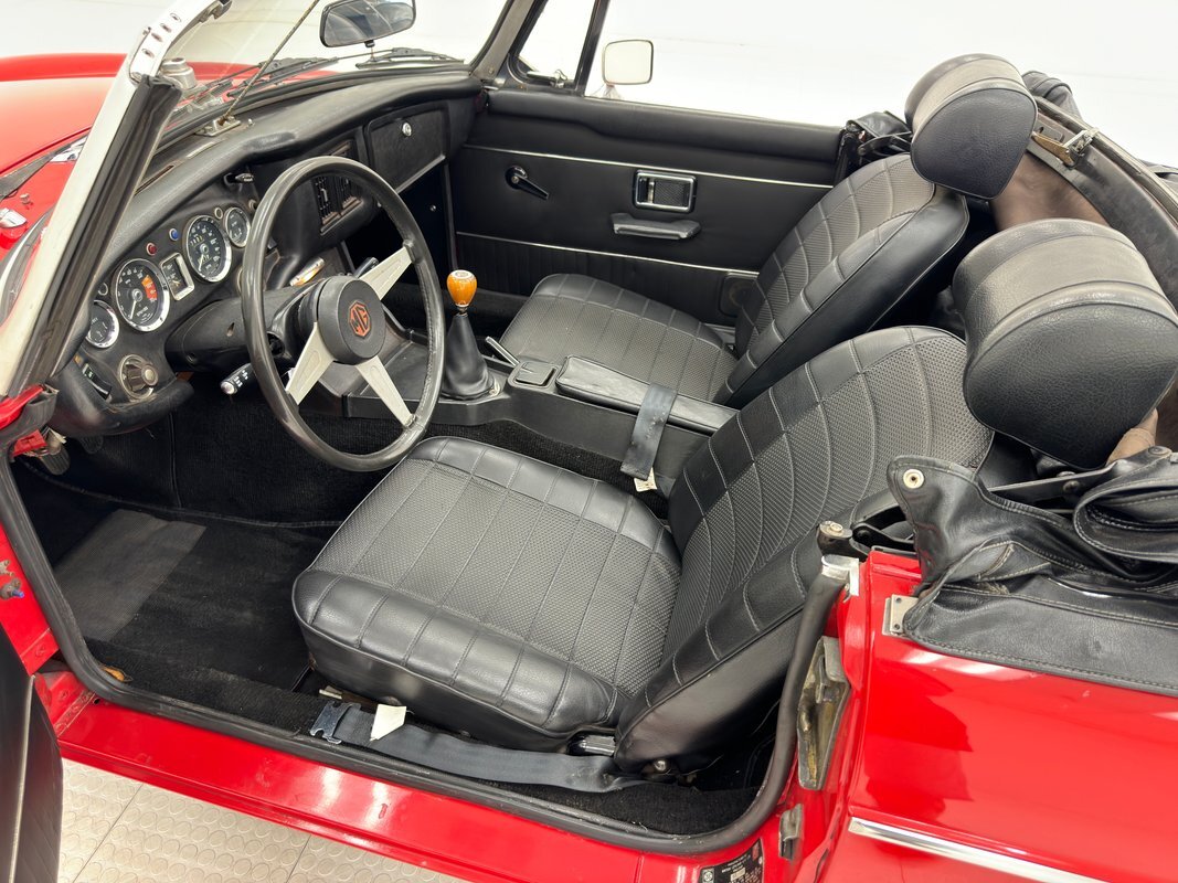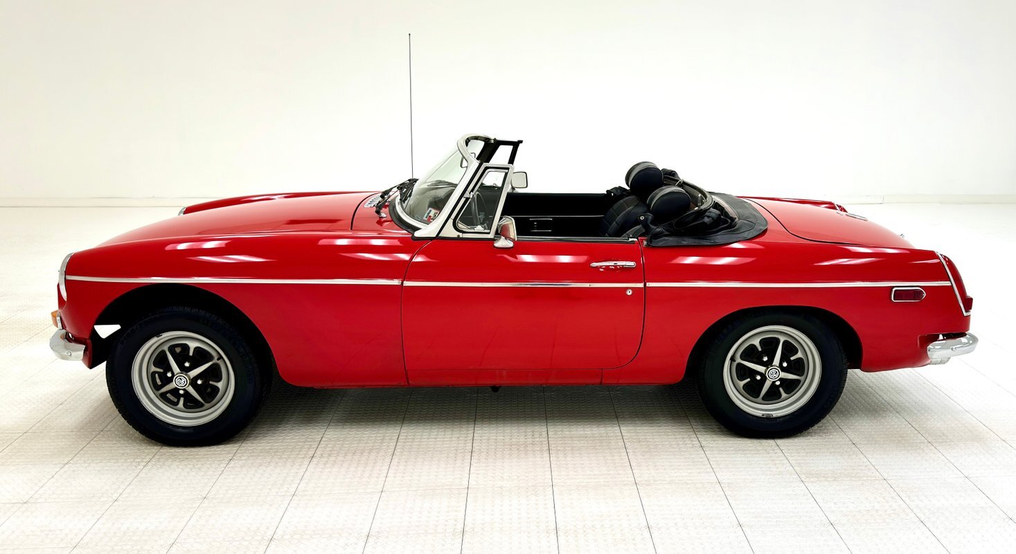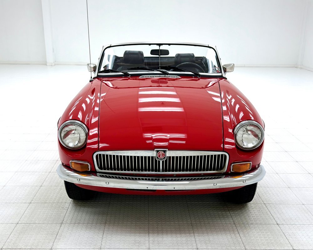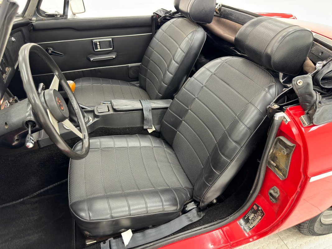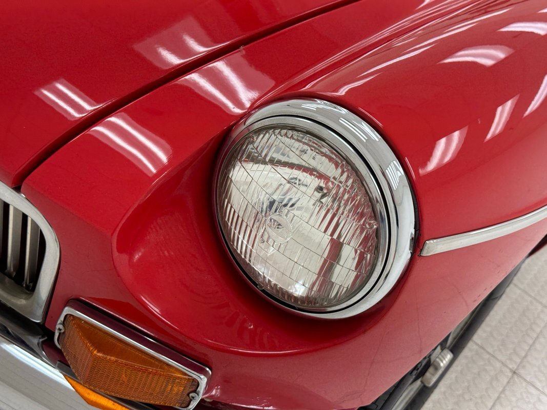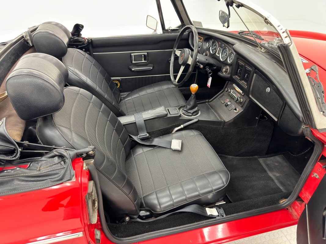 Small cars with red paint make them more visible. Fact. This one is coated in Bright Red and wears a cheeky little grin with its single headlights and vertically stacked grille, fronted by a straight chrome bumper that wraps around its flanks and lacks the overriders introduced in 1974 as part of U.S. regulations, later to be replaced with rubber bumpers. A body trim detail intersects the entire side of the car and a robust polished frame surrounds the windshield. The rear view is pure sports car with wide split vertical taillights and a twin tipped exhaust pipe, both accompanied by a contouring rear bumper that also folds into the sides. This is a diminutive car with great profile proportions, not too long in the front, not too short in the back, and the 14-inch MG wheels are right at home. Our consignor states the vinyl top is newer and it is in good condition. Overall the paint and bright work is good, with imperfections noted that include some chipped paint on lower panels and other places, running paint, spider cracks, major chipped paint and surface rust on the chin sill line, and cracking lines.