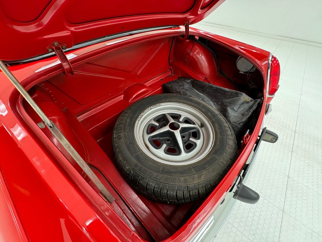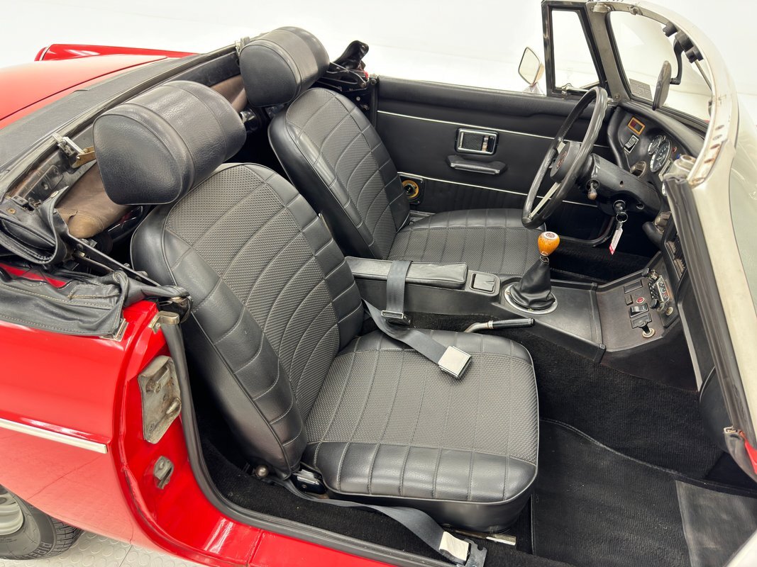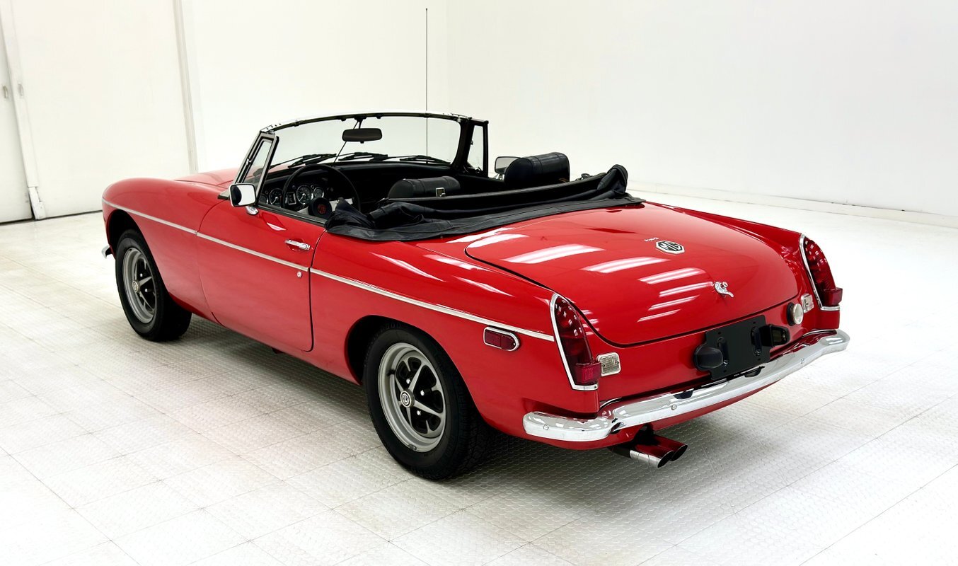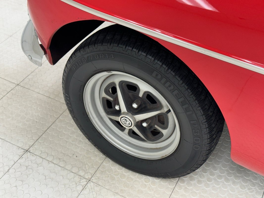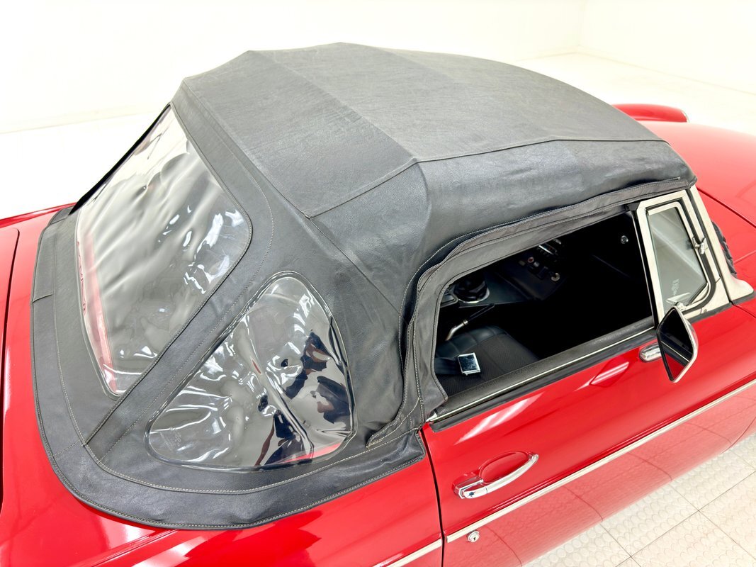 Small cars with red paint make them more visible. Fact. This one is coated in Bright Red and wears a cheeky little grin with its single headlights and vertically stacked grille, fronted by a straight chrome bumper that wraps around its flanks and lacks the overriders introduced in 1974 as part of U.S. regulations, later to be replaced with rubber bumpers. A body trim detail intersects the entire side of the car and a robust polished frame surrounds the windshield. The rear view is pure sports car with wide split vertical taillights and a twin tipped exhaust pipe, both accompanied by a contouring rear bumper that also folds into the sides. This is a diminutive car with great profile proportions, not too long in the front, not too short in the back, and the 14-inch MG wheels are right at home. Our consignor states the vinyl top is newer and it is in good condition. Overall the paint and bright work is good, with imperfections noted that include some chipped paint on lower panels and other places, running paint, spider cracks, major chipped paint and surface rust on the chin sill line, and cracking lines.