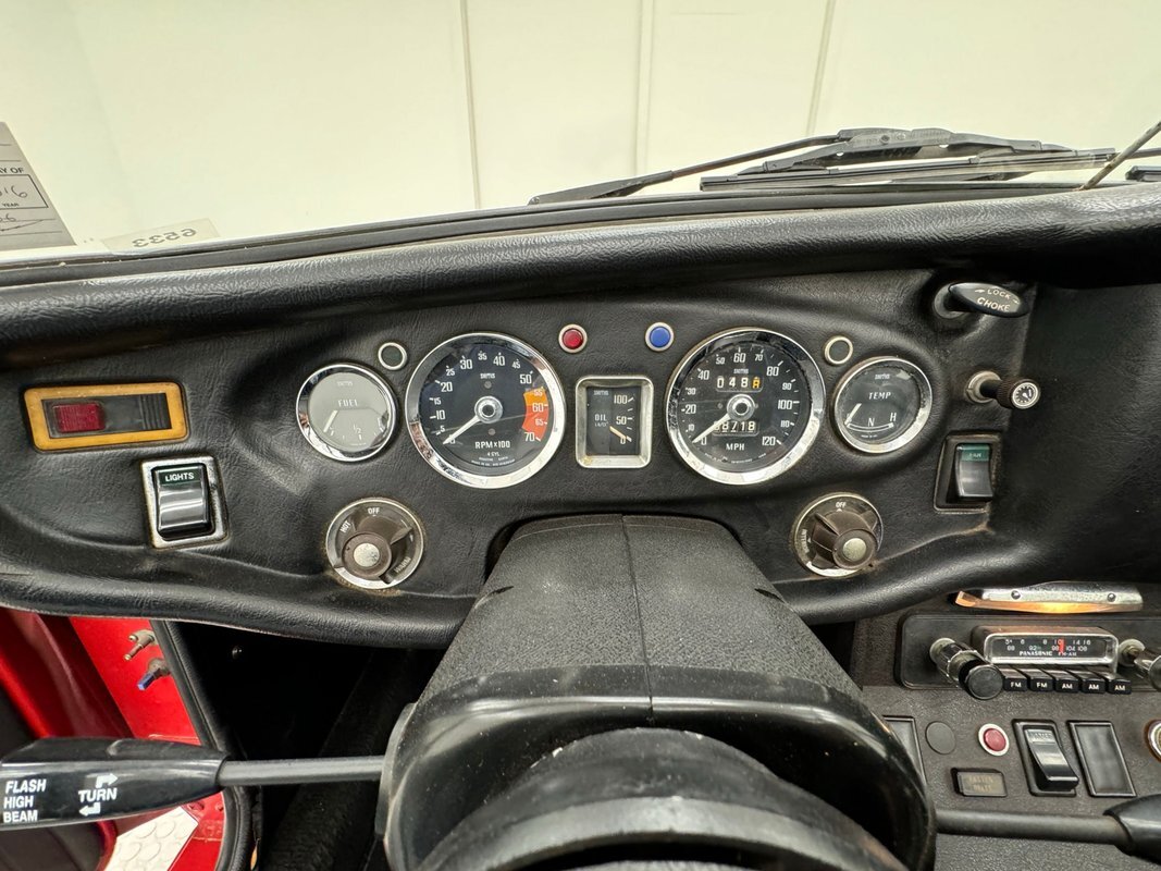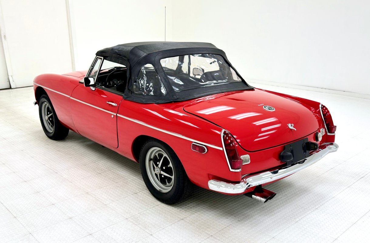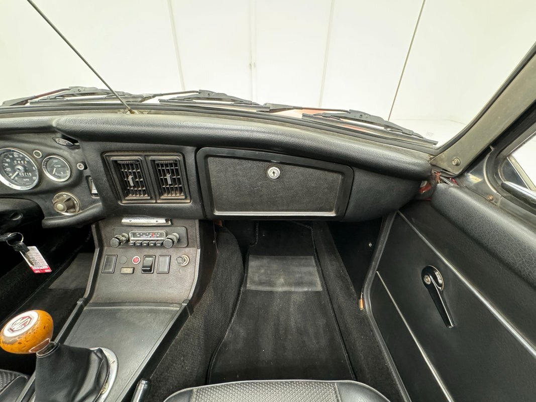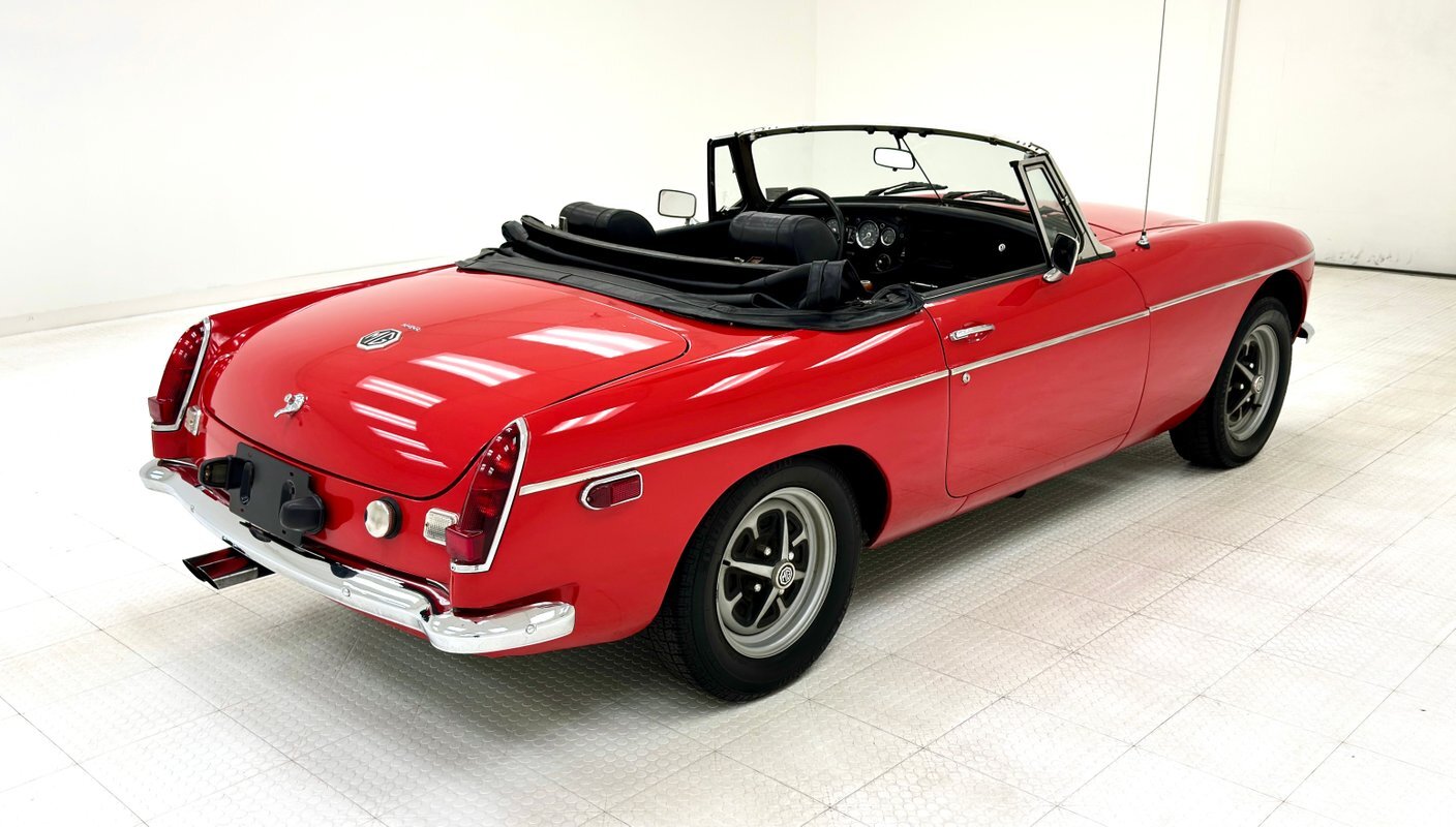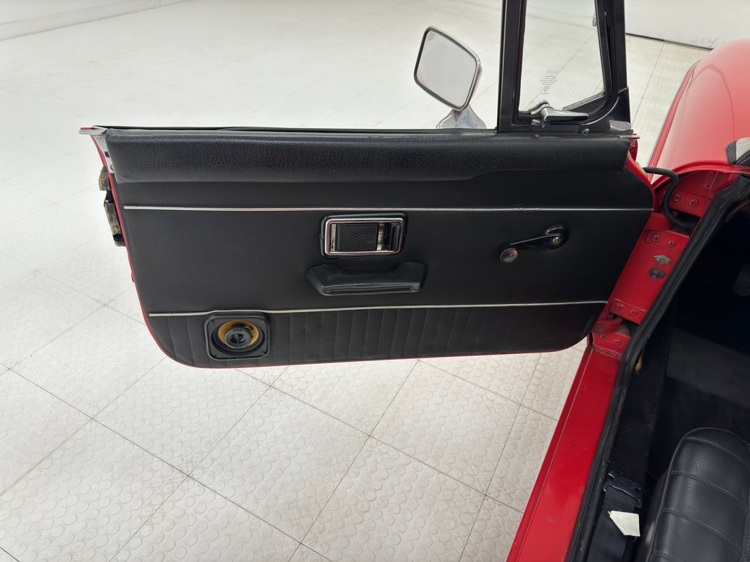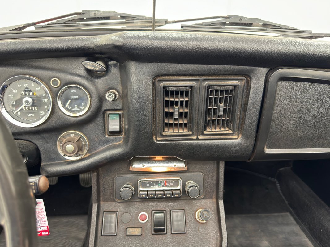 Small cars with red paint make them more visible. Fact. This one is coated in Bright Red and wears a cheeky little grin with its single headlights and vertically stacked grille, fronted by a straight chrome bumper that wraps around its flanks and lacks the overriders introduced in 1974 as part of U.S. regulations, later to be replaced with rubber bumpers. A body trim detail intersects the entire side of the car and a robust polished frame surrounds the windshield. The rear view is pure sports car with wide split vertical taillights and a twin tipped exhaust pipe, both accompanied by a contouring rear bumper that also folds into the sides. This is a diminutive car with great profile proportions, not too long in the front, not too short in the back, and the 14-inch MG wheels are right at home. Our consignor states the vinyl top is newer and it is in good condition. Overall the paint and bright work is good, with imperfections noted that include some chipped paint on lower panels and other places, running paint, spider cracks, major chipped paint and surface rust on the chin sill line, and cracking lines.
