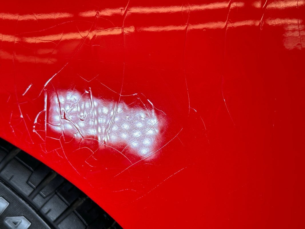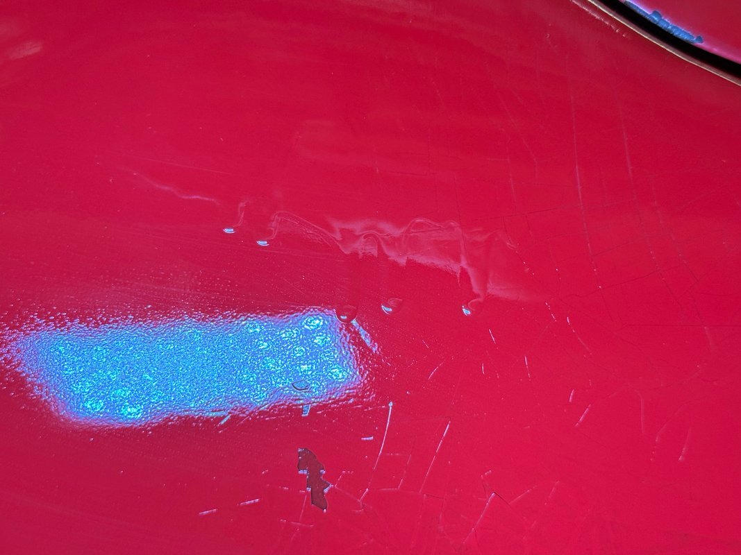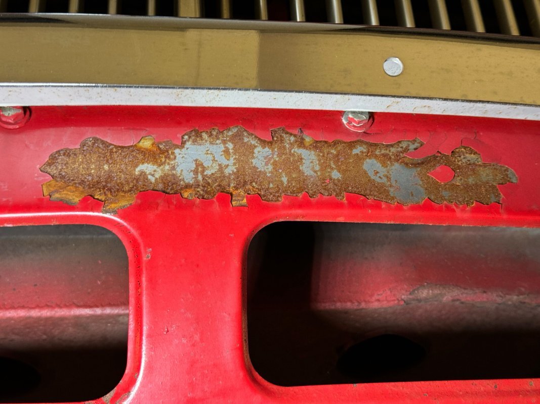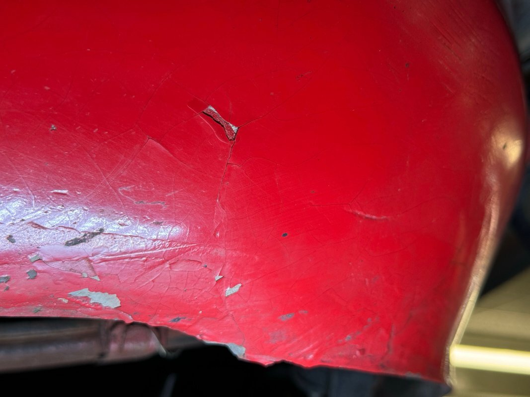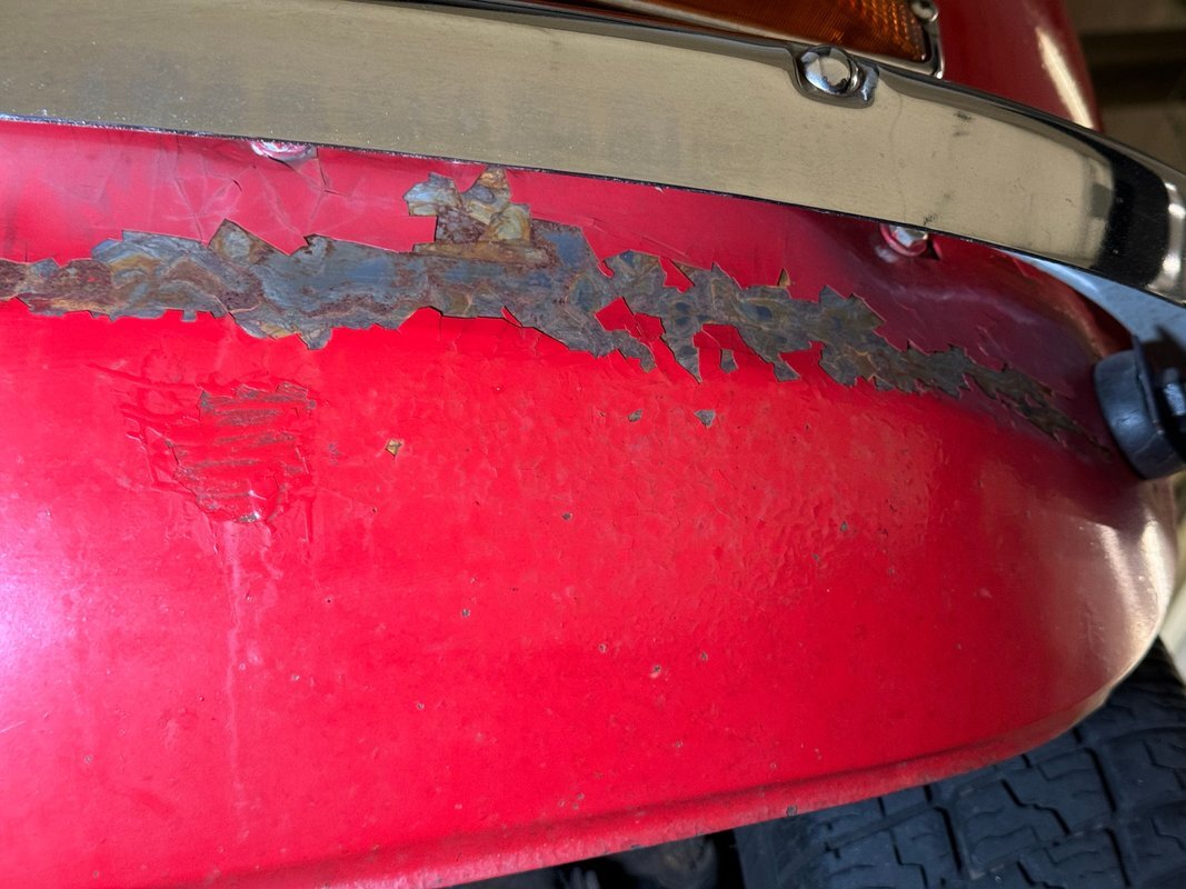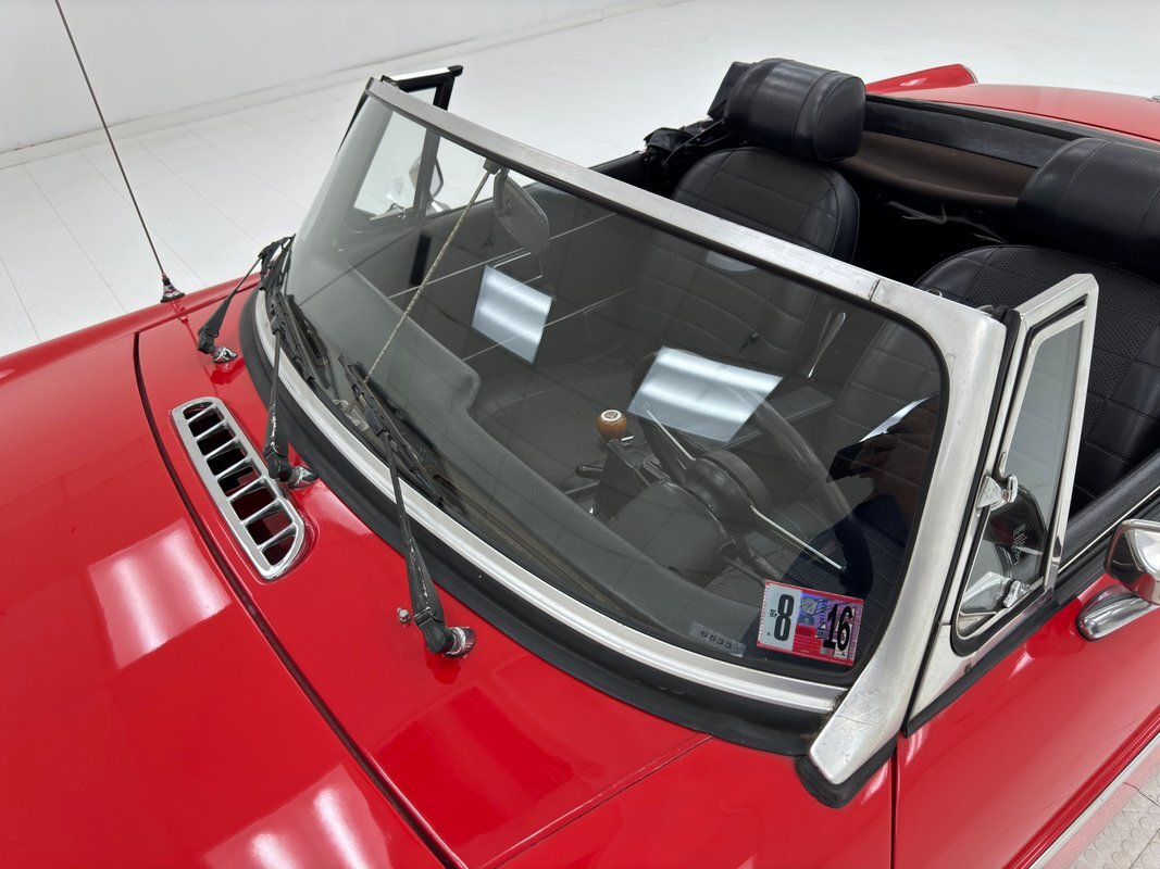 Small cars with red paint make them more visible. Fact. This one is coated in Bright Red and wears a cheeky little grin with its single headlights and vertically stacked grille, fronted by a straight chrome bumper that wraps around its flanks and lacks the overriders introduced in 1974 as part of U.S. regulations, later to be replaced with rubber bumpers. A body trim detail intersects the entire side of the car and a robust polished frame surrounds the windshield. The rear view is pure sports car with wide split vertical taillights and a twin tipped exhaust pipe, both accompanied by a contouring rear bumper that also folds into the sides. This is a diminutive car with great profile proportions, not too long in the front, not too short in the back, and the 14-inch MG wheels are right at home. Our consignor states the vinyl top is newer and it is in good condition. Overall the paint and bright work is good, with imperfections noted that include some chipped paint on lower panels and other places, running paint, spider cracks, major chipped paint and surface rust on the chin sill line, and cracking lines.