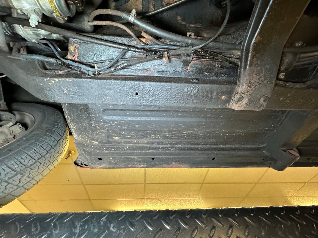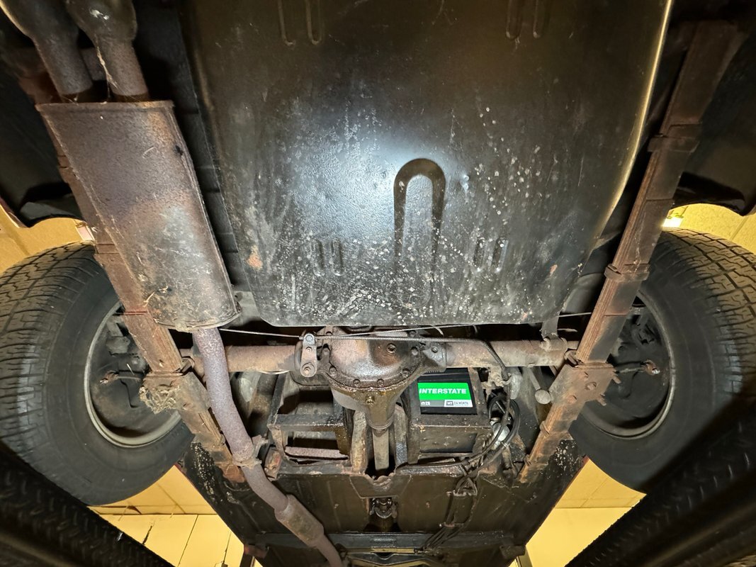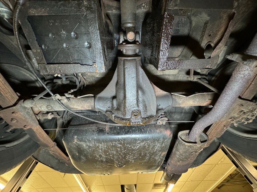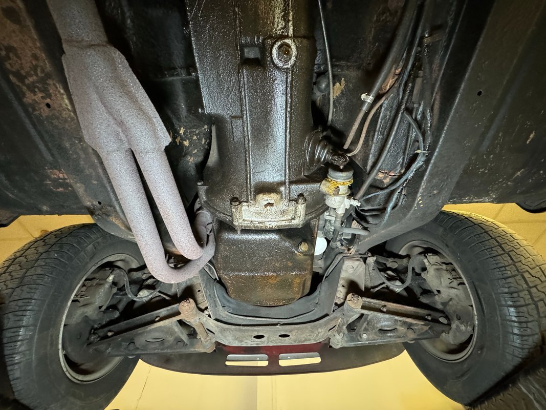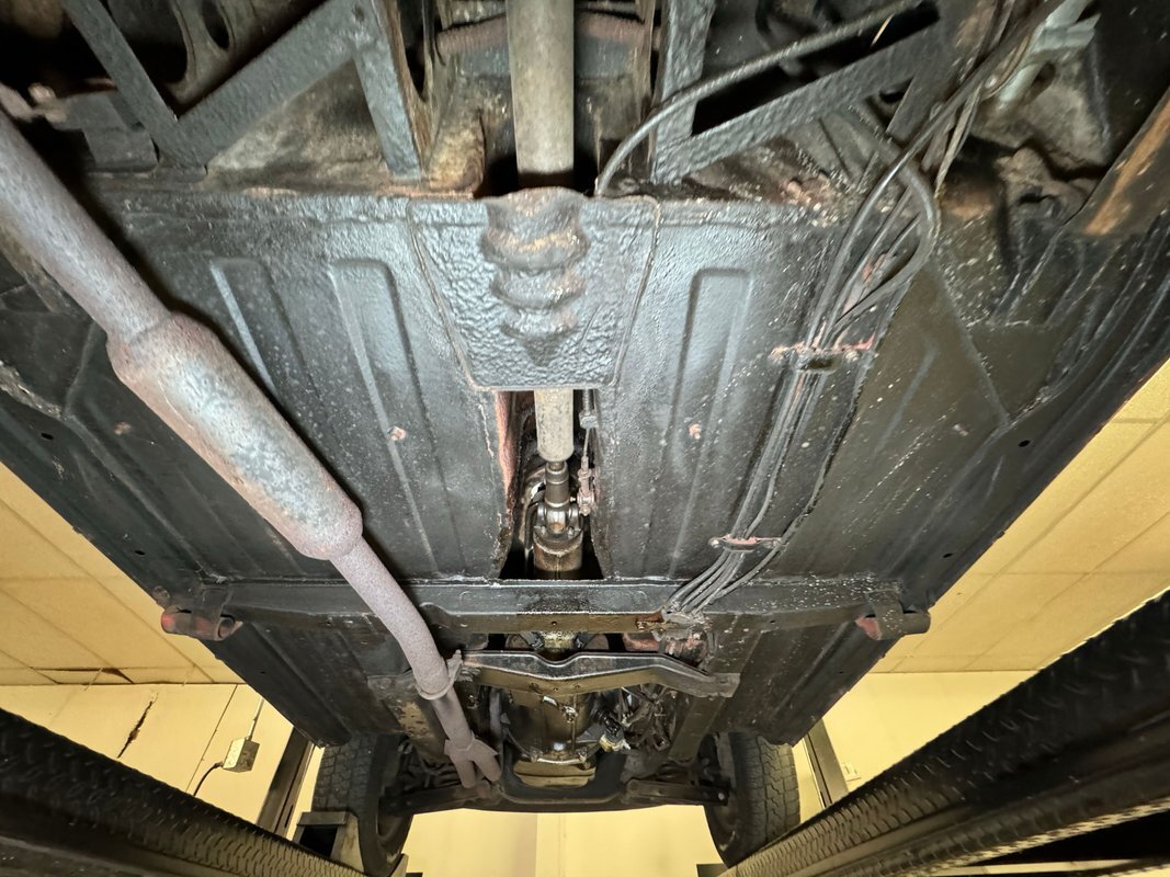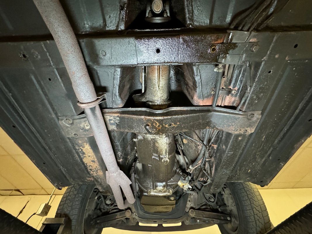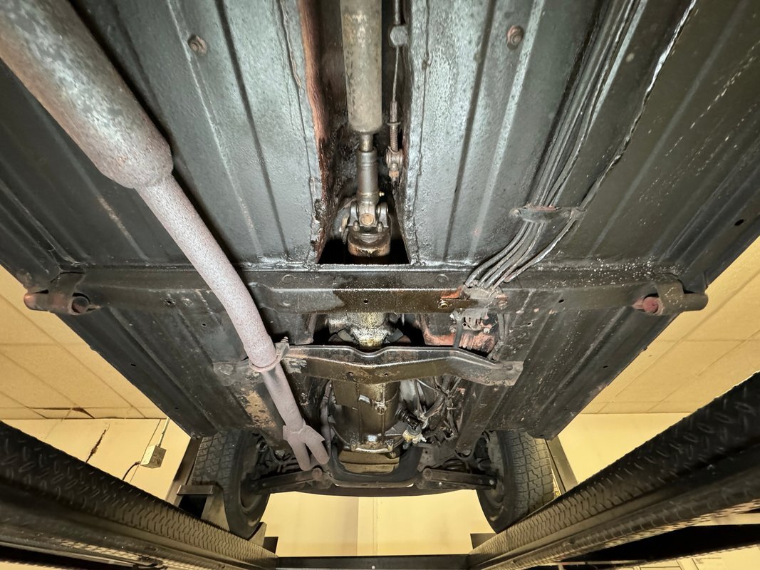 Relatively unscathed underneath with minimal surface rust. We note some oil on the rear differential and residual oil near the yoke and the oil pan. The single exhaust runs from headers to a stock style muffler and then out the back via twin tips. Coil spring suspension is in front with leaf springs in the rear.