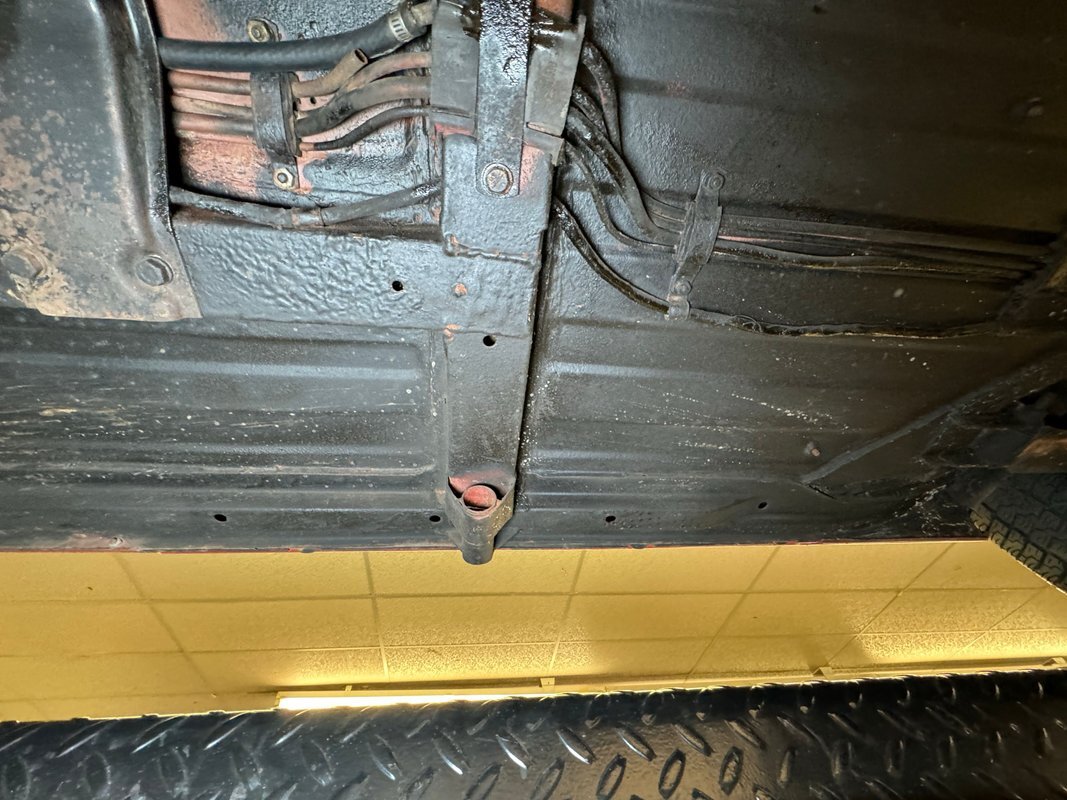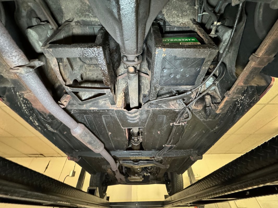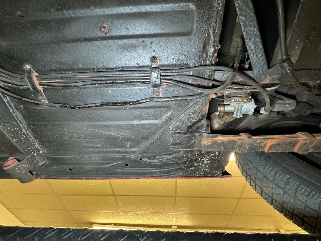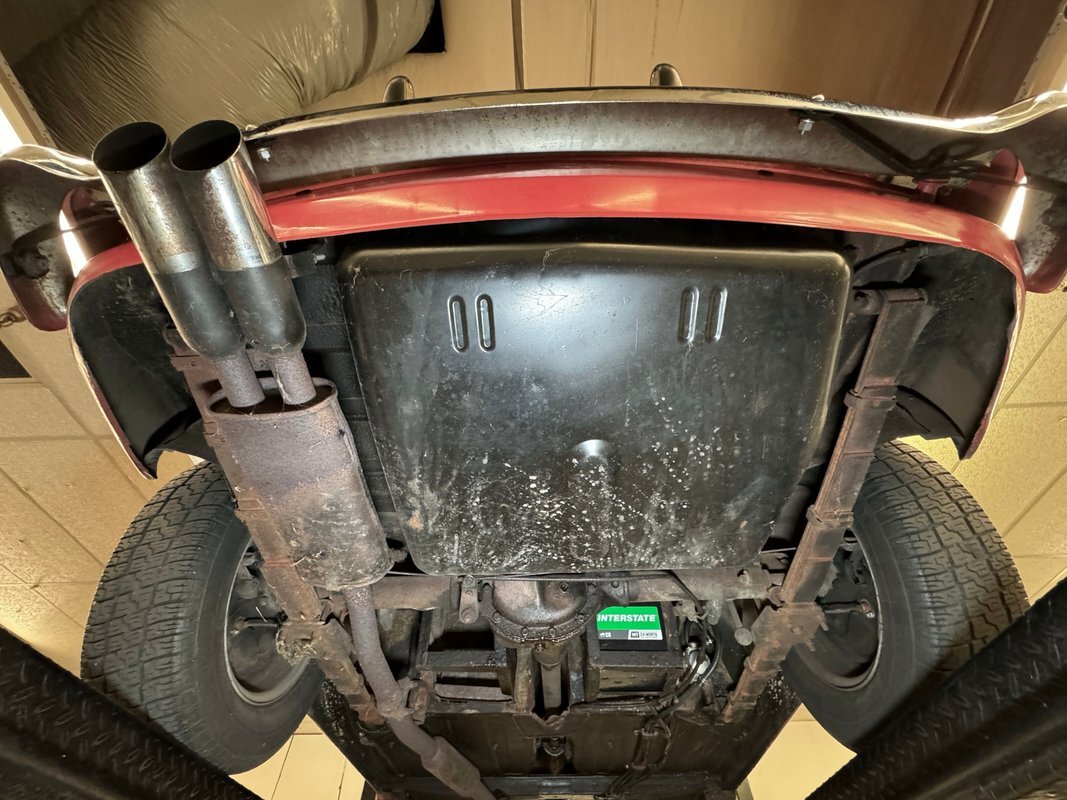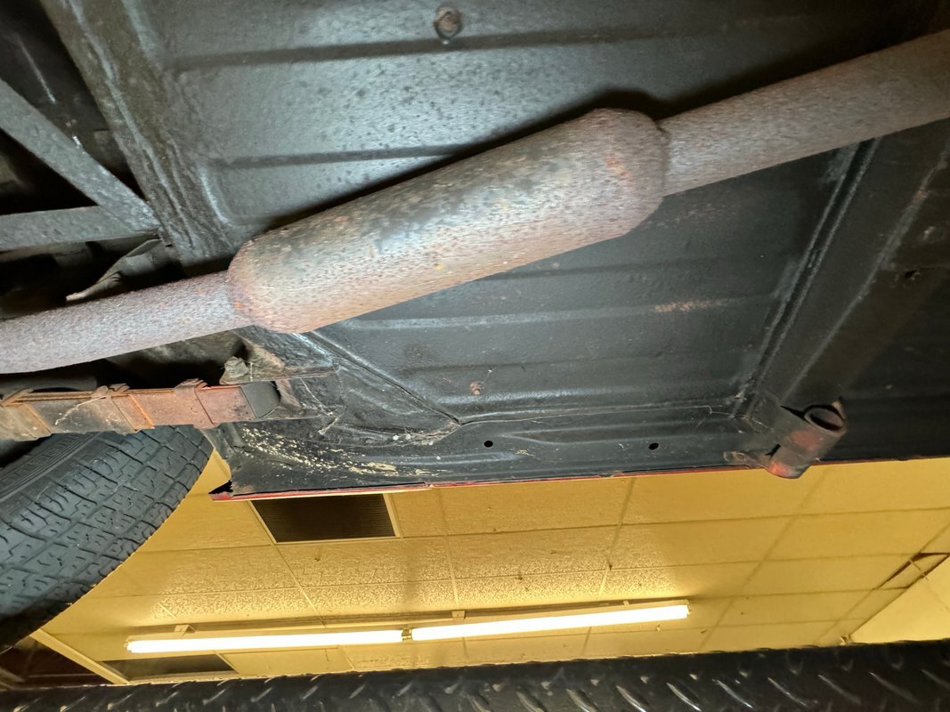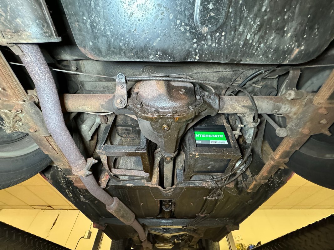 Relatively unscathed underneath with minimal surface rust. We note some oil on the rear differential and residual oil near the yoke and the oil pan. The single exhaust runs from headers to a stock style muffler and then out the back via twin tips. Coil spring suspension is in front with leaf springs in the rear.