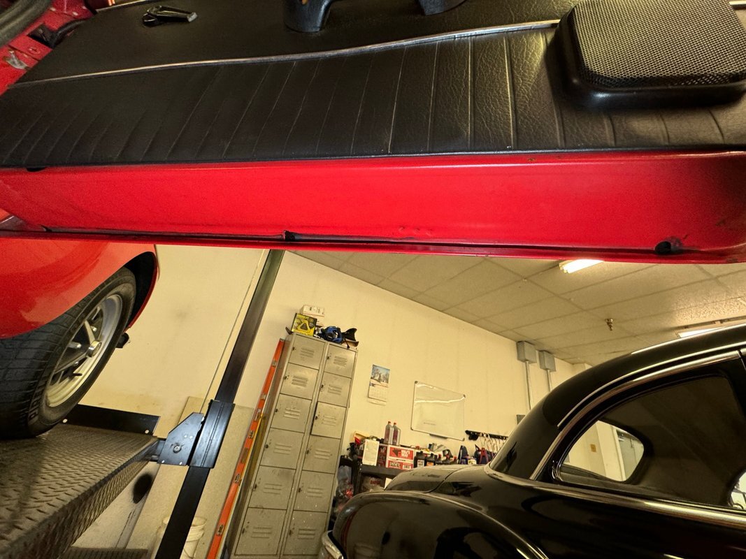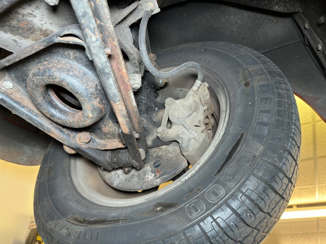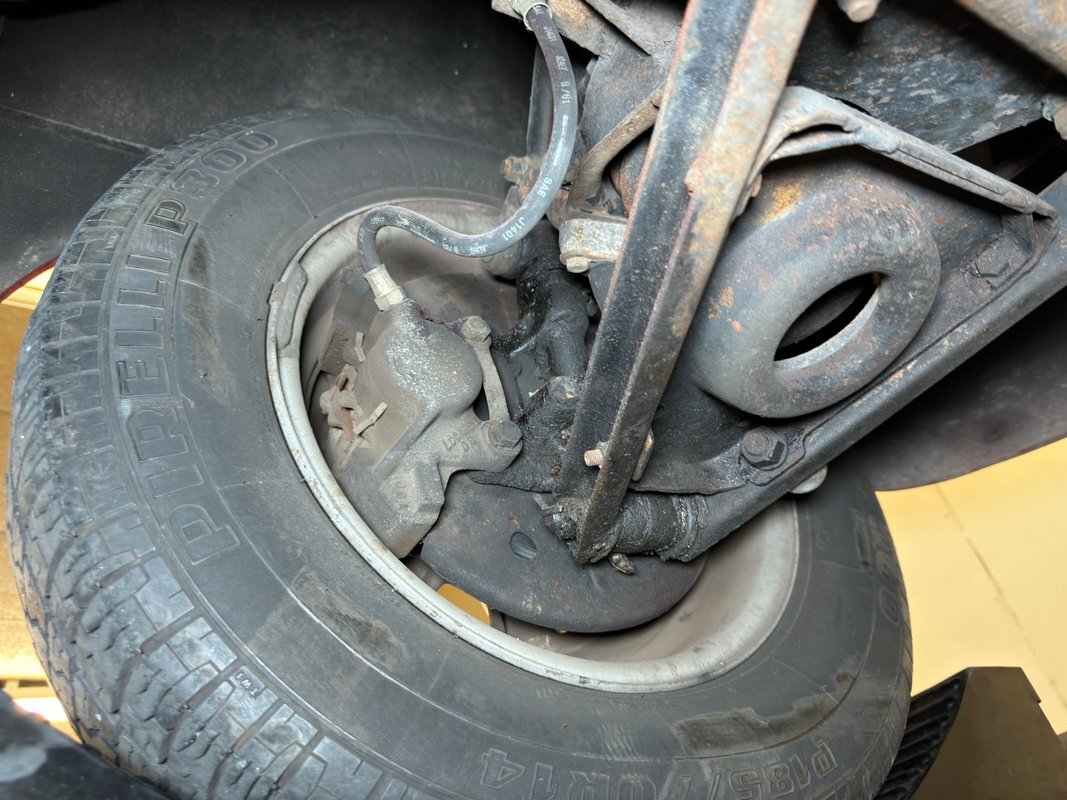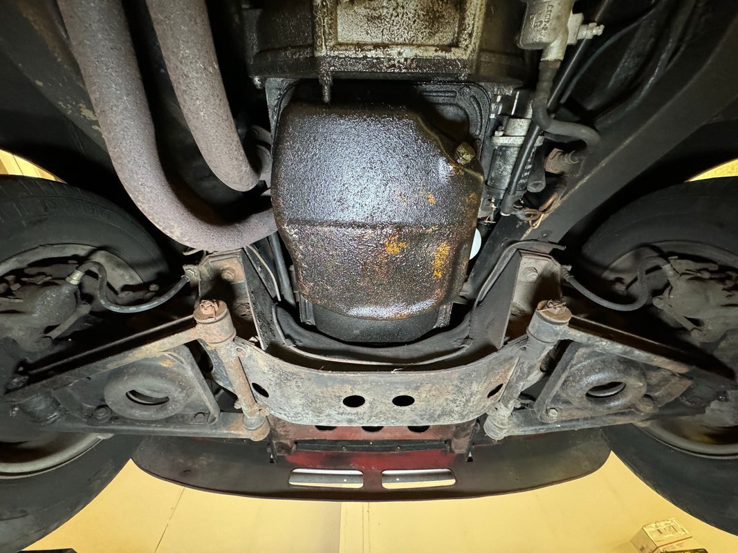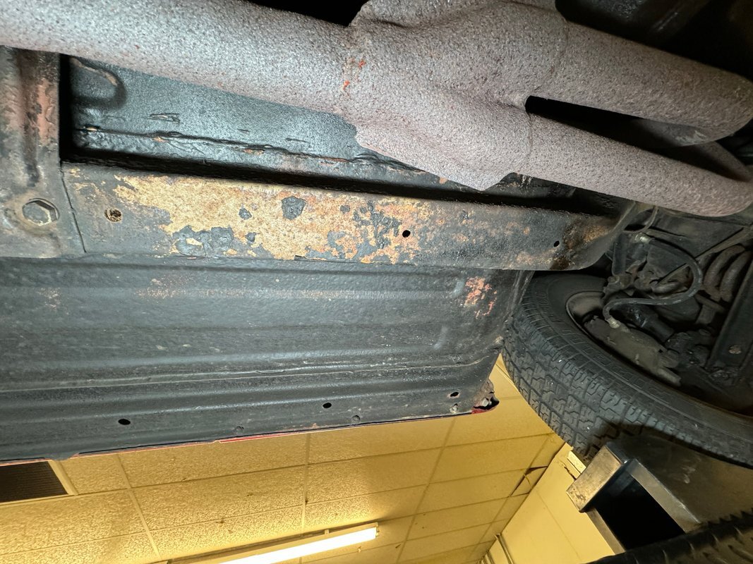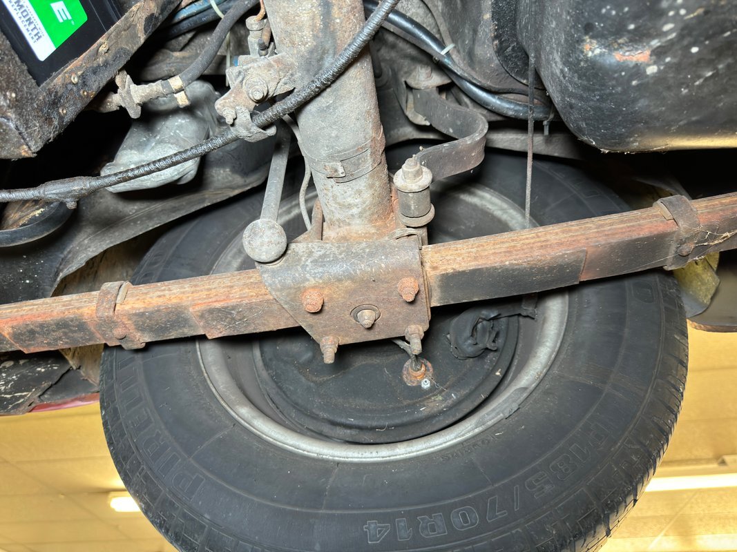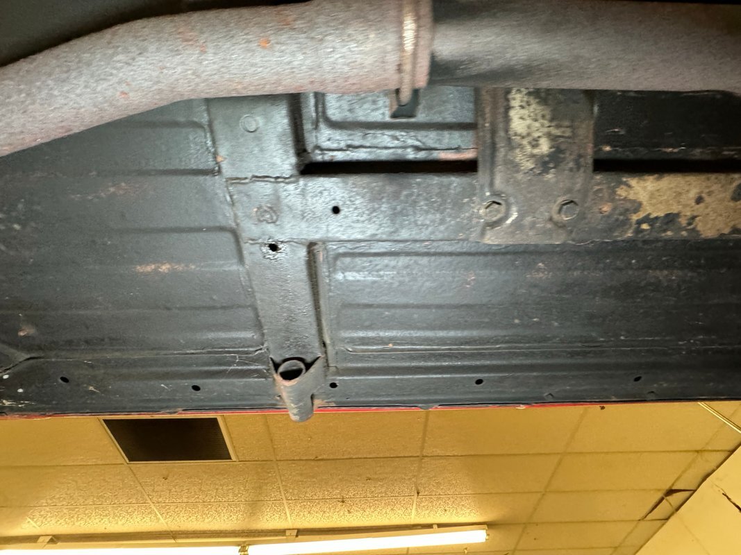 Relatively unscathed underneath with minimal surface rust. We note some oil on the rear differential and residual oil near the yoke and the oil pan. The single exhaust runs from headers to a stock style muffler and then out the back via twin tips. Coil spring suspension is in front with leaf springs in the rear.