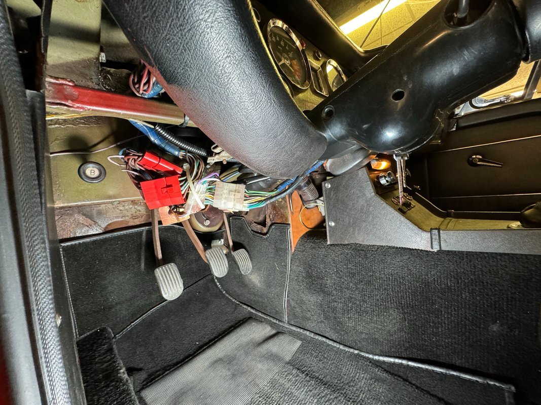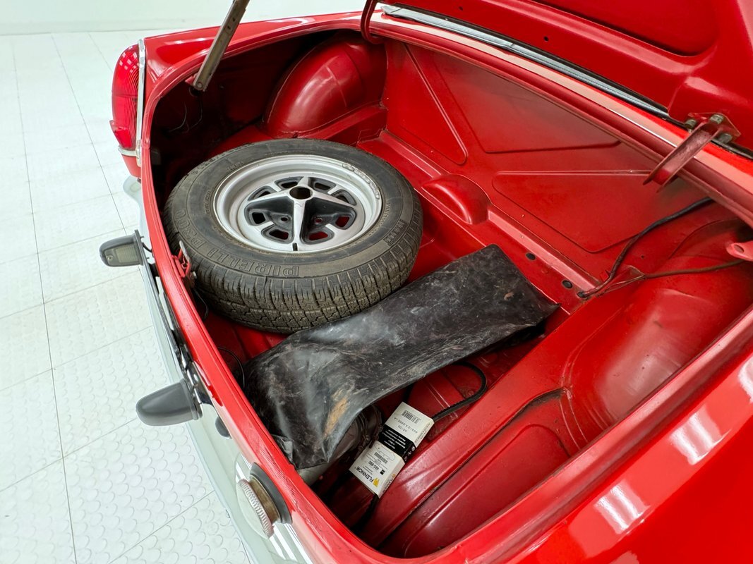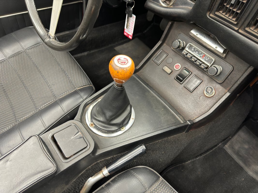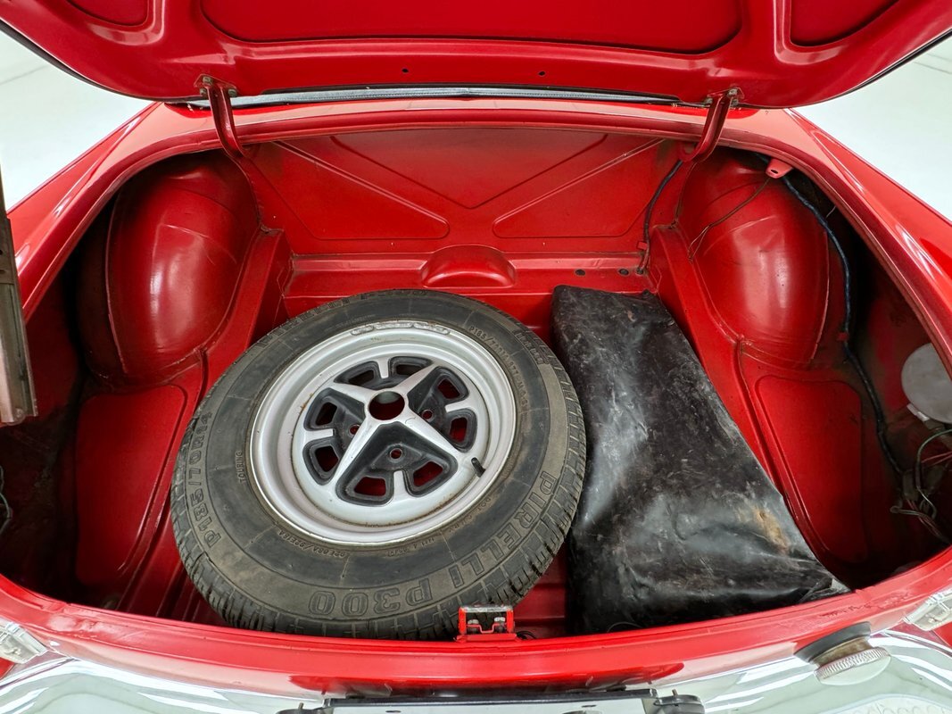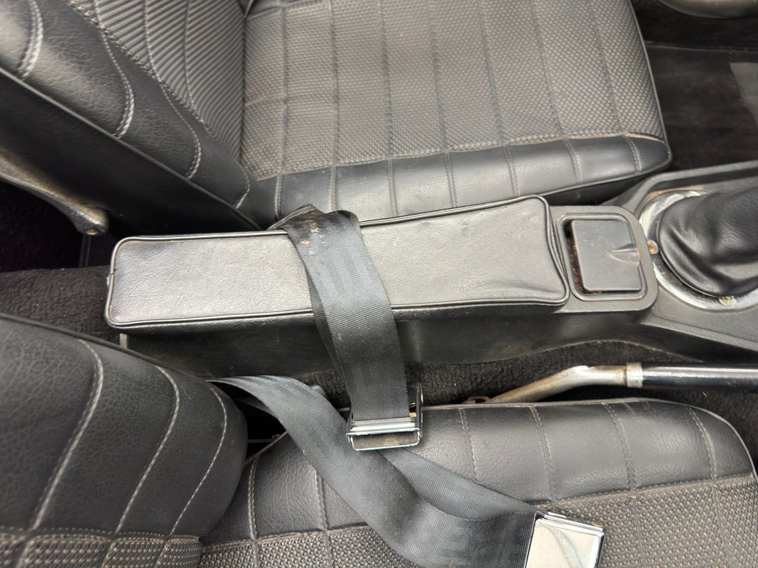 Simple patterned black vinyl in three sections cover the inner doors and look to be in good shape, with a speaker cover missing on the driver's side. Tall bucket seats with a stitched pattern throughout and weave pattern inserts are equipped with headrests and look to be in very good condition. A 3 spoke steering wheel fronts a very smart dashboard with symmetric gauges and switches on black vinyl and plastic panels. An AM/FM radio is in the center stack under some vents and a courtesy light and the wood knobbed shifter is in the center console with a vinyl boot. The entire dash and console could use a good detail to freshen things up, but it's fully intact with no broken plastic bits. Low pile black carpet covers the footwells and the small storage area behind the seats. The boot is barren, clean, and painted red.