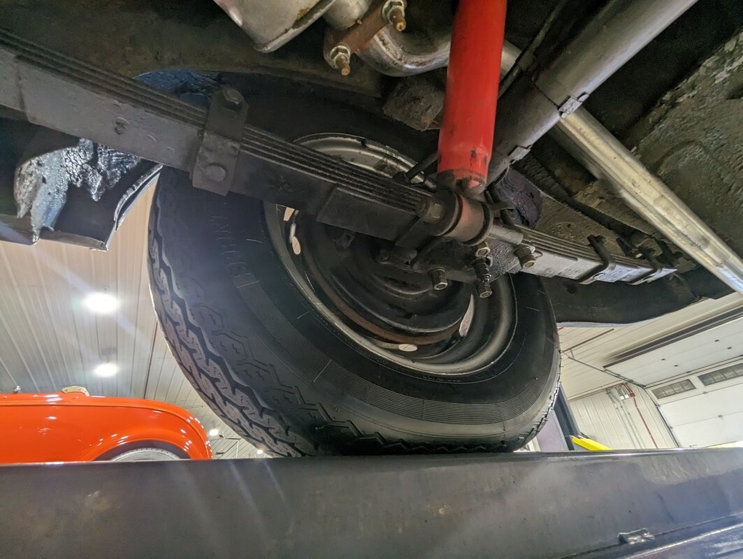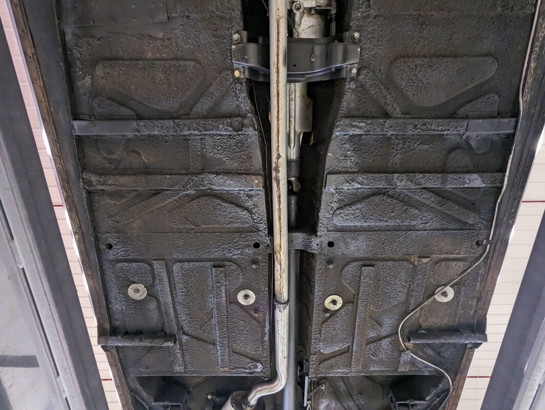UNDERSIDE: Underneath the car is clean, the frame is painted the same French blue, floors are solid. It has rack and pinion steering and disc brakes in the front. It appears the front end components were taken apart and rebuilt. A nice single exhaust system is hung properly, and the rear suspension looks to be replaced.