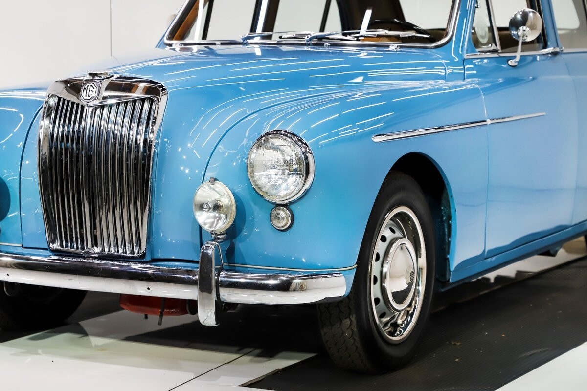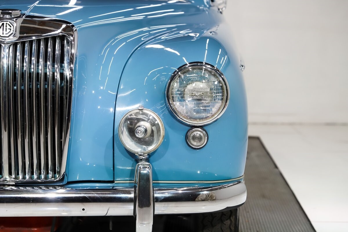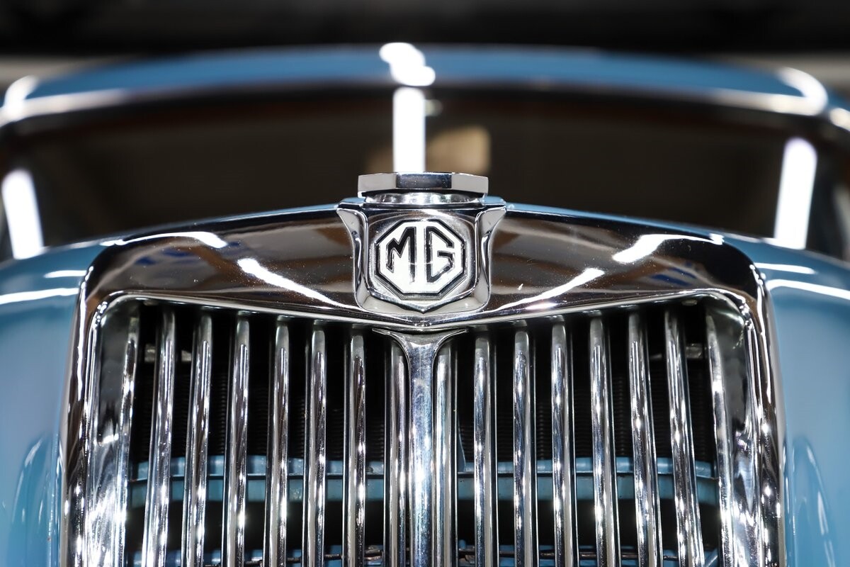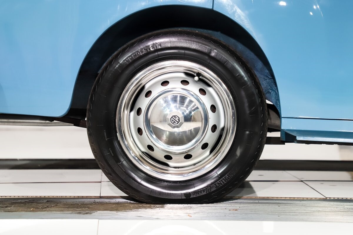 EXTERIOR: Finished in a gorgeous French blue paint. The body is clean and straight, the fit and finish is exceptional. Being an older restoration, the paint has mild crows feet cracking in places. These Magnettes have a very appealing look with the Lucas lamps, the big chrome MG grill and the chrome extended bumpers. All the chrome trim shines like new, there's no rust. The glass is nice and clear and in great shape. It has the upgraded correct radial tires on the MG steel wheels with hubcaps.