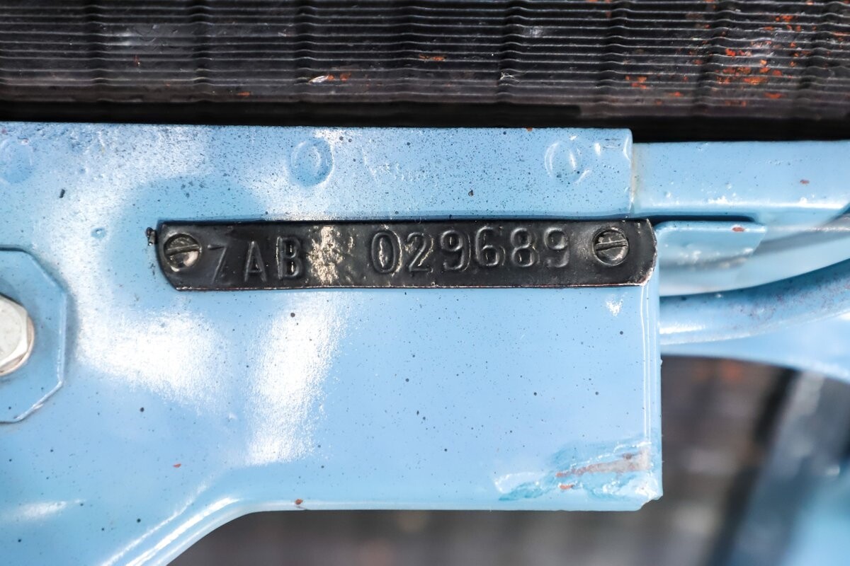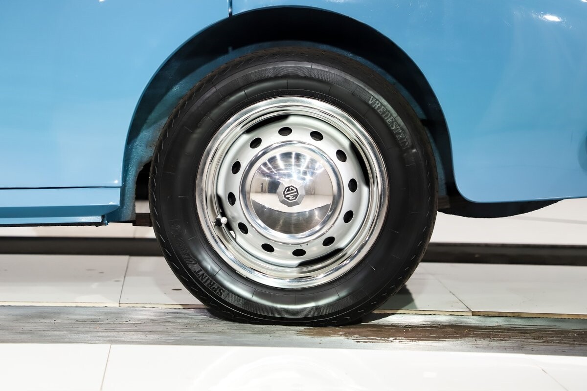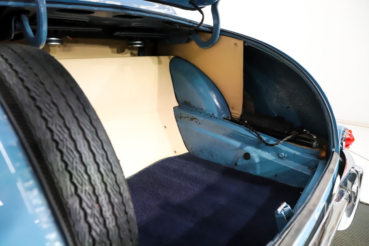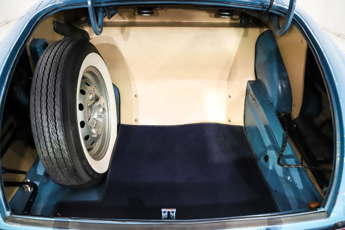 TRUNK COMPARTMENT: The trunk compartment is complete: it has a spare tire, the tool kit, air pump and jack. There's also some literature, British license plates and front badge bar. It is solid and painted nicely. It also has a cream color liner and blue carpet mat.