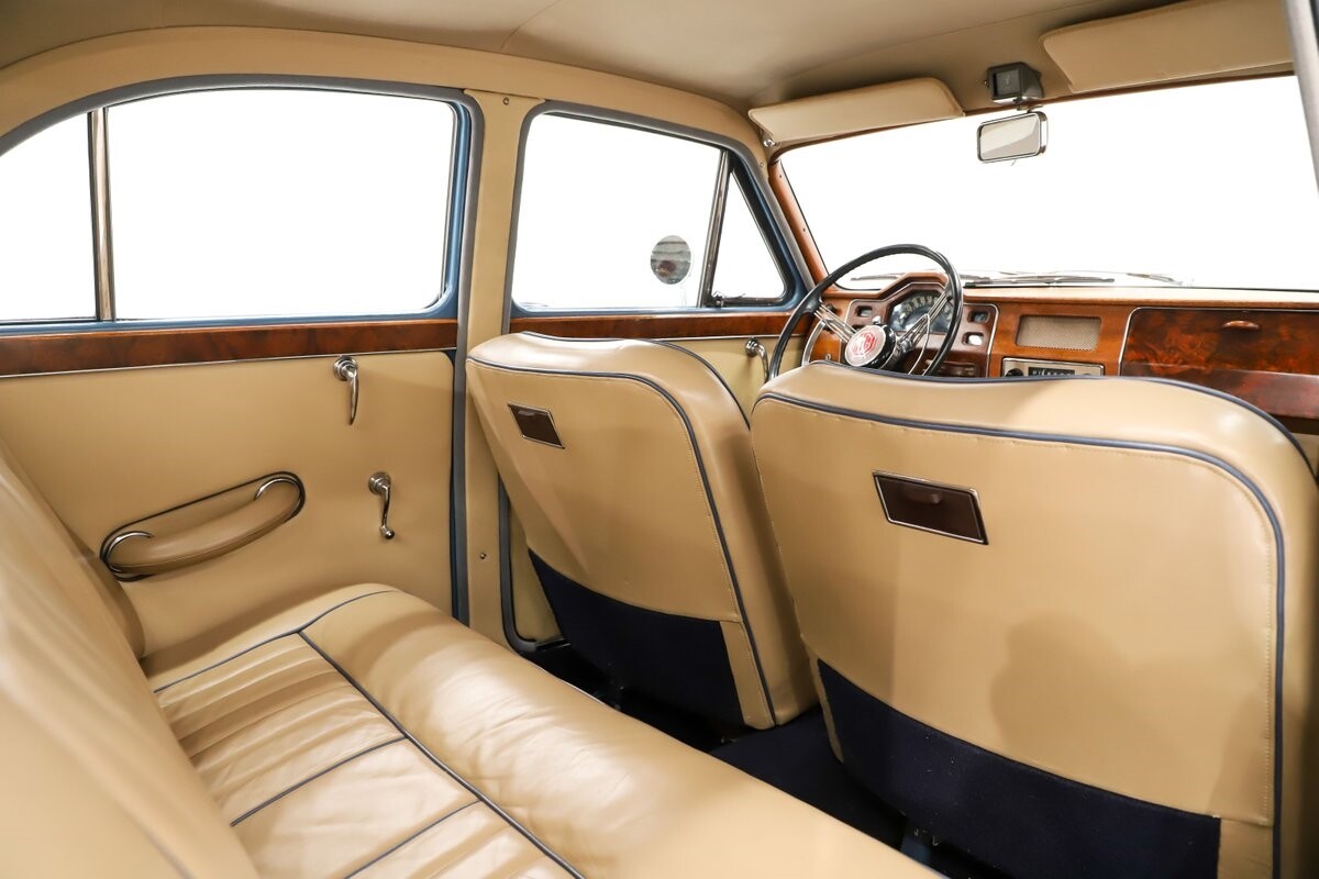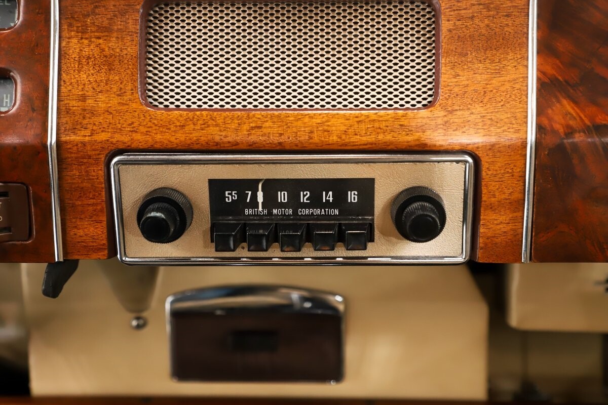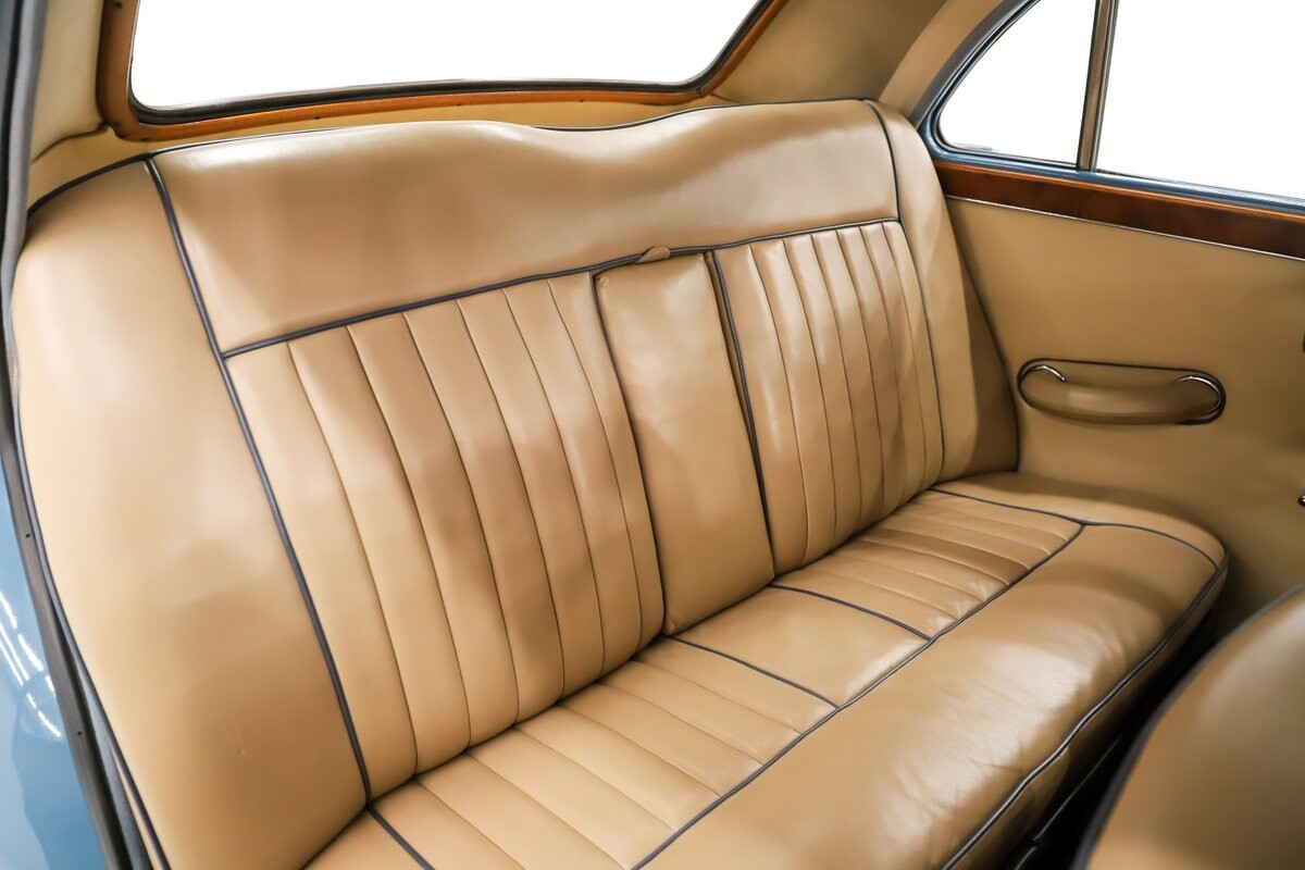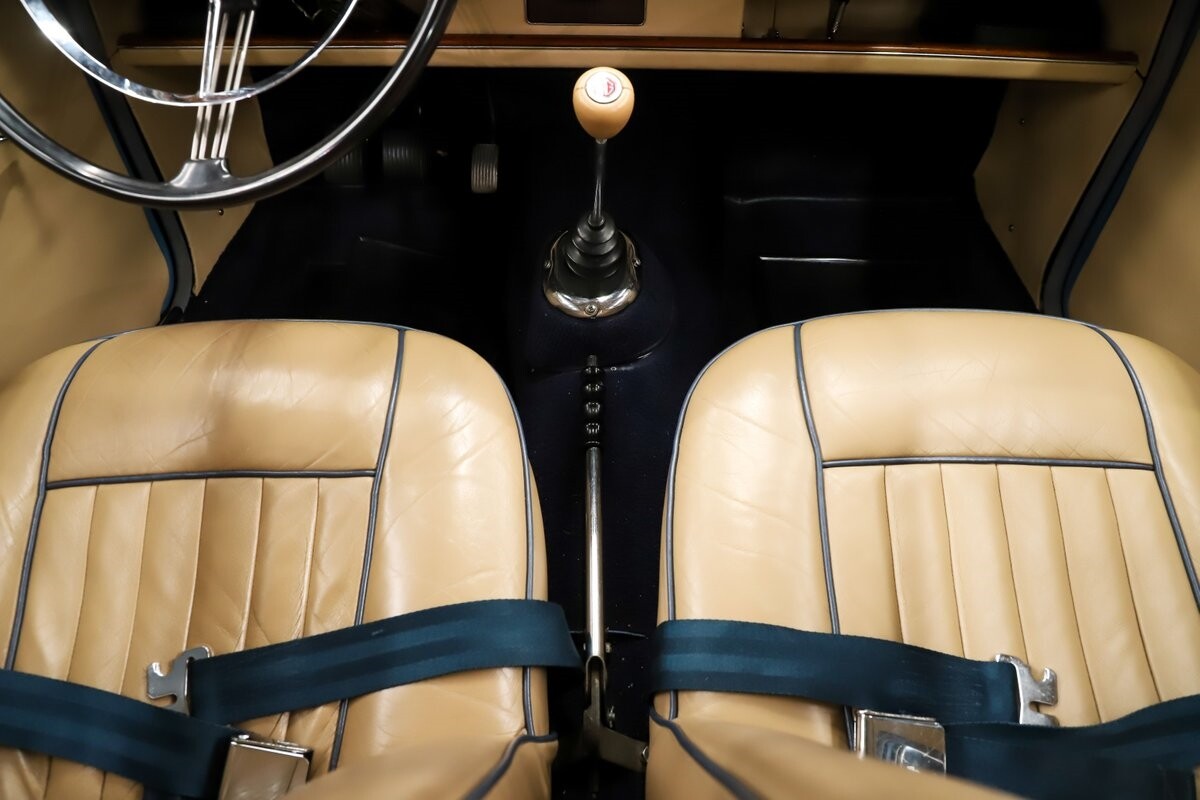 INTERIOR: The cabin is finished with a beautiful cream Connoly leather with blue piping. Bucket seats in front, it has a fold down armrest in back. Seatbelts have been added. It also has a beautiful wood trim. The carpet matches the navy blue accent piping and in great shape. The wood dash, knobs, optional radio and original gauges look nice. It has a hidden stereo under the dash with speakers. The headliner is in great shape. The stylish steering wheel is beautiful and has a working horn. Overall, the interior gives a luxury presence, it reminds me of a Rolls Royce!