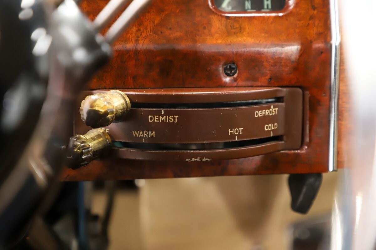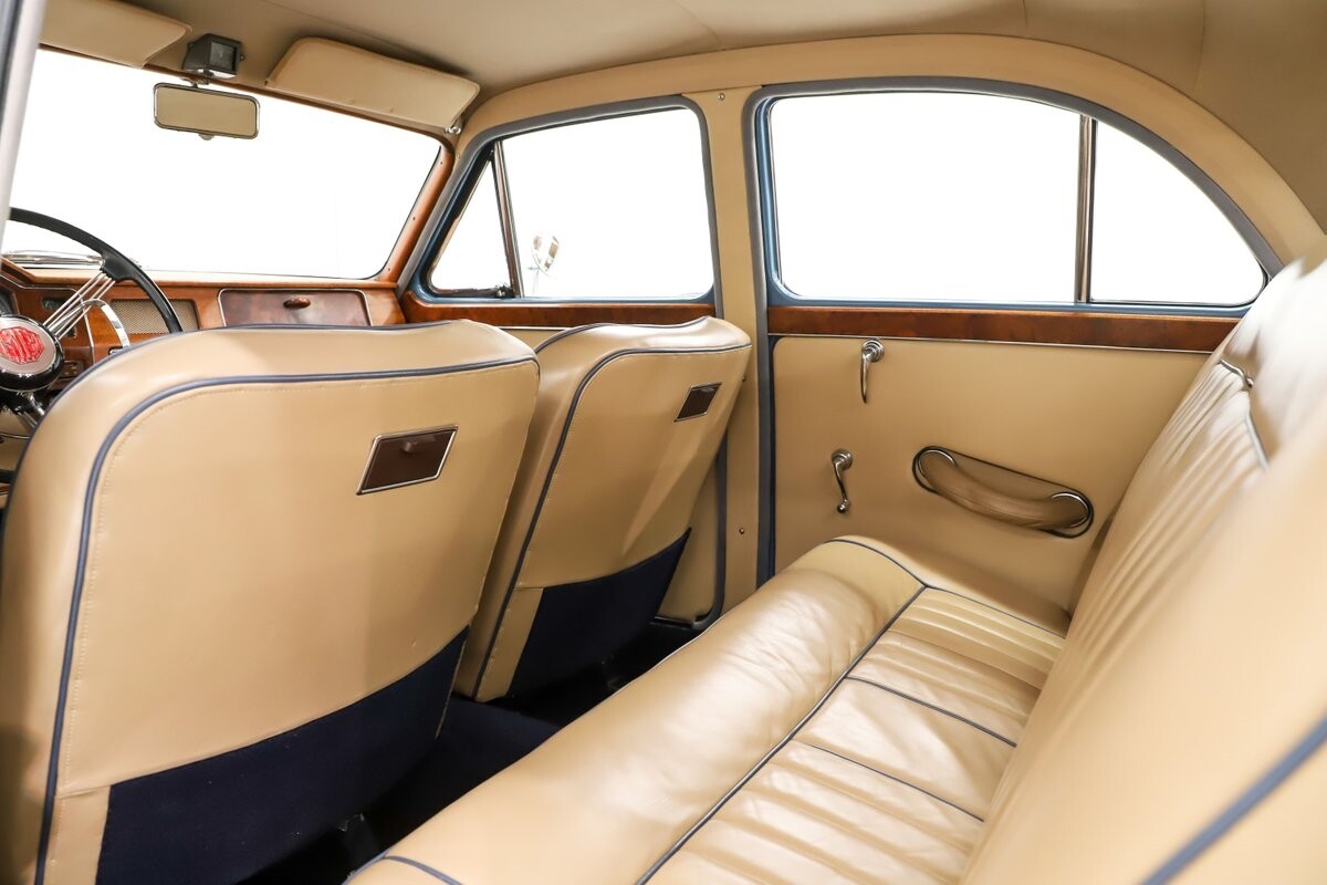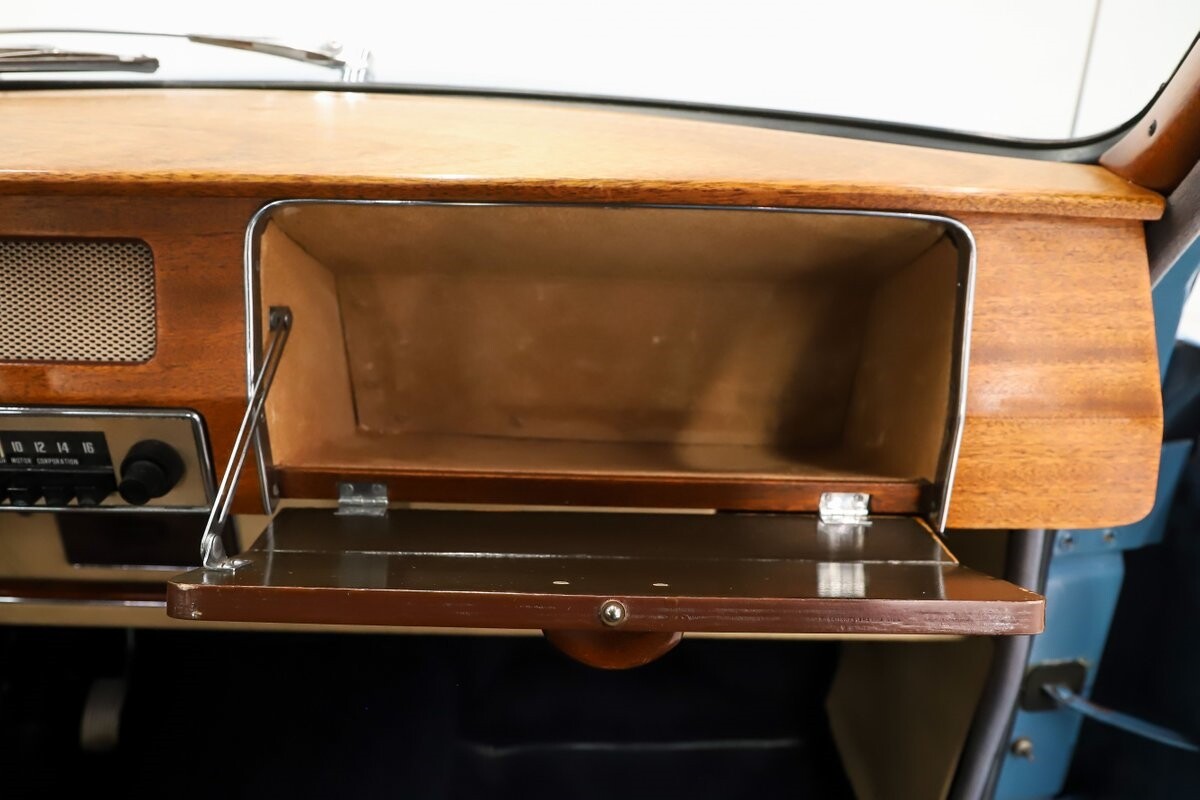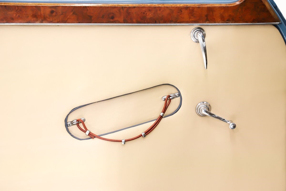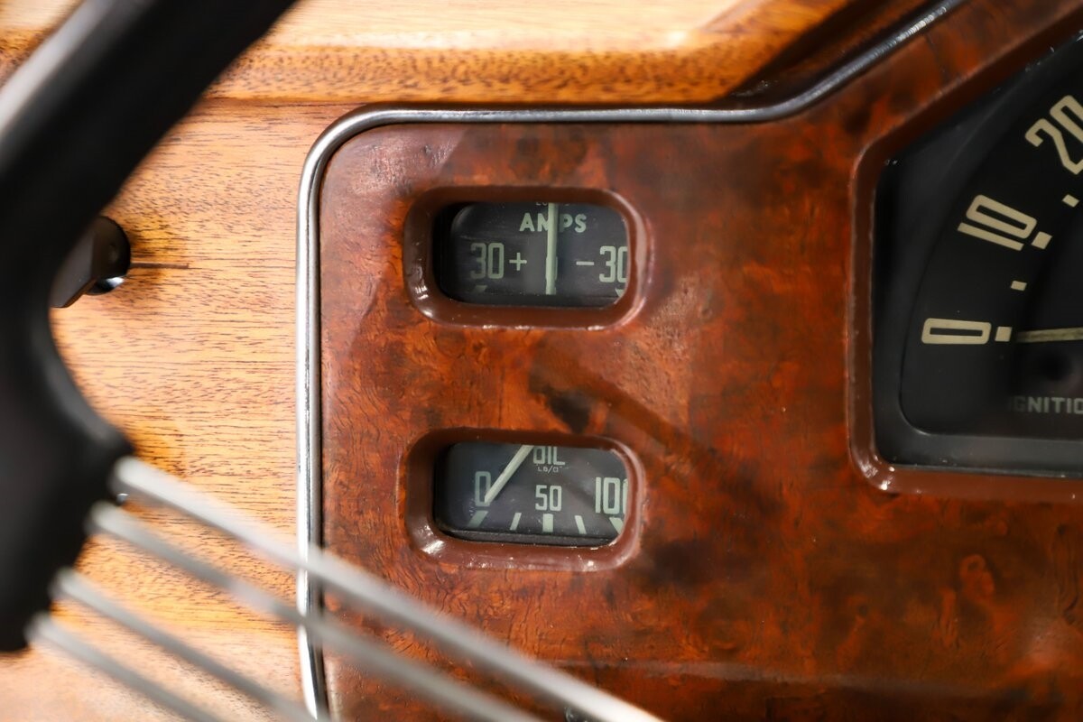 INTERIOR: The cabin is finished with a beautiful cream Connoly leather with blue piping. Bucket seats in front, it has a fold down armrest in back. Seatbelts have been added. It also has a beautiful wood trim. The carpet matches the navy blue accent piping and in great shape. The wood dash, knobs, optional radio and original gauges look nice. It has a hidden stereo under the dash with speakers. The headliner is in great shape. The stylish steering wheel is beautiful and has a working horn. Overall, the interior gives a luxury presence, it reminds me of a Rolls Royce!