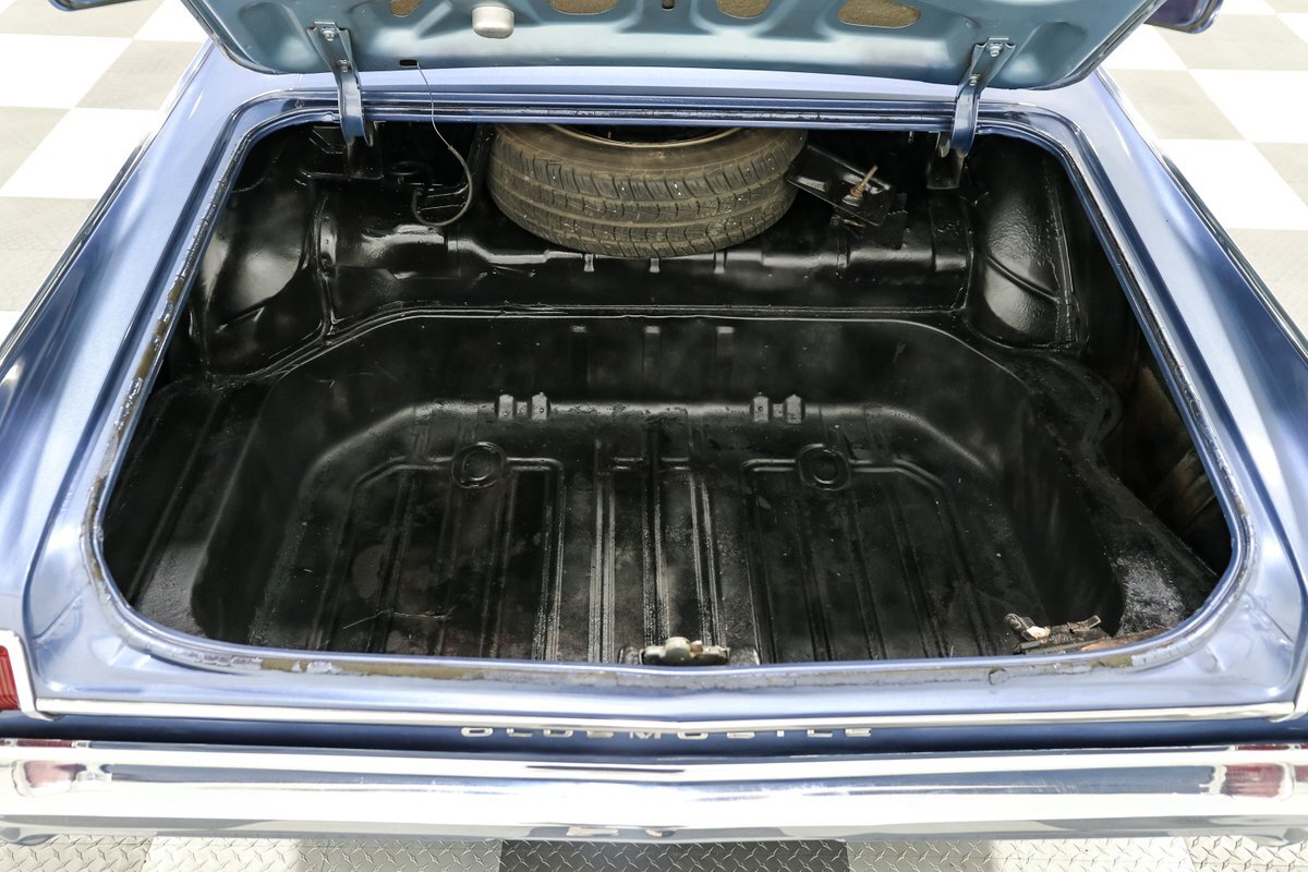 The exterior features American Racing Torque Thrust wheels that add a touch of modern flair to its vintage appeal. The lavender paint, a rare and eye-catching color, highlights the car's sleek lines and timeless design. This Oldsmobile is not just about looks; it's built for performance and reliability, making it perfect for both shows and daily drives.