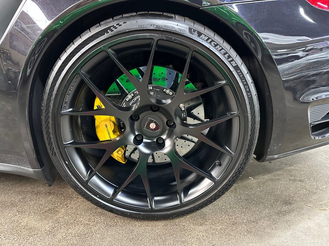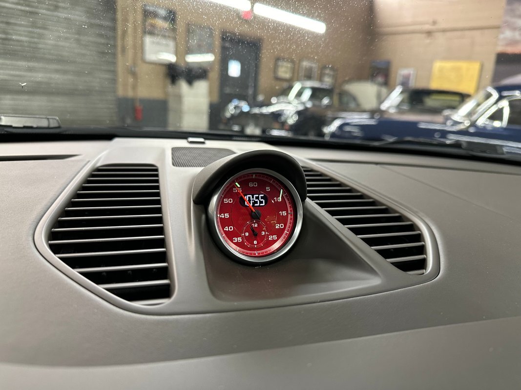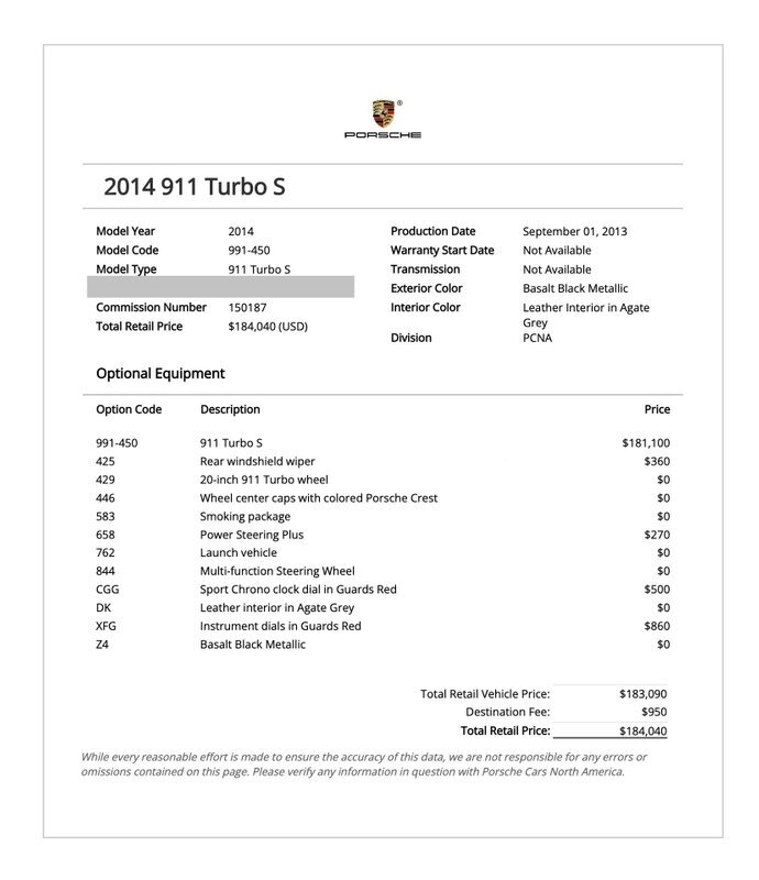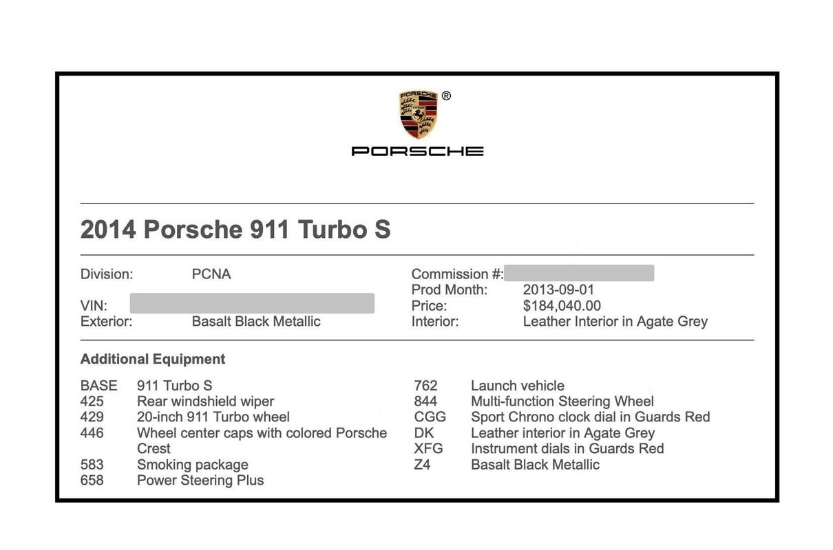 Factory options include: Turbo S package, Ceramic composite brakes, Rear windshield wiper, Power steering plus, Sport Chrono, Instrument dials in Guards Red, Sport Chrono dial in Guards Red, Smoking package, Launch vehicle, Multi-function steering wheel and Leather in Agate Grey. It was further upgraded with the following: 21" Gemballa wheels, lowering springs, exhaust update.