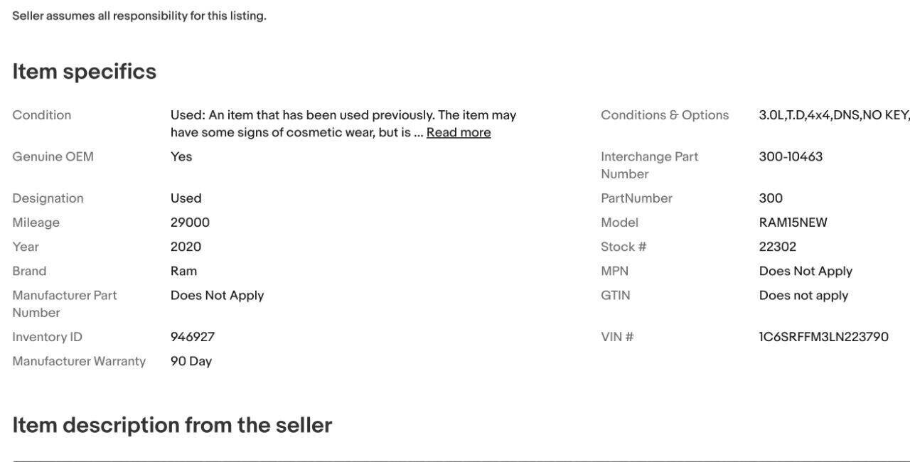 LIQUIDATION CASH SALE: We've closed 2 of 4 warehouses due to outrageous rent hikes in CA. Everything includes FREE SHIPPING and a 7-day warranty. Yachts and RVs are available by appointment only for serious buyers. No time-wasters who need to check out other RVs or get wife's permission! NO FINANCING. With over 40 years in the automotive business, including experience as an ASE technician, in racing, and as a specialty dealer, I urge everyone to watch our walkaround video—the best and honest way to see our vehicles and who we are. Our goal is to ensure happy customers with a memorable experience that leads to referrals. Serious inquiries only. Contact Daren at 951-556-9911 Ram 1500 Jurassic Park Edition: This unique truck stands out with custom features like a snorkel, brush guard racks, and additional lights, making it a one-of-a-kind Jurassic Park edition. Acquired from an insurance auction due to engine damage, it underwent significant enhancements. Engine and Transmission: Recently replaced with a documented powertrain featuring a 29,000-mile engine and transmission. The truck now combines reliability with enhanced performance. Custom Features: Includes a TV iPad setup ($400), new all-terrain mud tires ($1200), a lifted suspension ($400), new front and rear brakes ($800), and an oil filter servicing. It holds a California rebuilt title. Fuel Efficiency: Despite its modifications, it maintains exceptional fuel efficiency, averaging 25 MPG, suitable for city driving, long-distance travel, or towing boats and trailers. Performance and Capability: Powered by a new 3.0-liter V6 diesel engine generating 240 horsepower and 420 lb-ft of torque, paired with an 8-speed automatic transmission. It features on-demand 4WD and robust towing capabilities comparable to larger trucks. Additional Features: Interior Comfort: Offers upgraded cloth upholstery, a power driver's seat, leather-wrapped steering wheel, rear floor storage bins (Crew Cab), and a power sliding rear window (on four-doors). Utility and Technology: Includes a chrome grille, 20x8-inch wheels, a 115-VAC outlet, and a user-friendly Chrysler-infotainment system. Contact Information: For serious inquiries and to schedule a viewing after watching the walkaround video, contact Daren at 951-556-9911. Don't miss out on this custom Ram 1500 Jurassic Park edition with unique capabilities and enhanced performance.