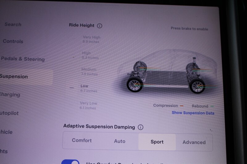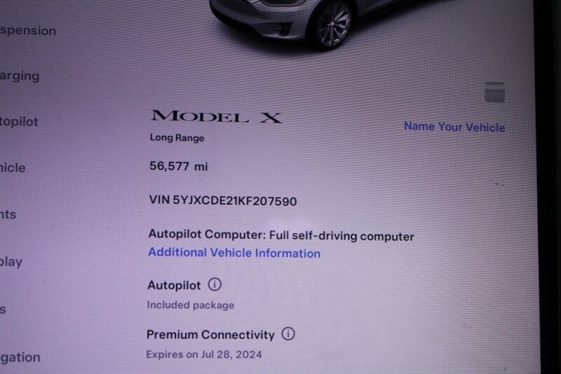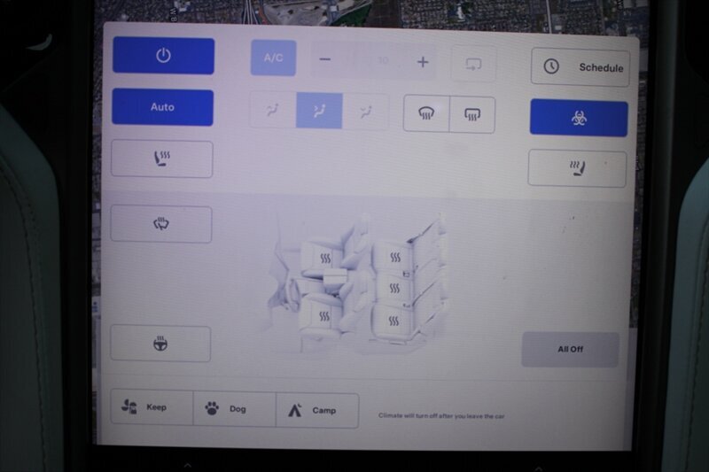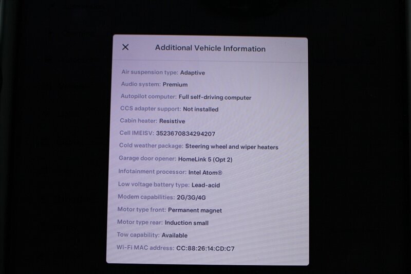 INSTALLED FEATURES: Air filtration, Front air conditioning: automatic climate control, Front air conditioning zones: dual, Rear vents: second row, Airbag deactivation: occupant sensing passenger, Front airbags: dual, Knee airbags: dual front, Side airbags: front / rear, Side curtain airbags: front / rear, Antenna type: element, Auxiliary audio input: Bluetooth / USB, Internet radio app: TuneIn, Radio: FM / HD radio / touch screen display / voice operated, Radio data system, Satellite radio: SiriusXM, Subwoofer: 1, Total speakers: 11, Watts: 560, ABS: 4-wheel, Brake drying, Braking assist, Electronic brakeforce distribution, Electronic parking brake, Front brake diameter: 14.0, Front brake type: ventilated disc, Front brake width: 1.26, Power brakes, Rear brake diameter: 14.4, Rear brake type: ventilated disc, Rear brake width: 1.1, Regenerative braking system, Center console trim: leatherette, Dash trim: leatherette, Door trim: leatherette, Floor mat material: carpet, Floor material: cargo area carpet / carpet, Floor mats: front / rear, Foot pedal trim: alloy, Heated steering wheel, Interior accents: metallic-tone / wood, Steering wheel trim: leatherette, Ambient lighting, Cargo area light, Cargo cover: hard, Center console: front console with armrest and storage, Cruise control, Cupholders: front / rear, Easy entry: power driver seat / power steering wheel, Memorized settings: 8 driver / audio system / climate control / driver seat / liftgate / passenger seat / side mirrors / steering wheel, Multi-function remote: proximity entry system / trunk release / vehicle and key memory, One-touch windows: 4, Power outlet(s): 12V cargo area / 12V front, Power steering: variable/speed-proportional, Power windows: lockout button, Push-button start, Reading lights: front / rear, Rearview mirror: auto-dimming, Steering wheel: power tilt and telescopic, Steering wheel mounted controls: air conditioning / audio / cruise control / multi-function / voice control, Storage: door pockets, Sunshade: windshield, Universal remote transmitter: Homelink - garage door opener, Vanity mirrors: dual illuminating, 4WD type: full time, Axle ratio: 9.73, Drive mode selector, Electric charge cord: 240 volt, Electric motor battery type: lithium ion, Electric motor charger connector: Tesla (SAE J3400), Electric motor charging time (240V): 12 hours, Electric Motor HP: 518, Electric motor miles per charge: 295, Electric Motor Power Output (Kilowatts): 386, Electric Motor Torque: 487, EV battery capacity: 100 kWh, EV on-board charger rating: 11.5 kW, Door handle color: chrome, Front bumper color: body-color, Grille color: black with chrome accents, Mirror color: body-color with chrome accents, Rear bumper color: body-color, Rear trunk/liftgate: liftgate / power operated, Side door type: gull-wing / power closing, Window trim: chrome, Infotainment screen size: 17 in., Clock, Compass, Customizable instrument cluster, Digital odometer, External temperature display, Fuel economy display: range, Instrument cluster screen size: 12.3 in., Multi-function display, Trip odometer, Warnings and reminders: low battery, Daytime running lights: LED, Exterior entry lights: approach lamps, Front fog lights: LED, Headlights: LED / auto delay off / auto high beam dimmer / auto on/off / cornering / self-leveling, Taillights: LED, Side mirror adjustments: power / power folding / reverse gear tilt, Side mirrors: auto-dimming / heated, Rear moonroof / sunroof: fixed glass, Automatic emergency braking: front / front pedestrian, Automatic hazard warning lights, Blind spot safety: sensor/alert, Camera system: front / rearview, Child safety door locks, Child seat anchors: LATCH system, Crumple zones: front, Dash camera: front recording / rear recording / side recording, Emergency interior trunk release, Impact sensor: battery disconnect / door unlock / post-collision safety system, Lane deviation sensors, Parking sensors: front / rear, Pre-collision warning system: audible warning / pedestrian detection / visual warning, Rearview monitor: in dash, Traffic sign recognition: adaptive speed limiting, Emergency locking retractors: front / rear, Front seatbelts: 3-point, Rear seatbelts: 3-point, Seatbelt force limiters: front, Seatbelt pretensioners: front / rear, Seatbelt warning sensor: front, Driver seat: heated, Driver seat power adjustments: 4-way power lumbar / height / reclining / 12, Front headrests: integrated / 2, Front seat type: bucket, Passenger seat: heated, Passenger seat power adjustments: 4-way power lumbar / height / reclining / 12, Rear headrests: fixed / 3, Rear seat: heated / sliding, Rear seat folding: flat / split, Rear seat power adjustments: reclining / 4, Rear seat type: 60-40 split bench, Upholstery: leatherette, Anti-theft system: perimeter alarm / vehicle immobilizer, Power door locks: auto-locking, Hill holder control, Roll stability control, Stability control, Traction control, Trailer stability control, Turns lock-to-lock: 2.0, Active suspension, Air suspension, Driver adjustable suspension: height / ride control, Front shock type: gas, Front spring type: pneumatic, Front stabilizer bar, Front struts, Front suspension classification: independent, Front suspension type: double wishbone, Rear shock type: gas, Rear spring type: pneumatic, Rear stabilizer bar, Rear struts, Rear suspension classification: independent, Rear suspension type: multi-link, Self leveling suspension, Suspension control: electronic, Navigation data: real time traffic, Navigation system: touch screen display / voice operated, Smart device app compatibility: Tesla App, Smart device app function: horn/light operation / lock operation / maintenance scheduling / maintenance status / phone as a key / security event/collision alert / vehicle location / window operation, Wi-Fi: hotspot compatible, Wireless data link: Bluetooth, Tire Pressure Monitoring System, Tire type: all season, Wheels: aluminum alloy, Trailer hitch: receiver hitch, Trailer wiring: 4-pin, Fr