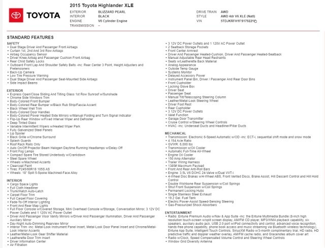 2015 Toyota Highlander XLE AWD 8-Passenger 158060 Miles Blizzard Pearl SUV 3.5L