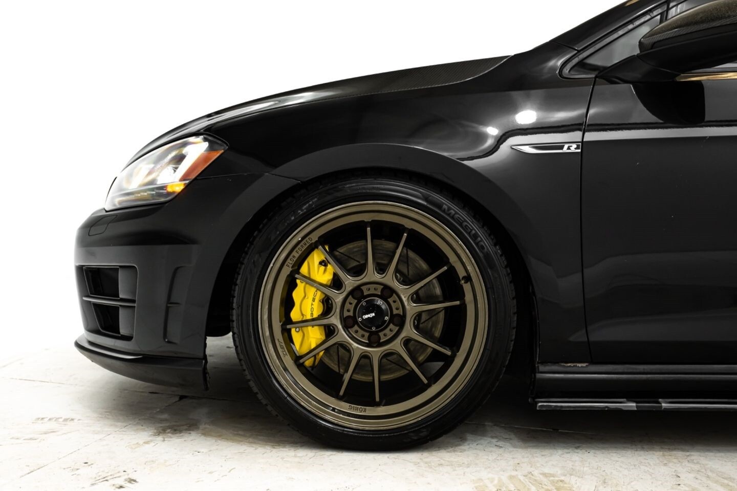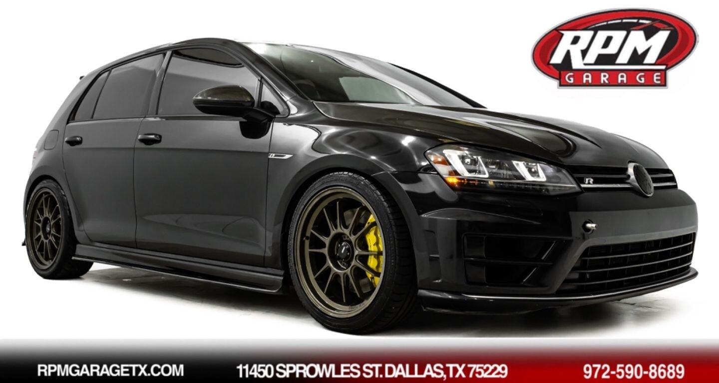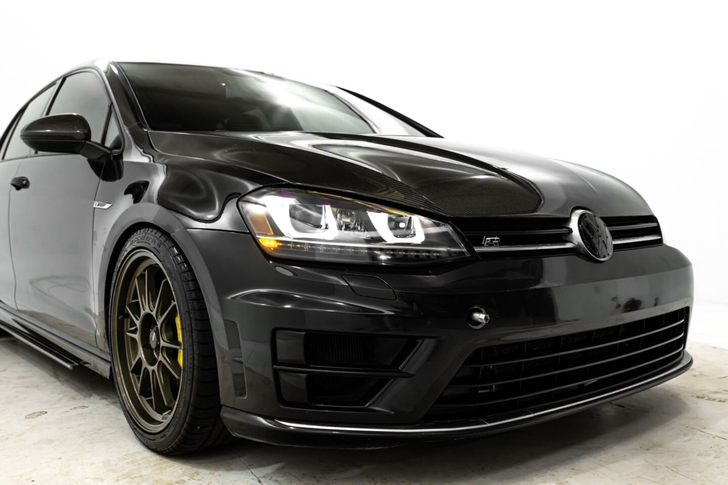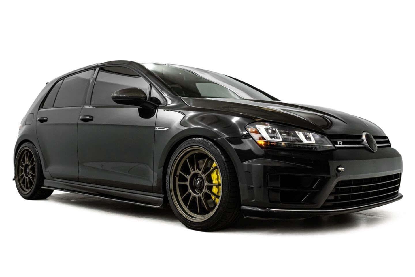This 2016 Volkswagen Golf R 4MOTION is a capable hot-hatchback that has been taken to the next level with several high-octane modifications. Under the hood is a turbocharged 2.0-liter inline four-cylinder engine that produces 292 horsepower and 280 lb-ft of torque, all of which is sent through a six-speed automatic transmission to all four wheels. The engine is not stock, however, having received an APR Stage 3 Full Frame upgraded turbocharger kit, as well as several supporting upgrades that include a Stage 2 fuel pump, an aftermarket high-flow fuel rail, an APR catless downpipe, an aftermarket catch can, and custom tuning on 93 octane, among many other modifications. This aggressive build comes equipped with 18" Konig Flow-Formed wheels and is finished in Deep Black Pearl, a subtle hue that belies this car's true capabilities. The exterior of this Volkswagen has been made even more unique with the addition of some cosmetic modifications, which include a vented carbon fiber hood, carbon fiber mirror caps, aftermarket side skirts, and a rear spoiler extension. In the interior, this Golf R offers heated leather "R" bucket seats, billet paddle shifter extensions, a vent-mounted P3 V3 OBDII multi-function gauge, a flat-bottomed leather "R" steering wheel, multi-zone A/C, and an infotainment system with Bluetooth, apps, phone connectivity, CD, AM/FM radio, AUX, and a backup camera, truly making this car the complete package.
