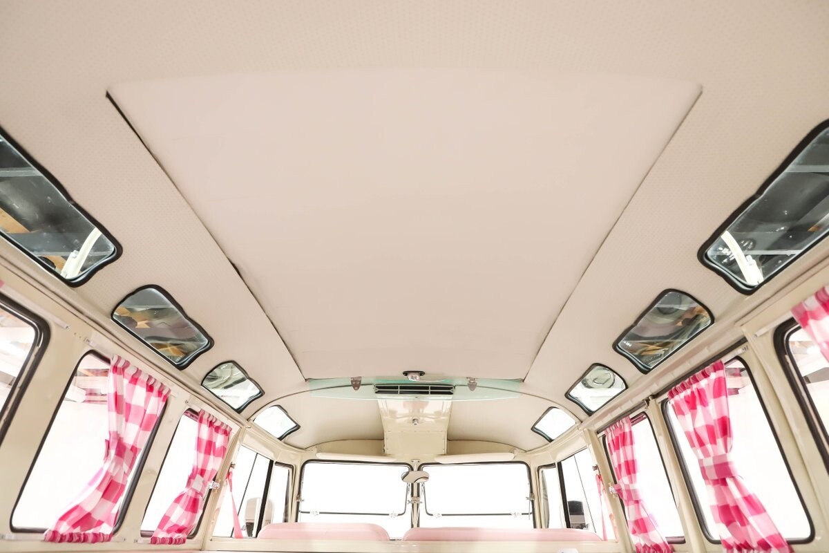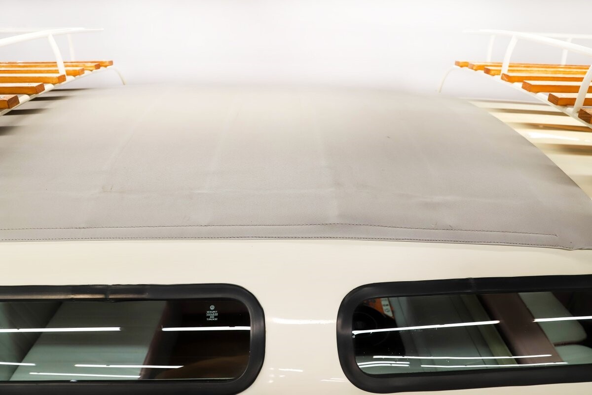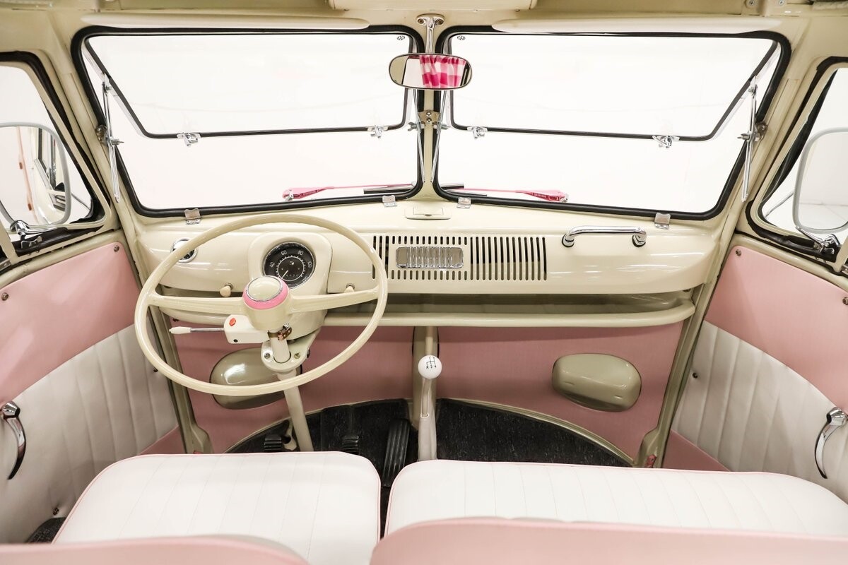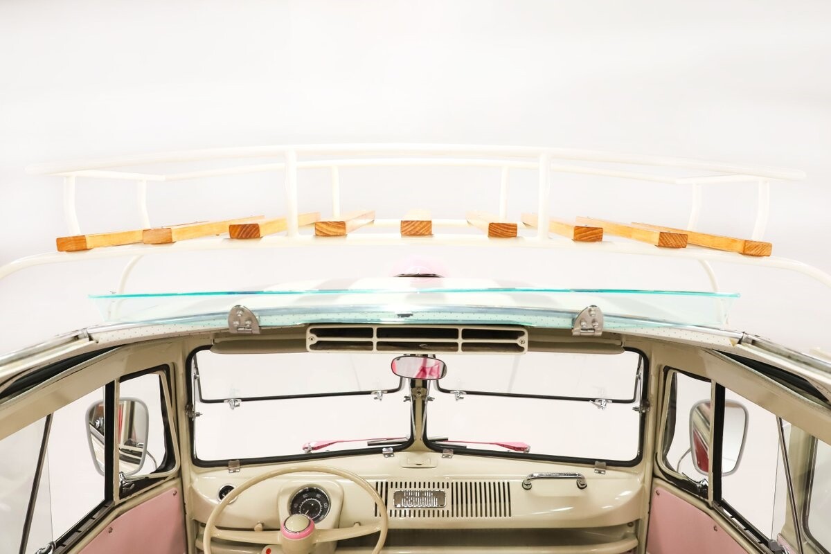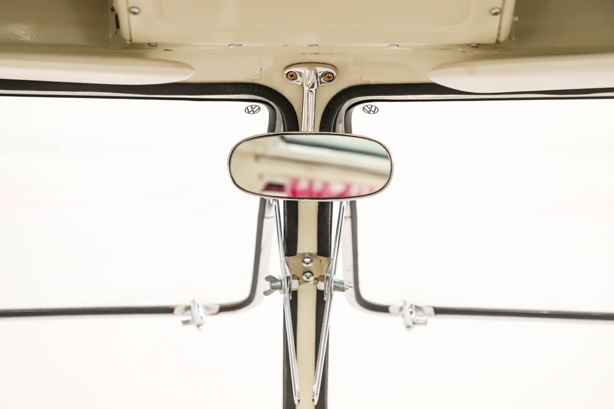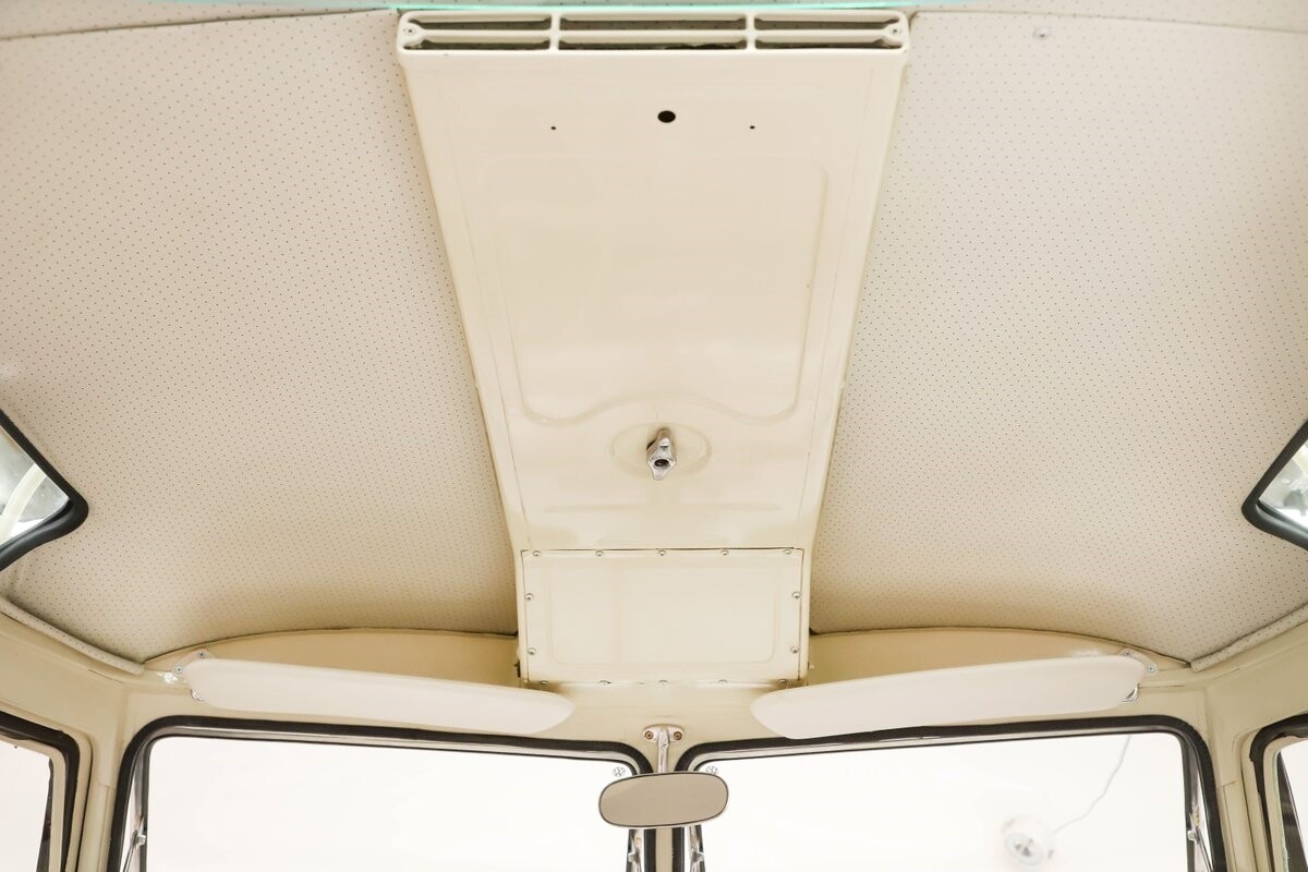 EXTERIOR: This Samba is decked out. It has the famous 23 windows, two luggage racks, a sliding convertible roof with a wind deflector and cyclops light. Some of the windows pop open including the two front safari windshields. It has been completely restored. The body was restored and painted. The paint is smooth and glossy. The two tones are broken up with a polished aluminum band which also enhances the V design in front. The glass and gaskets look new. The convertible roof is new and functions easily. Mirrors, handles, taillights and the chrome VW in front all look new. It rides on new radial tires with white walls. The rims are painted and have new trim.