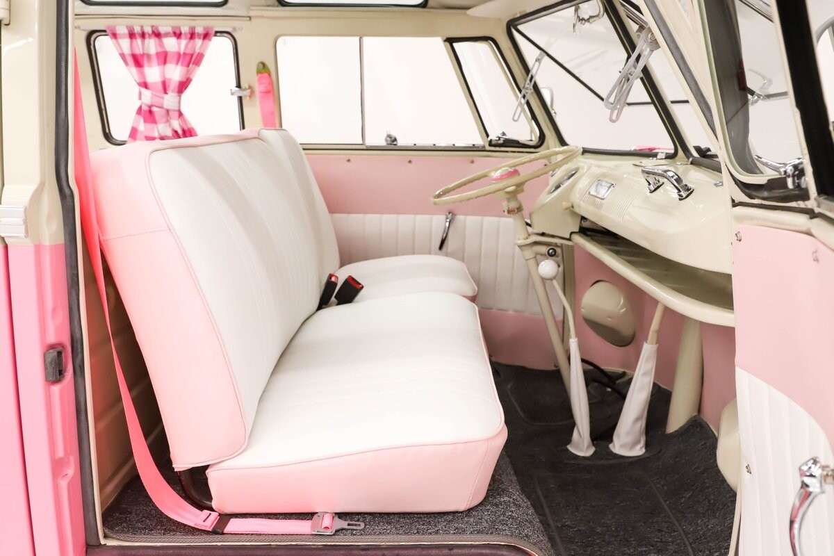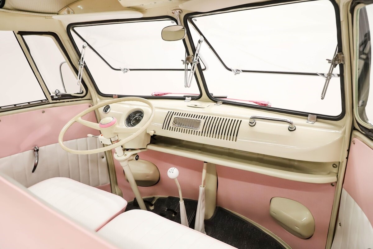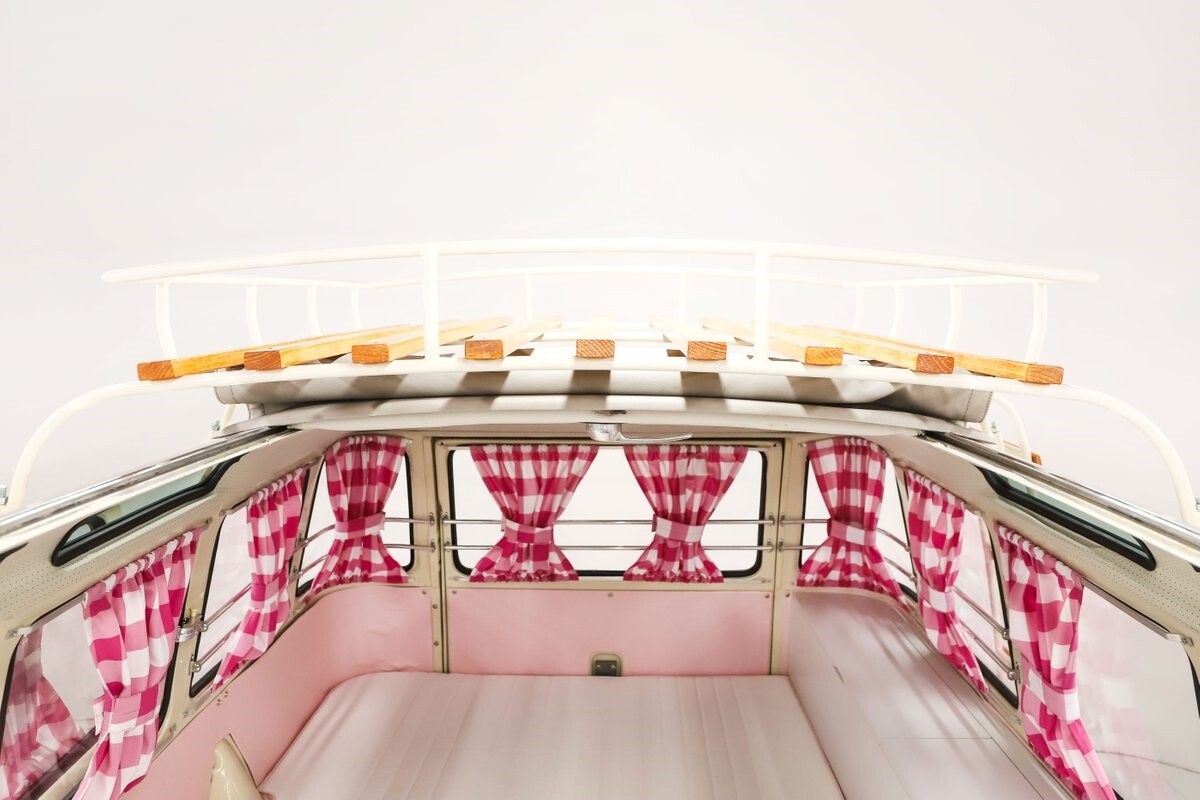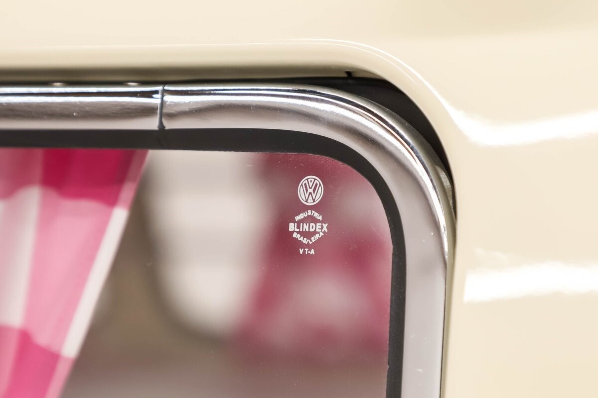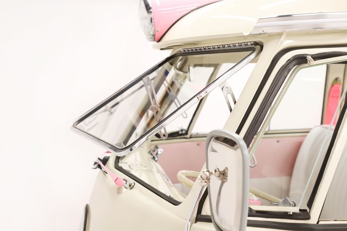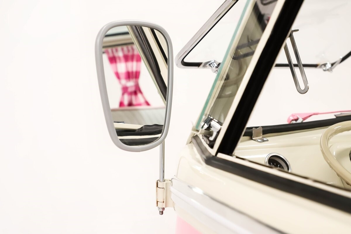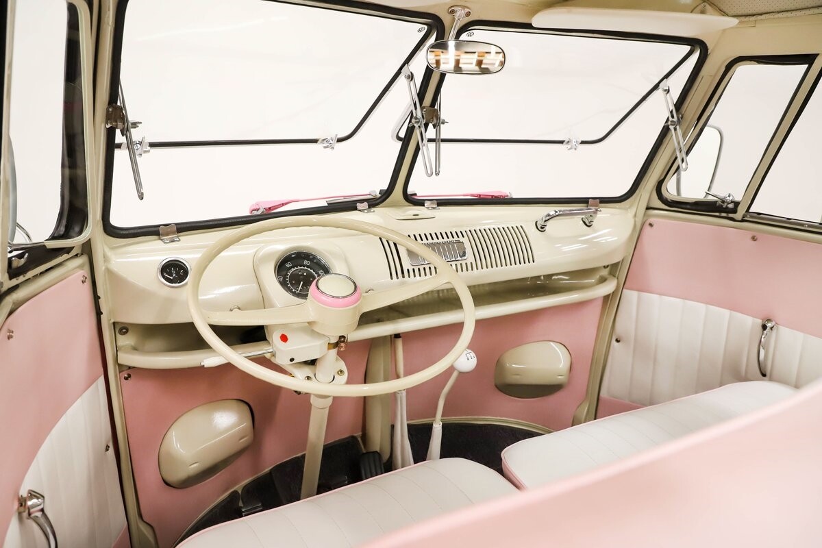 EXTERIOR: This Samba is decked out. It has the famous 23 windows, two luggage racks, a sliding convertible roof with a wind deflector and cyclops light. Some of the windows pop open including the two front safari windshields. It has been completely restored. The body was restored and painted. The paint is smooth and glossy. The two tones are broken up with a polished aluminum band which also enhances the V design in front. The glass and gaskets look new. The convertible roof is new and functions easily. Mirrors, handles, taillights and the chrome VW in front all look new. It rides on new radial tires with white walls. The rims are painted and have new trim.