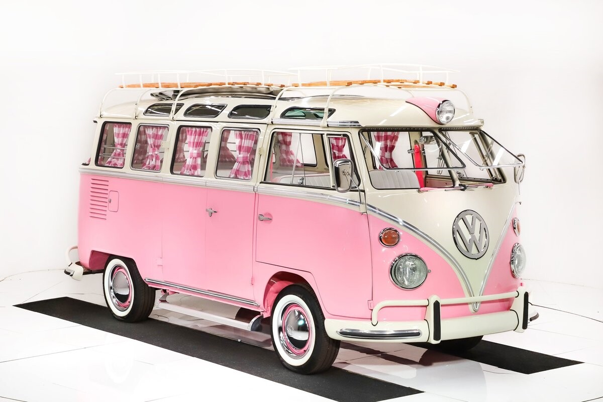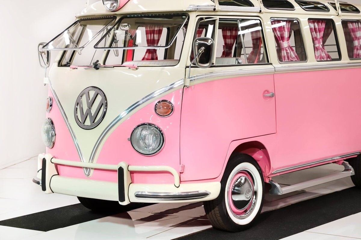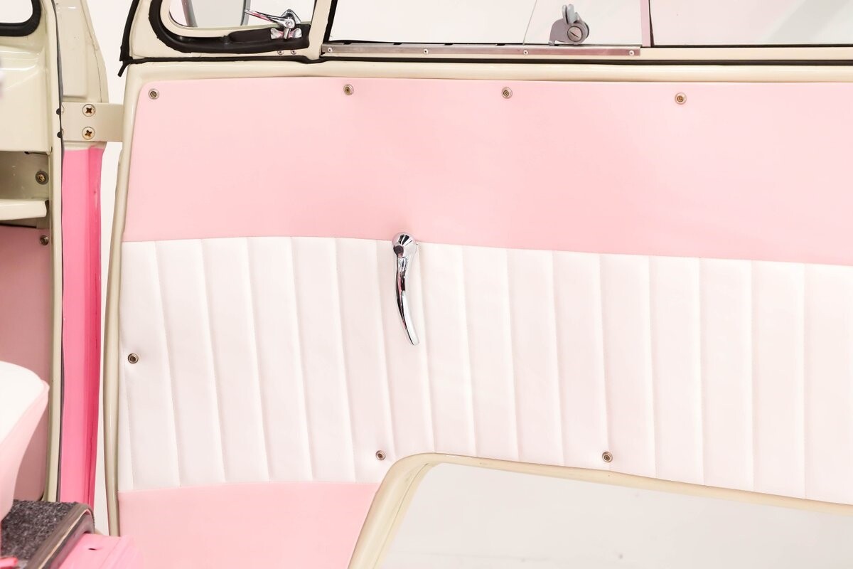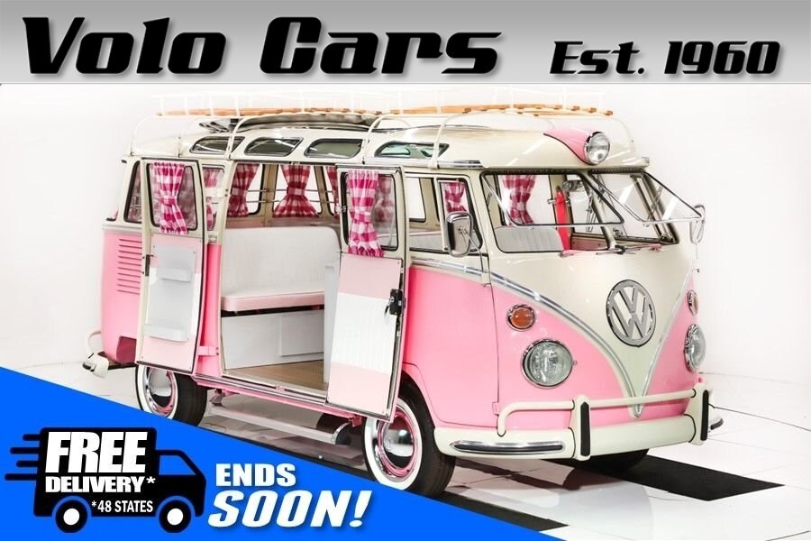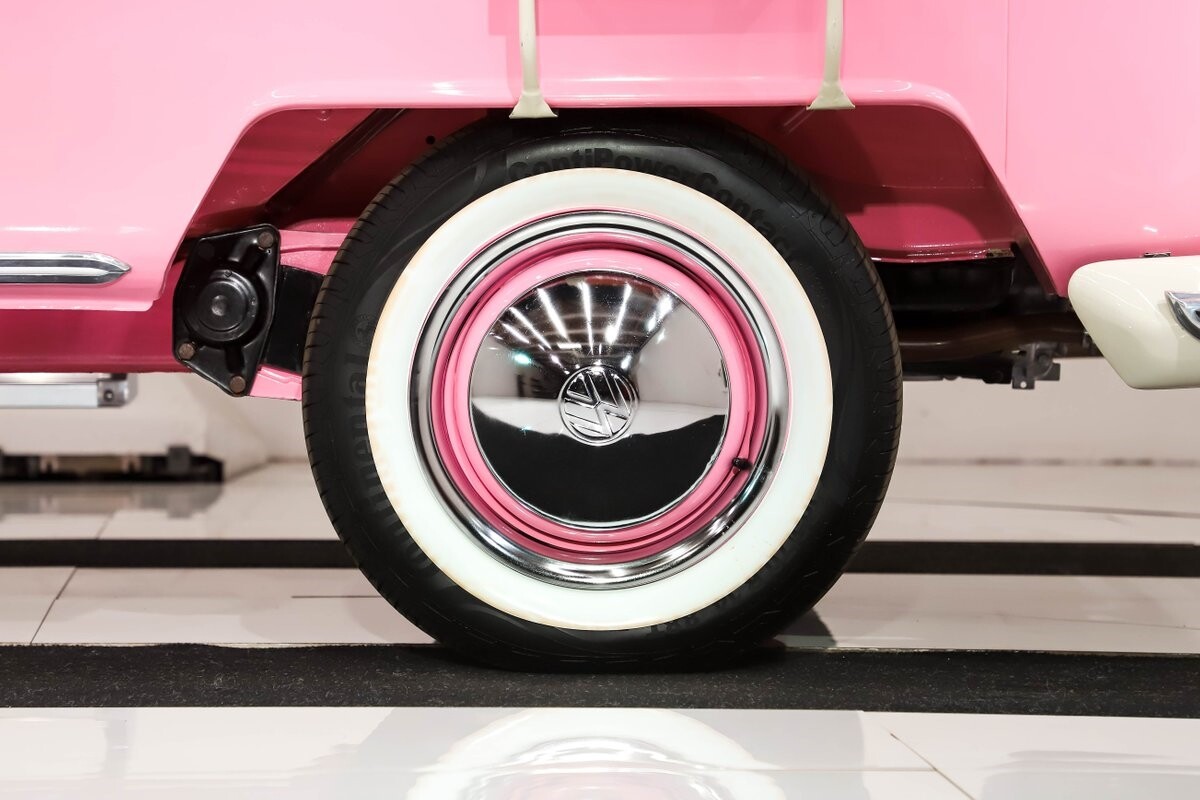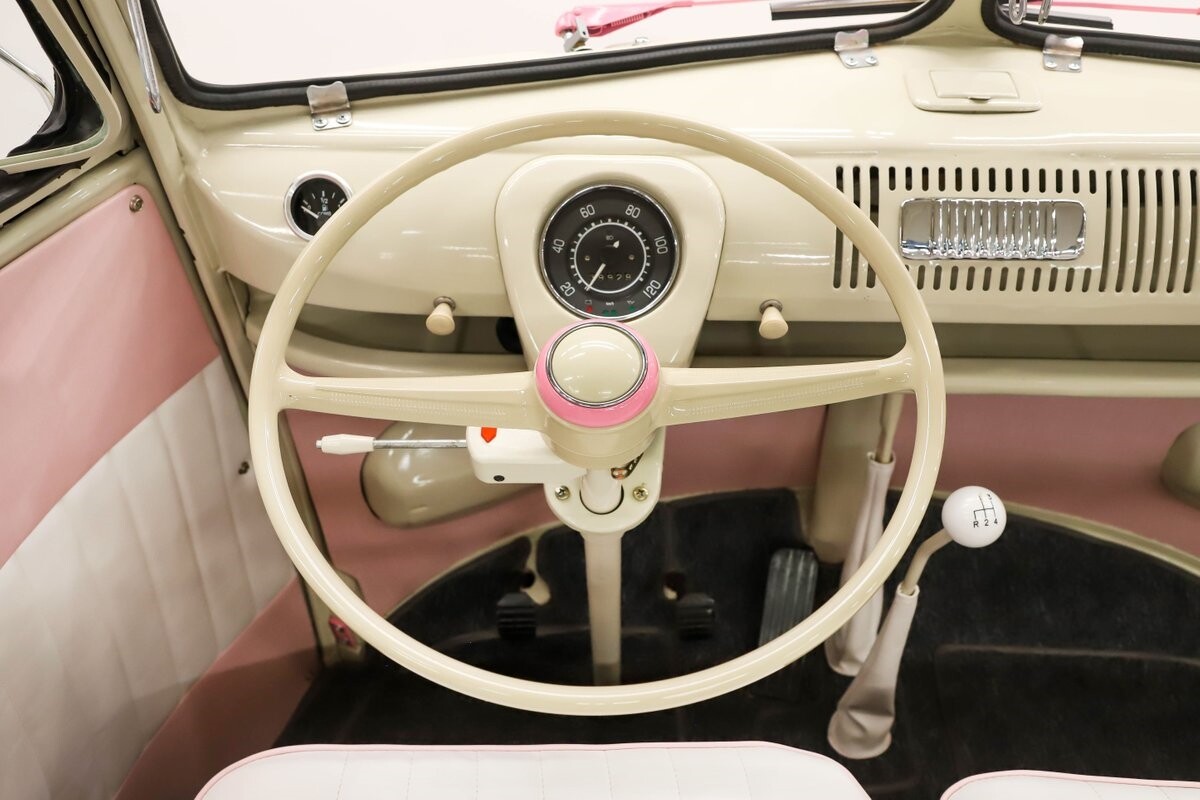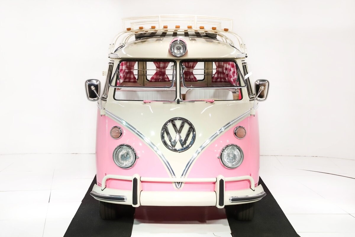 EXTERIOR: This Samba is decked out. It has the famous 23 windows, two luggage racks, a sliding convertible roof with a wind deflector and cyclops light. Some of the windows pop open including the two front safari windshields. It has been completely restored. The body was restored and painted. The paint is smooth and glossy. The two tones are broken up with a polished aluminum band which also enhances the V design in front. The glass and gaskets look new. The convertible roof is new and functions easily. Mirrors, handles, taillights and the chrome VW in front all look new. It rides on new radial tires with white walls. The rims are painted and have new trim.