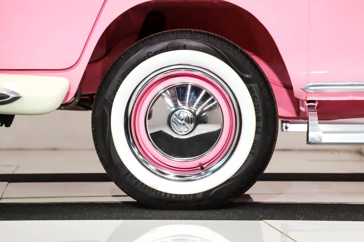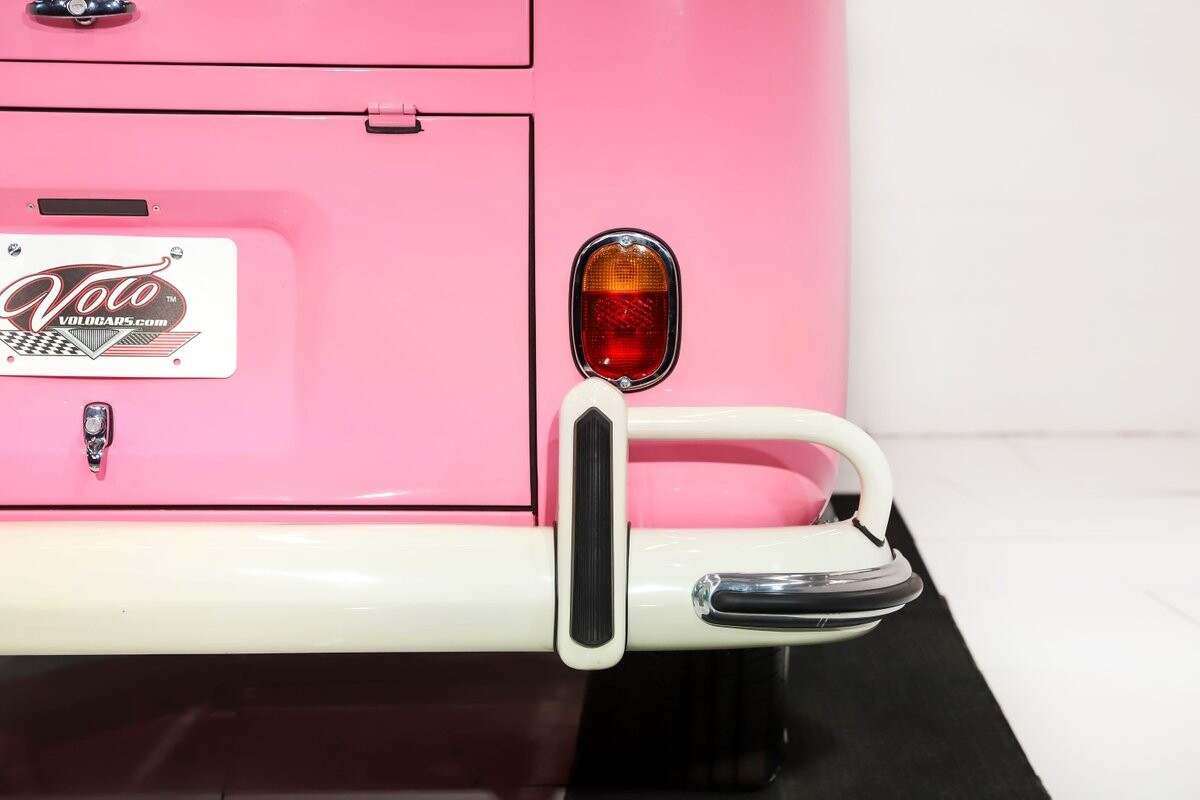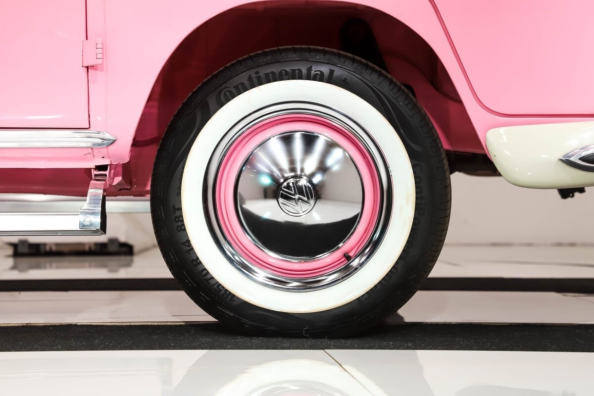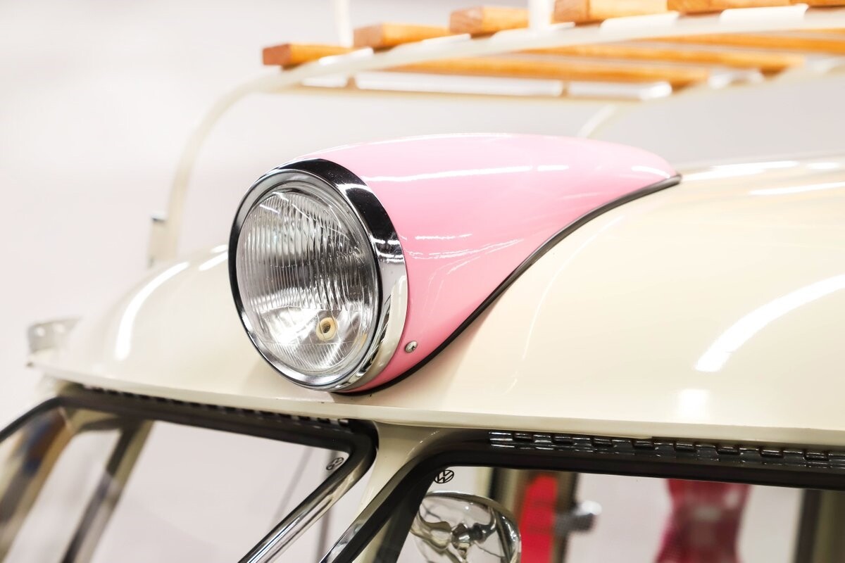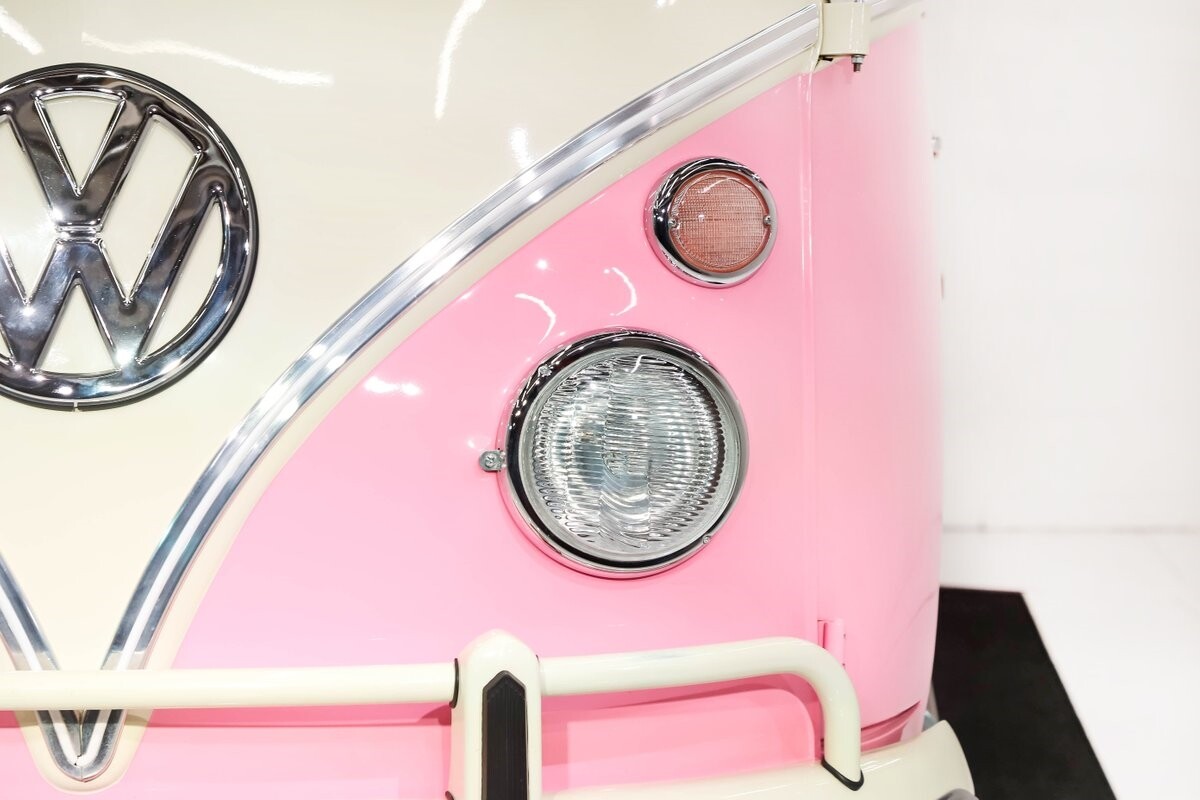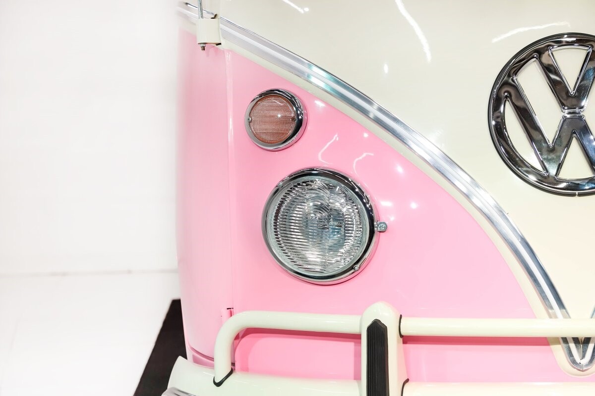 EXTERIOR: This Samba is decked out. It has the famous 23 windows, two luggage racks, a sliding convertible roof with a wind deflector and cyclops light. Some of the windows pop open including the two front safari windshields. It has been completely restored. The body was restored and painted. The paint is smooth and glossy. The two tones are broken up with a polished aluminum band which also enhances the V design in front. The glass and gaskets look new. The convertible roof is new and functions easily. Mirrors, handles, taillights and the chrome VW in front all look new. It rides on new radial tires with white walls. The rims are painted and have new trim.