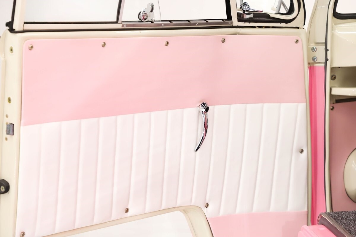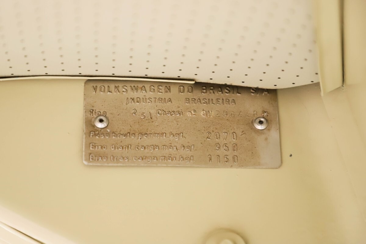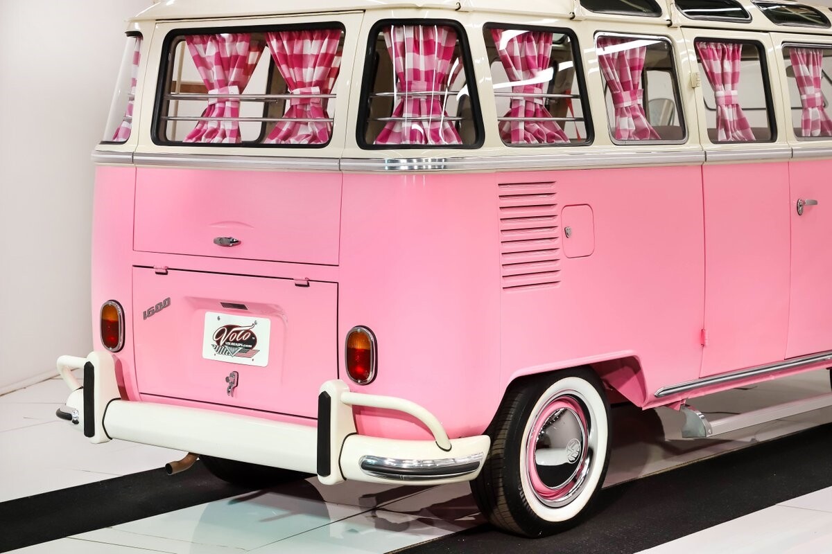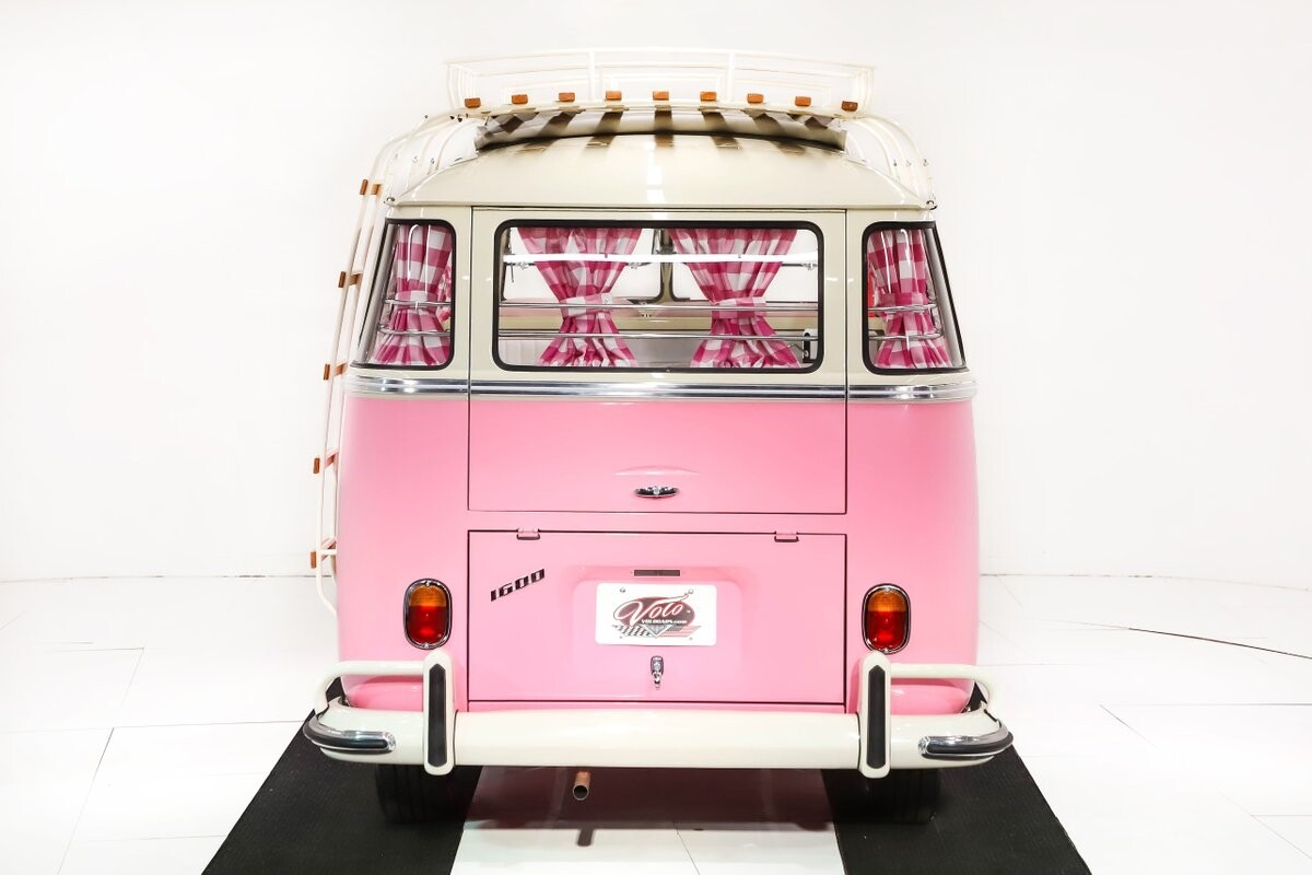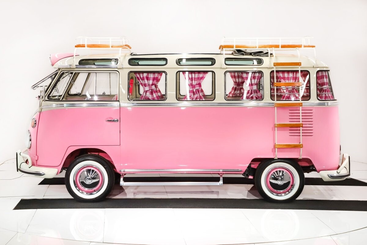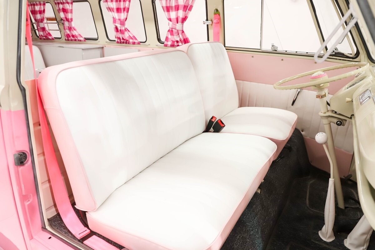 EXTERIOR: This Samba is decked out. It has the famous 23 windows, two luggage racks, a sliding convertible roof with a wind deflector and cyclops light. Some of the windows pop open including the two front safari windshields. It has been completely restored. The body was restored and painted. The paint is smooth and glossy. The two tones are broken up with a polished aluminum band which also enhances the V design in front. The glass and gaskets look new. The convertible roof is new and functions easily. Mirrors, handles, taillights and the chrome VW in front all look new. It rides on new radial tires with white walls. The rims are painted and have new trim.