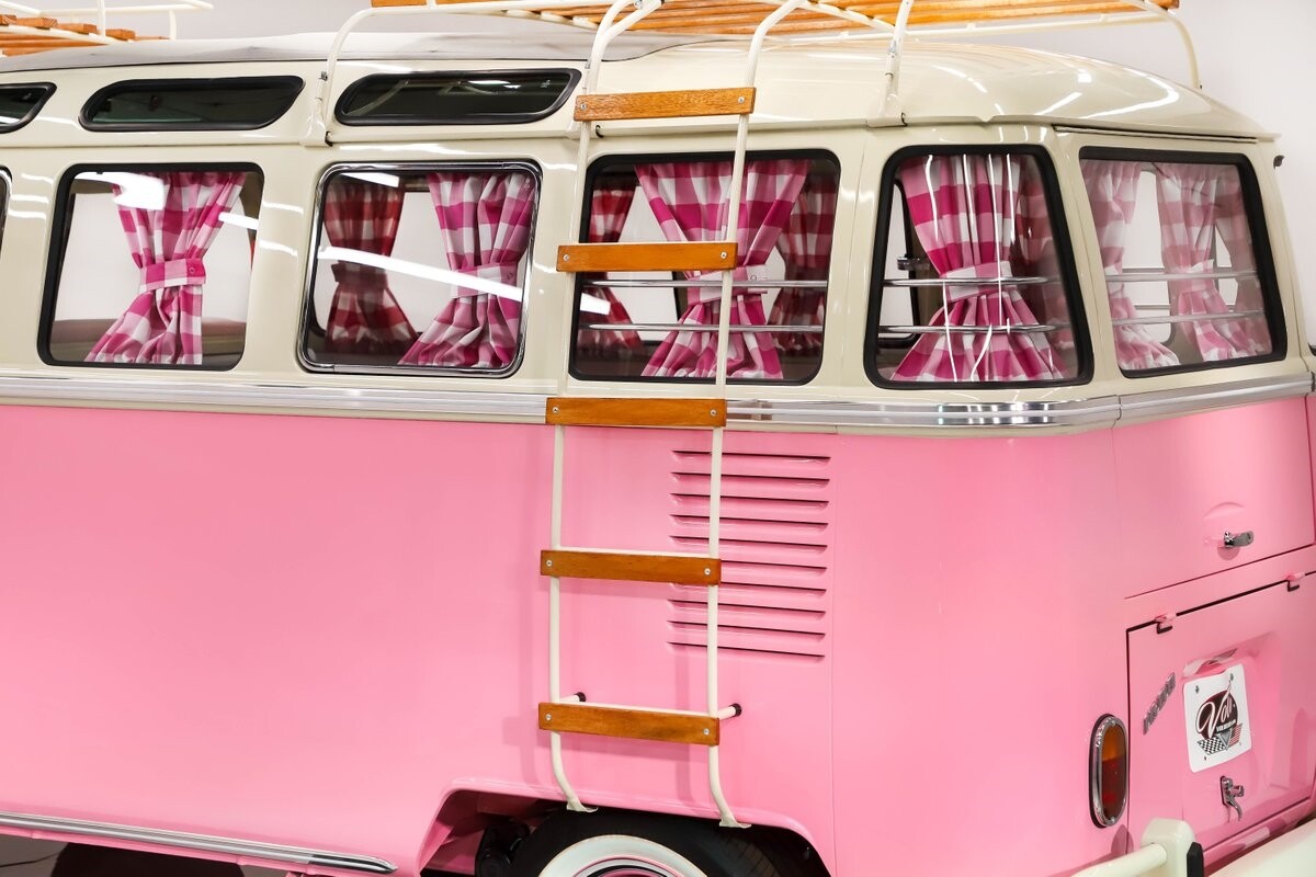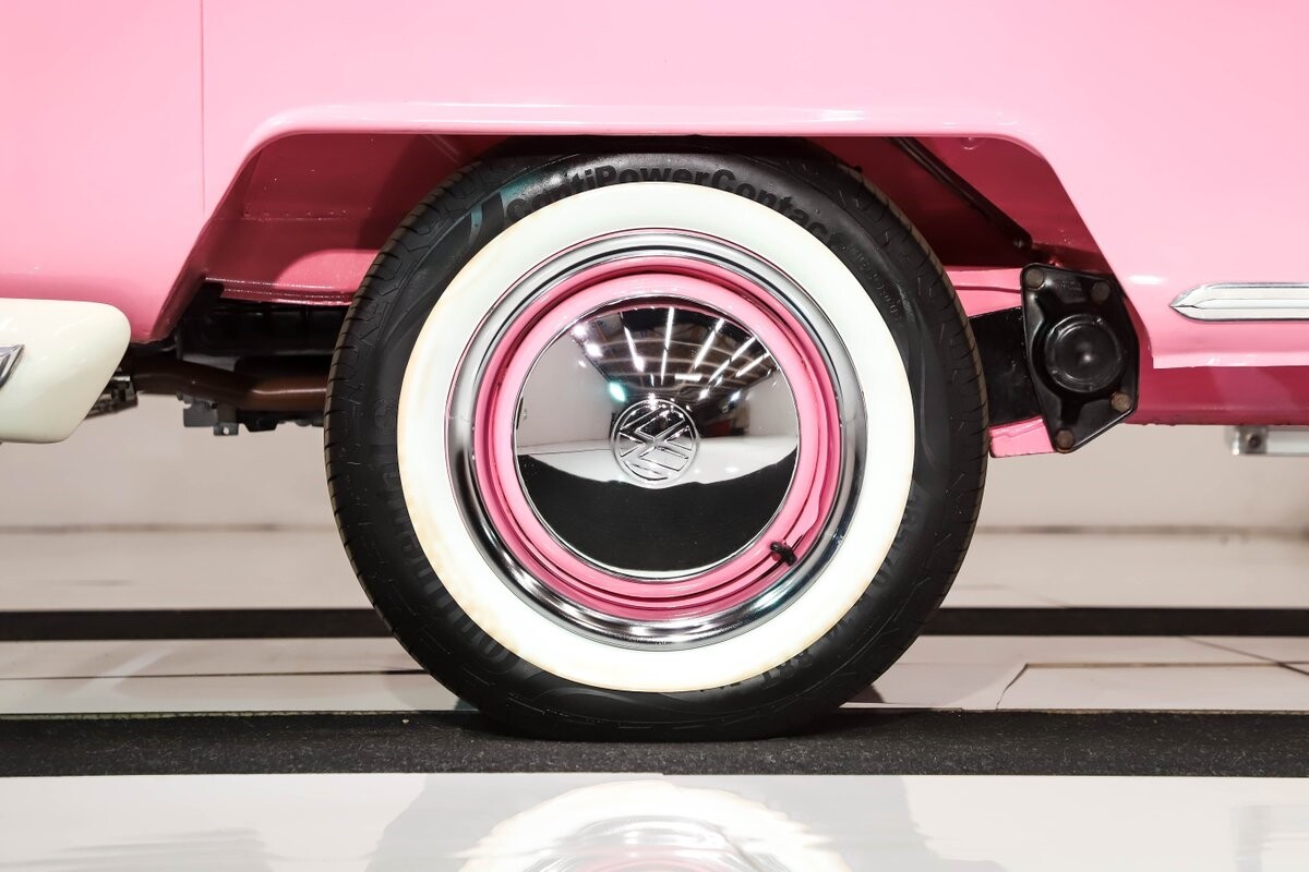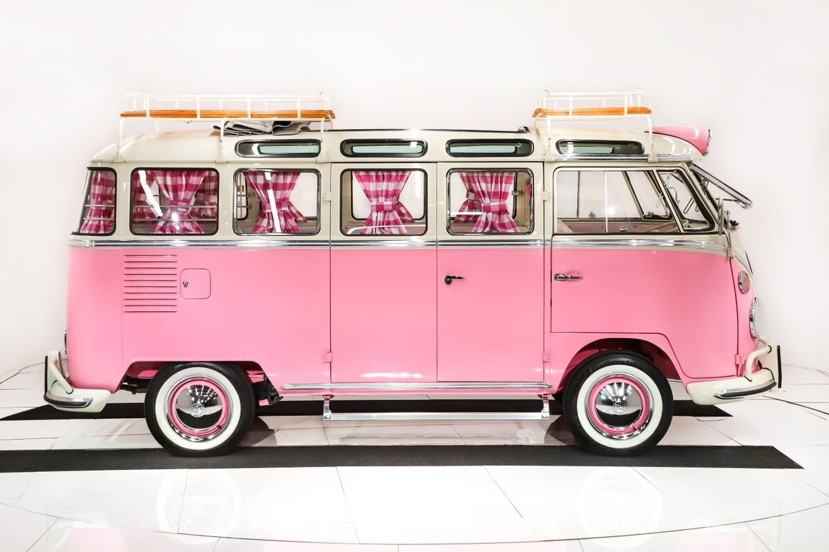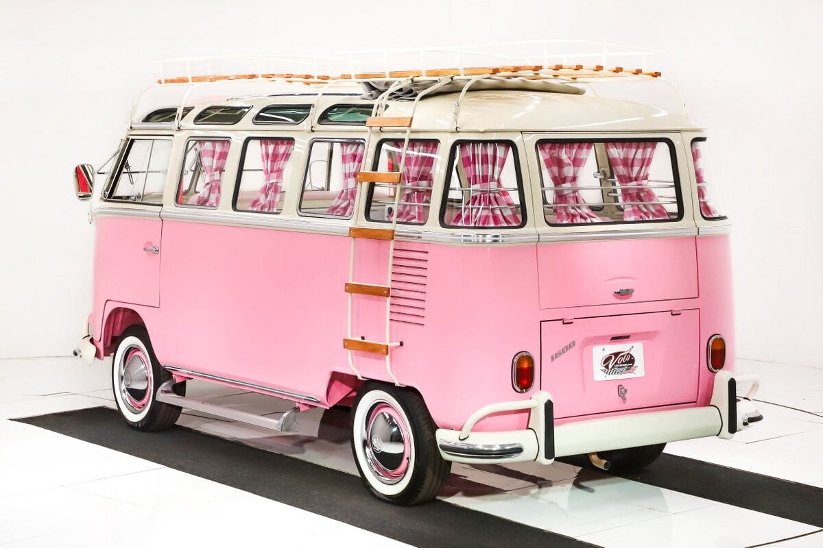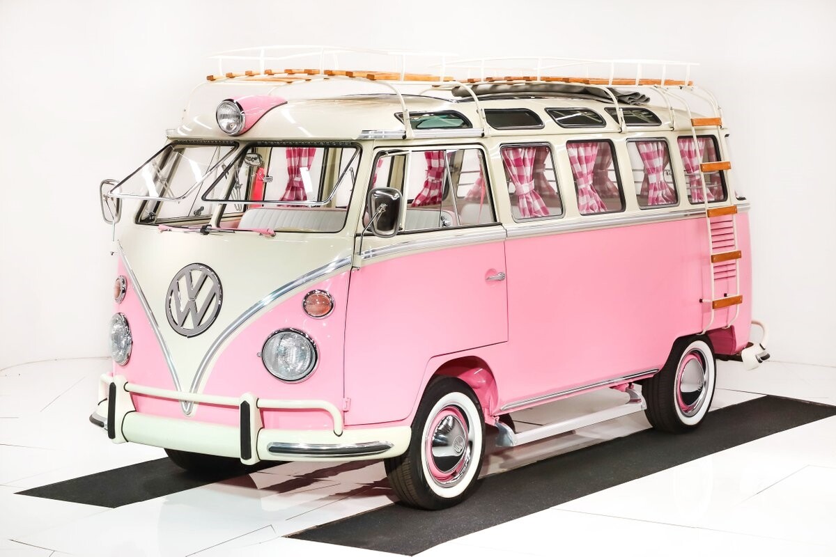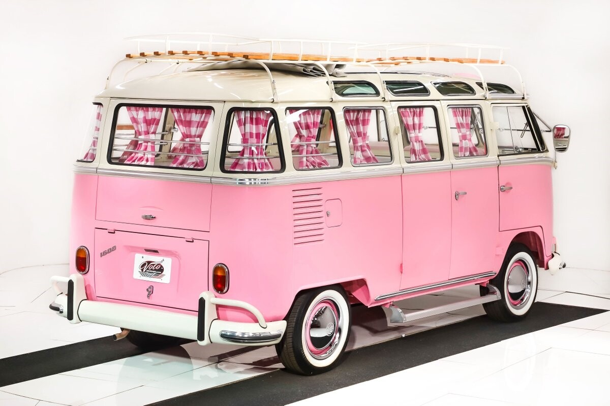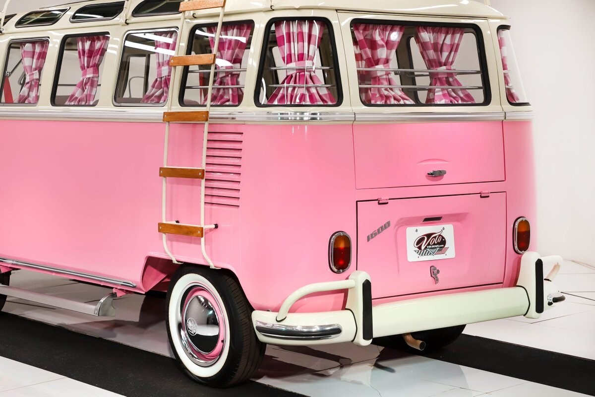 EXTERIOR: This Samba is decked out. It has the famous 23 windows, two luggage racks, a sliding convertible roof with a wind deflector and cyclops light. Some of the windows pop open including the two front safari windshields. It has been completely restored. The body was restored and painted. The paint is smooth and glossy. The two tones are broken up with a polished aluminum band which also enhances the V design in front. The glass and gaskets look new. The convertible roof is new and functions easily. Mirrors, handles, taillights and the chrome VW in front all look new. It rides on new radial tires with white walls. The rims are painted and have new trim.