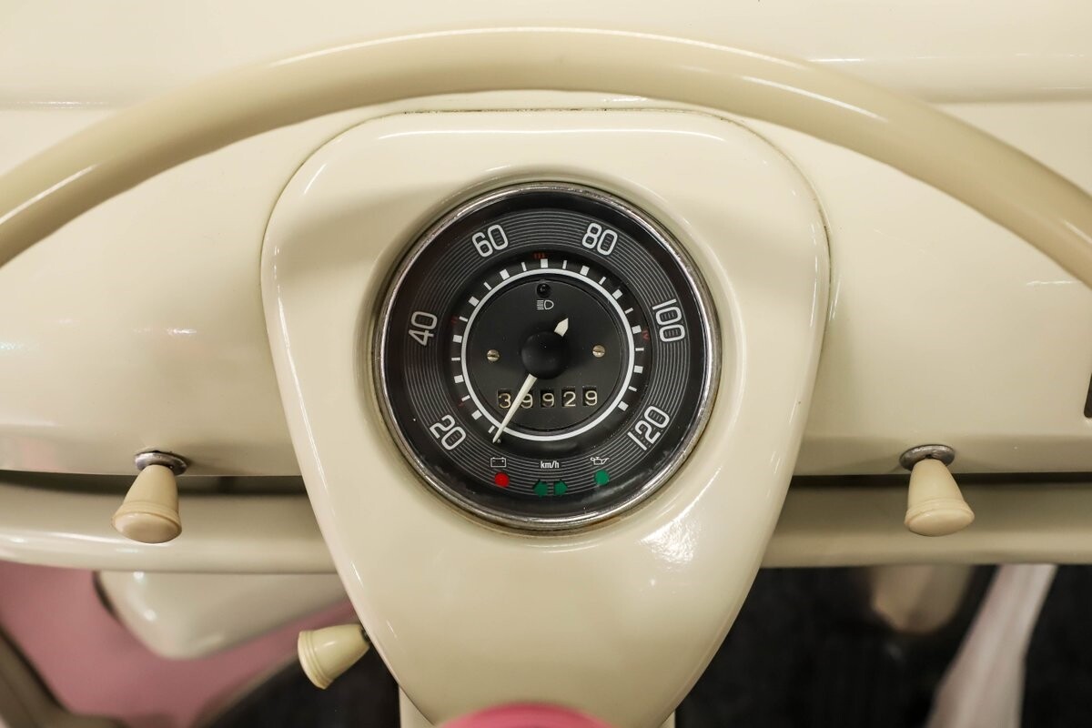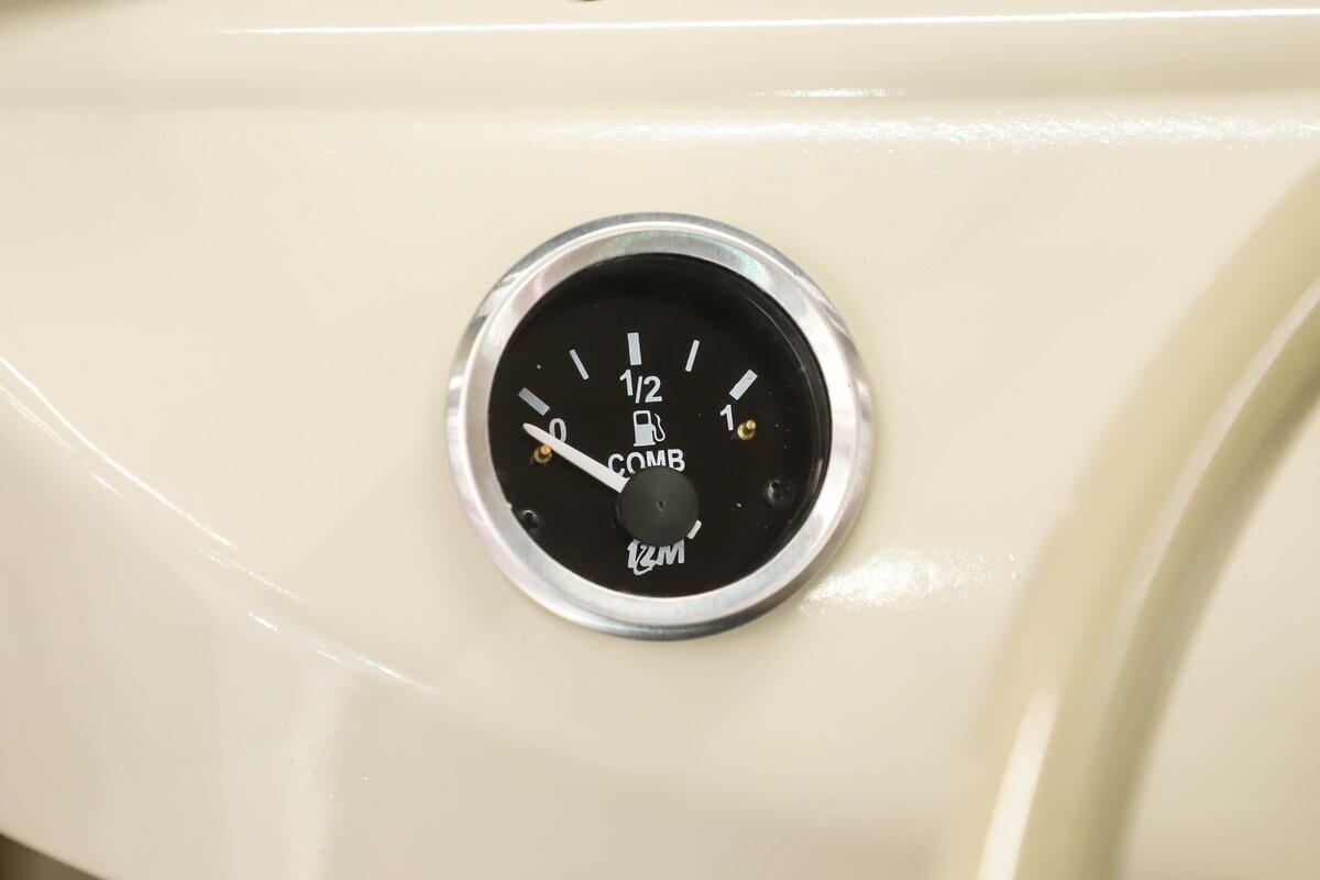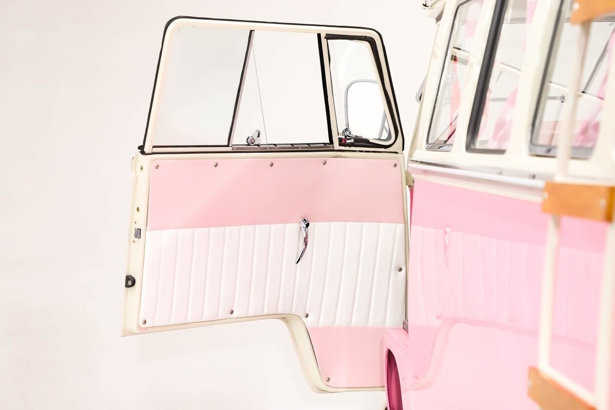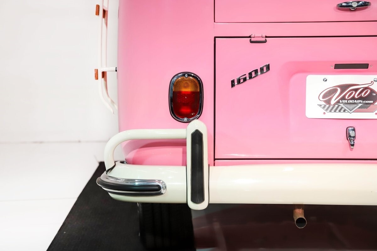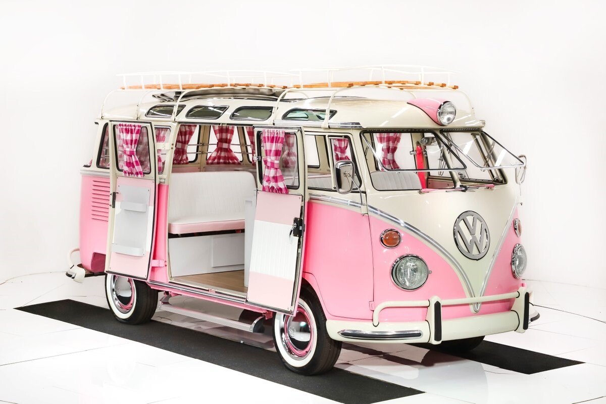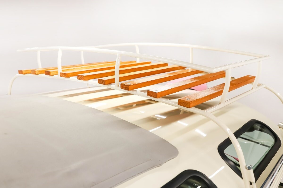 EXTERIOR: This Samba is decked out. It has the famous 23 windows, two luggage racks, a sliding convertible roof with a wind deflector and cyclops light. Some of the windows pop open including the two front safari windshields. It has been completely restored. The body was restored and painted. The paint is smooth and glossy. The two tones are broken up with a polished aluminum band which also enhances the V design in front. The glass and gaskets look new. The convertible roof is new and functions easily. Mirrors, handles, taillights and the chrome VW in front all look new. It rides on new radial tires with white walls. The rims are painted and have new trim.