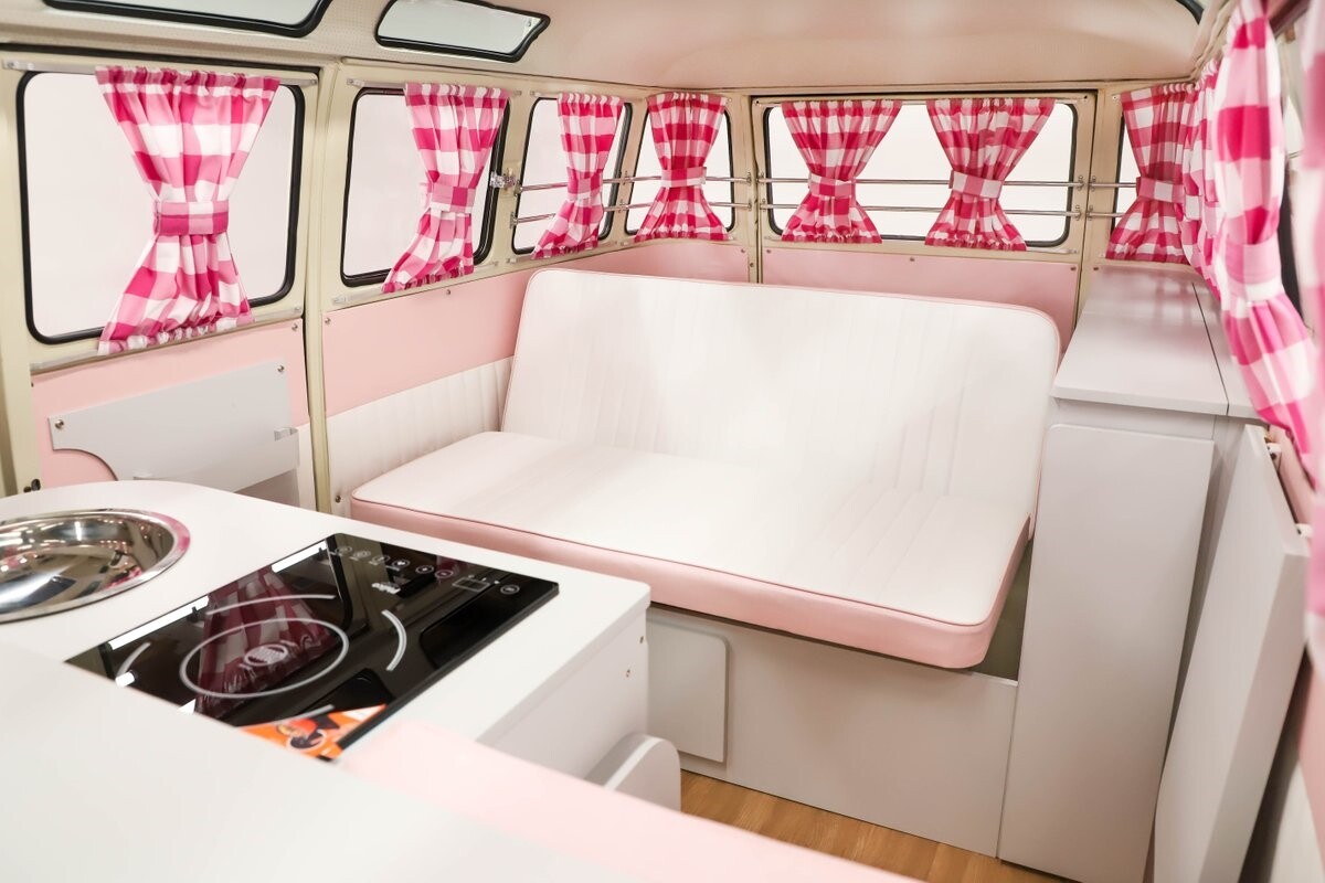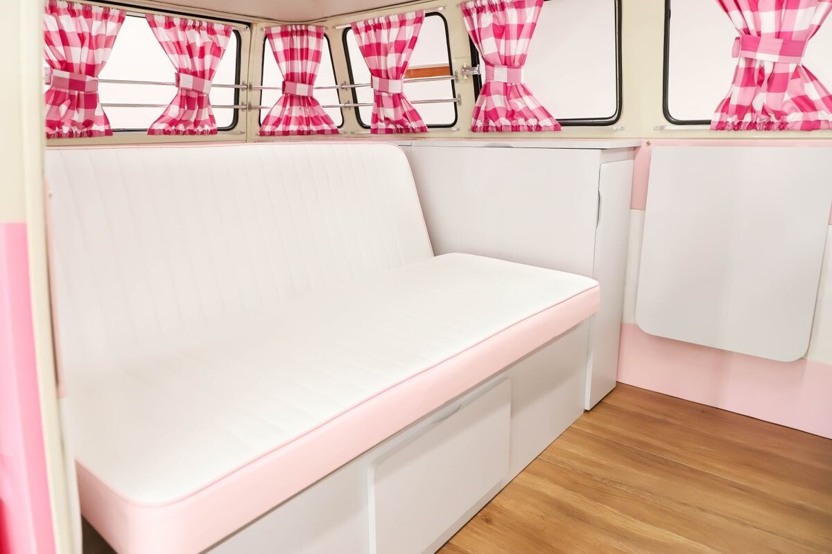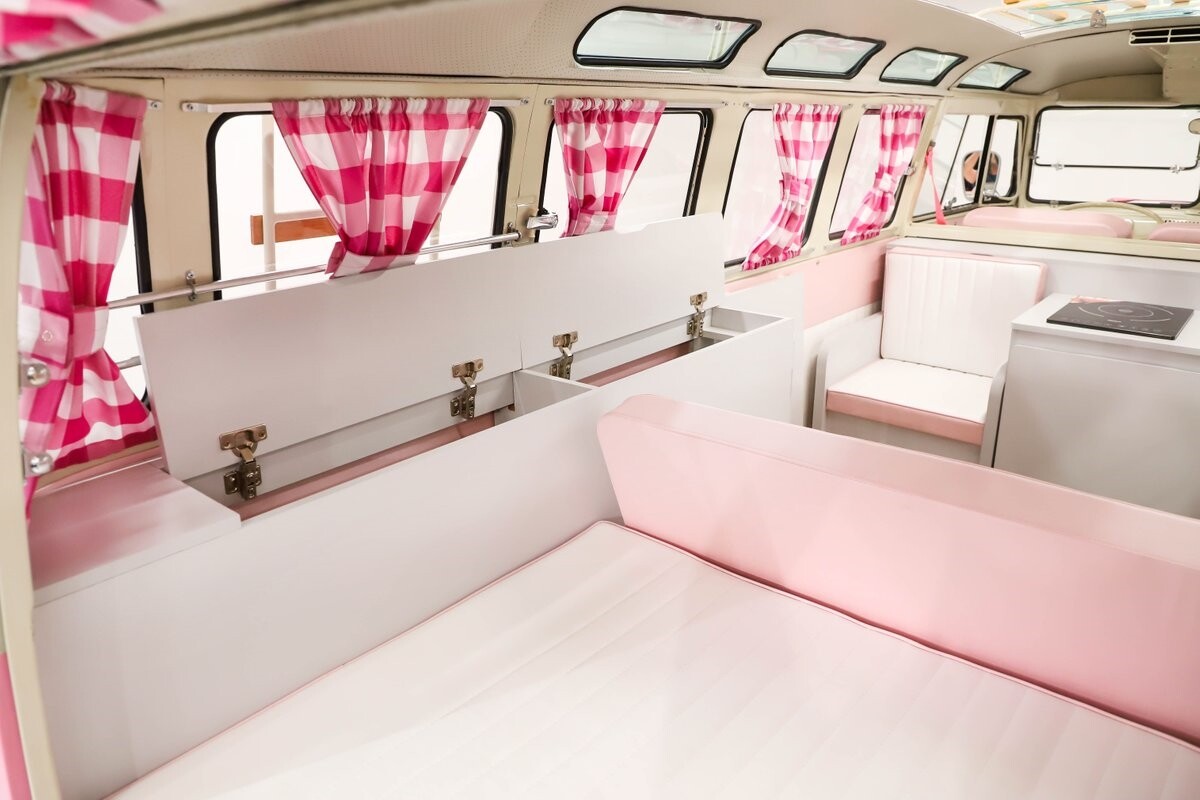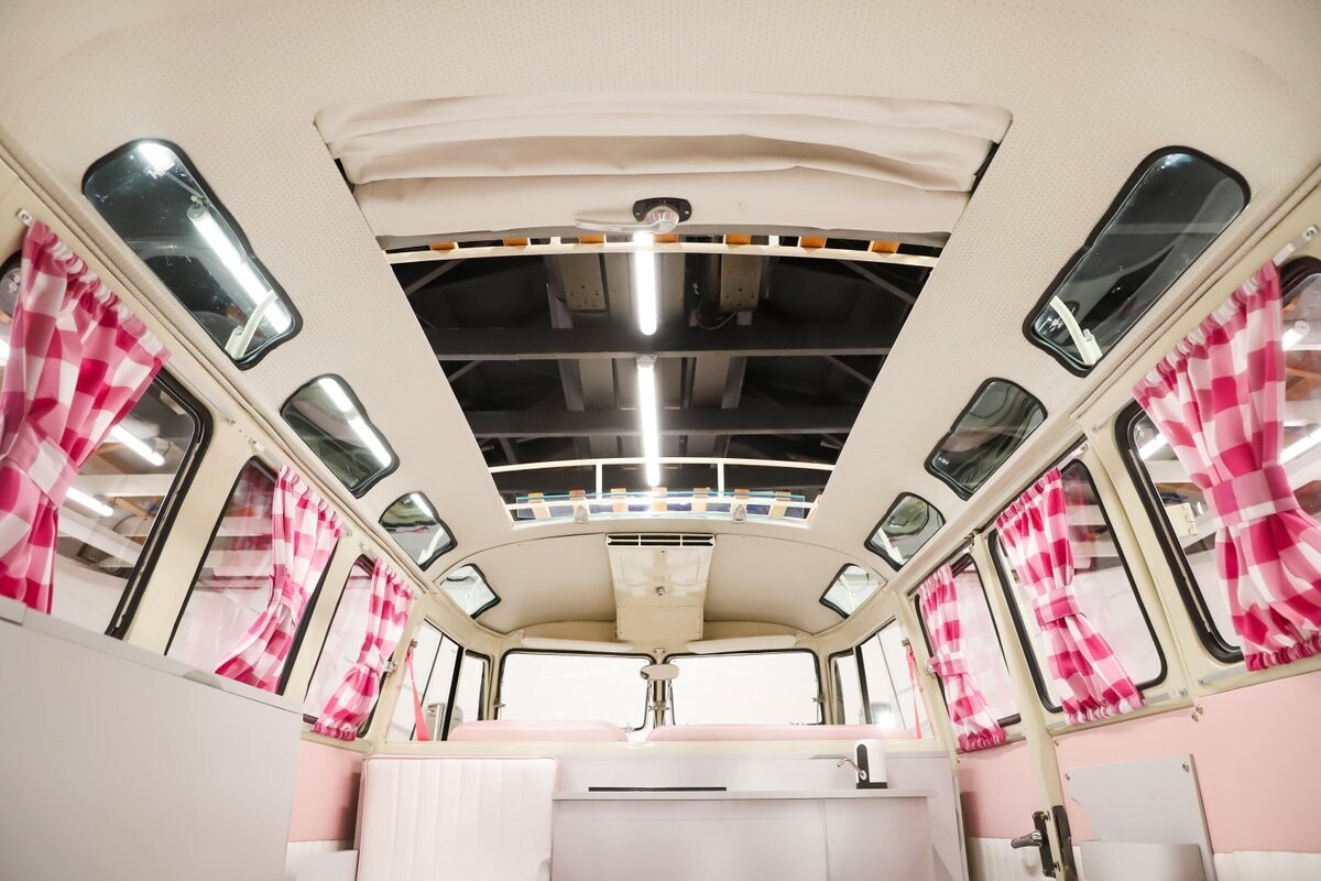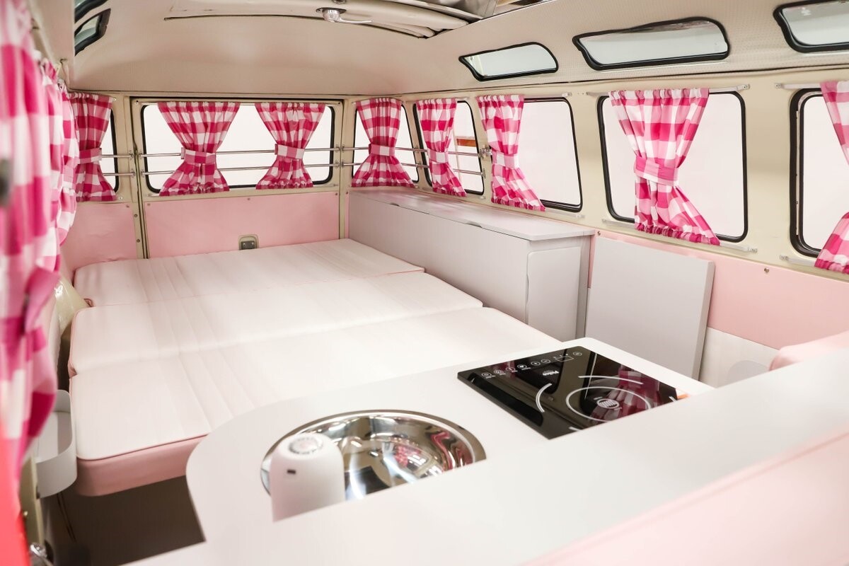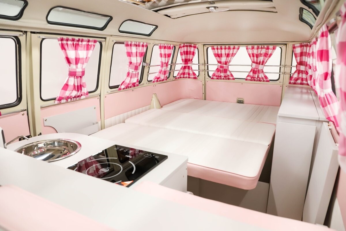 INTERIOR: It is brand new inside this camper bus. The entire inside was gutted, prepped, and painted. Up front the seats have new cushions and are reupholstered. The door panels are done to match. Overhead has the fresh air ventilation system and new visors. Down on the floor it has new carpet with bound edges. In the camper section it has professionally built custom laminate cabinets. The panels are finished on all sides and have premium hinges. There is lots of storage. There's a table that folds out. The kitchen area has a new never used sink, electric stove top and a refrigerator. The bench seat folds flat and makes a bed. It has new laminate flooring. Overhead is a new white perforated headliner that stretches front to back. It also has nice looking curtains at each window. The upholstery and cushions are all new.