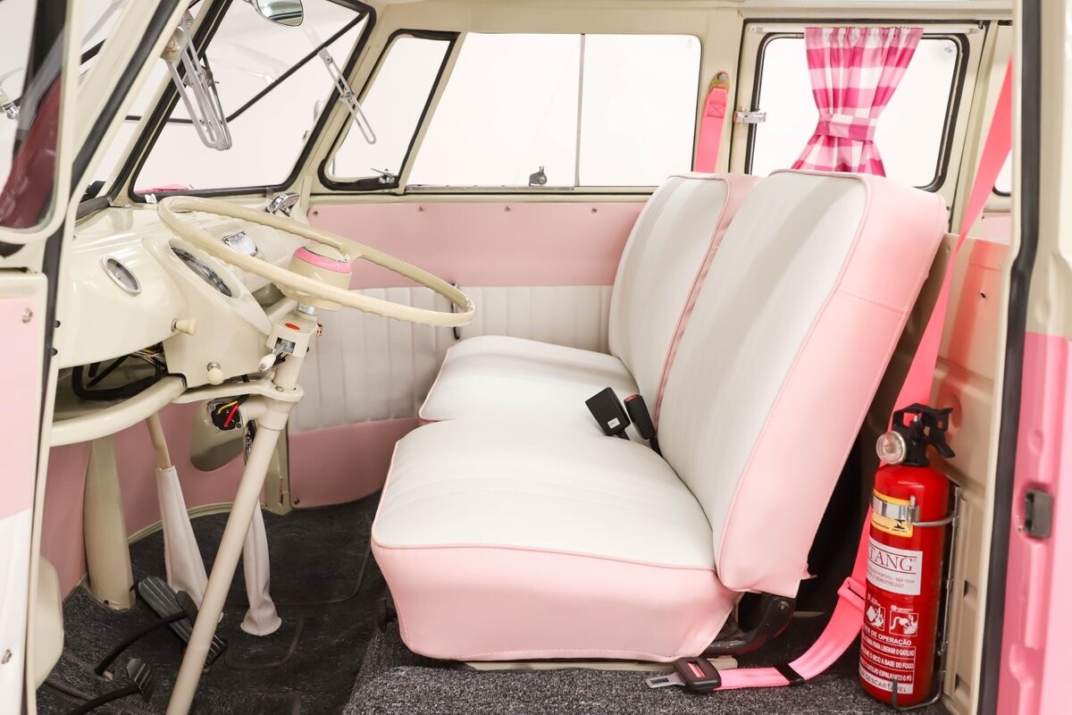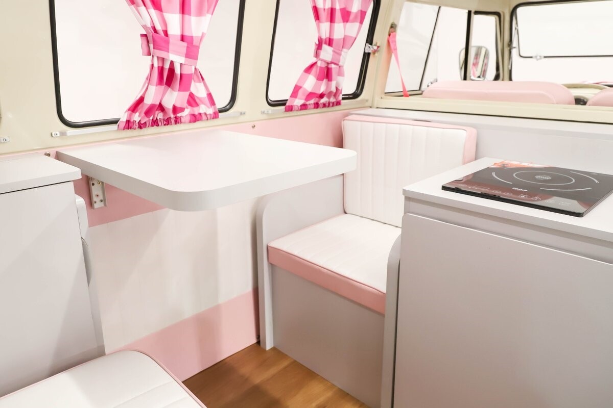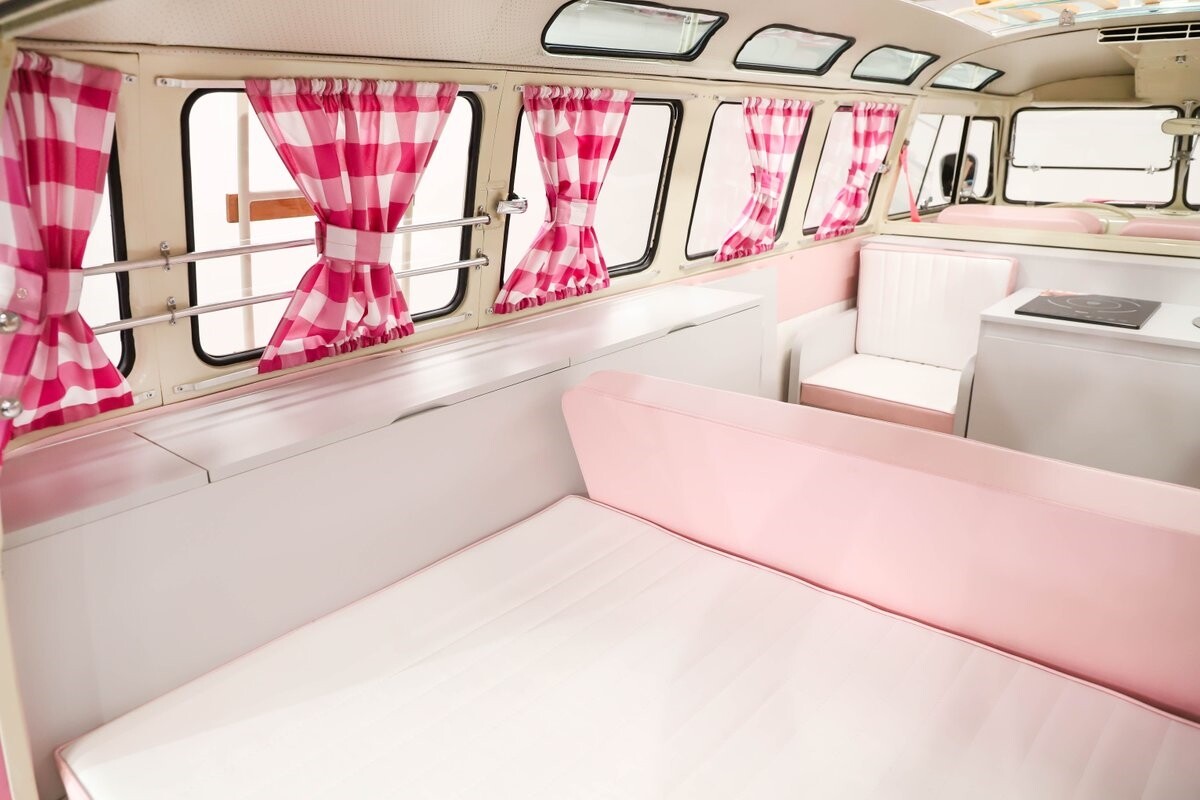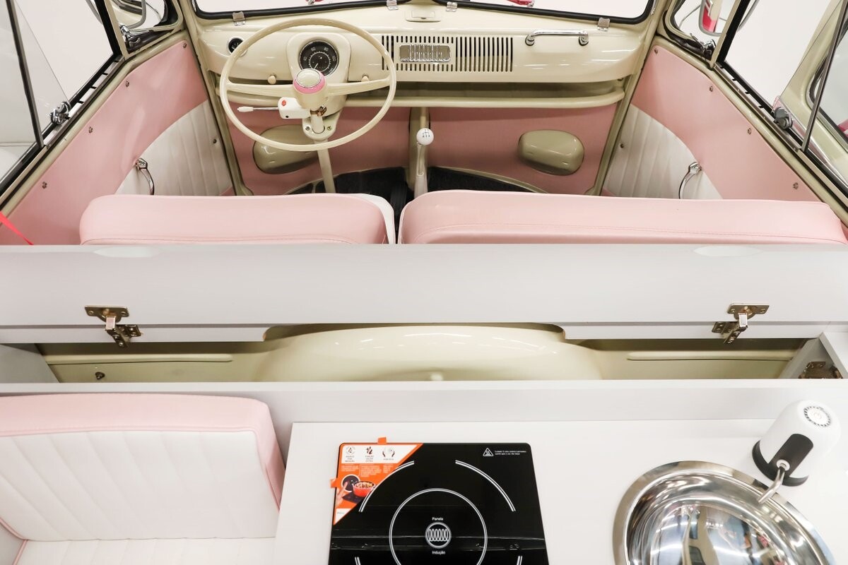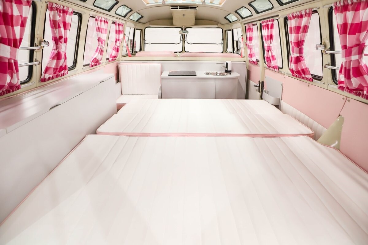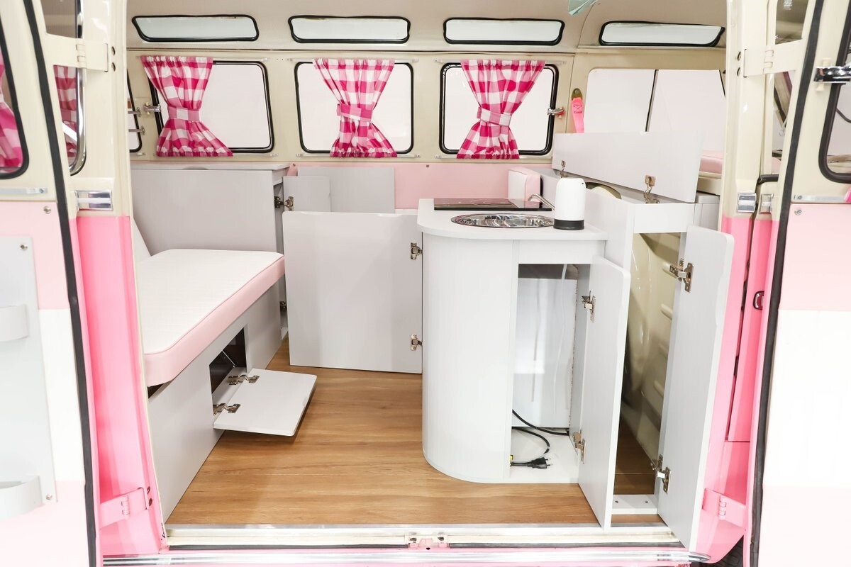 INTERIOR: It is brand new inside this camper bus. The entire inside was gutted, prepped, and painted. Up front the seats have new cushions and are reupholstered. The door panels are done to match. Overhead has the fresh air ventilation system and new visors. Down on the floor it has new carpet with bound edges. In the camper section it has professionally built custom laminate cabinets. The panels are finished on all sides and have premium hinges. There is lots of storage. There's a table that folds out. The kitchen area has a new never used sink, electric stove top and a refrigerator. The bench seat folds flat and makes a bed. It has new laminate flooring. Overhead is a new white perforated headliner that stretches front to back. It also has nice looking curtains at each window. The upholstery and cushions are all new.