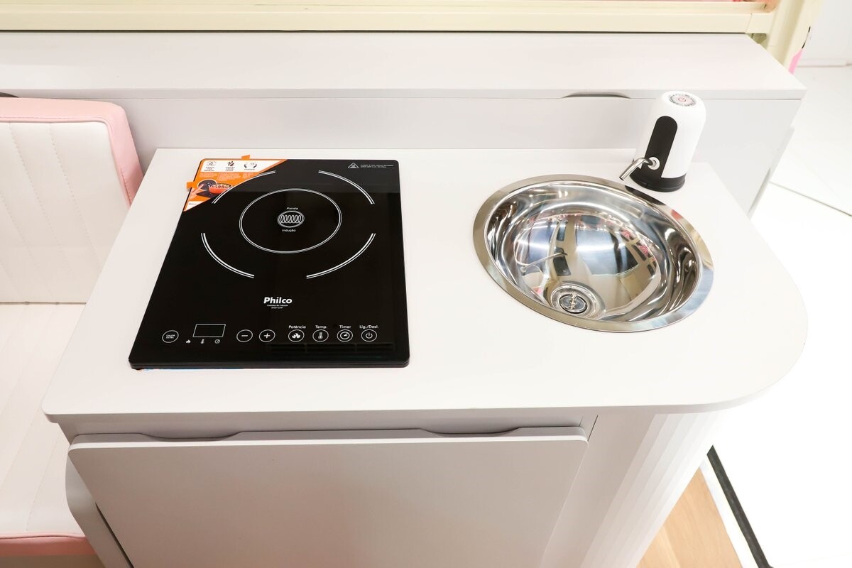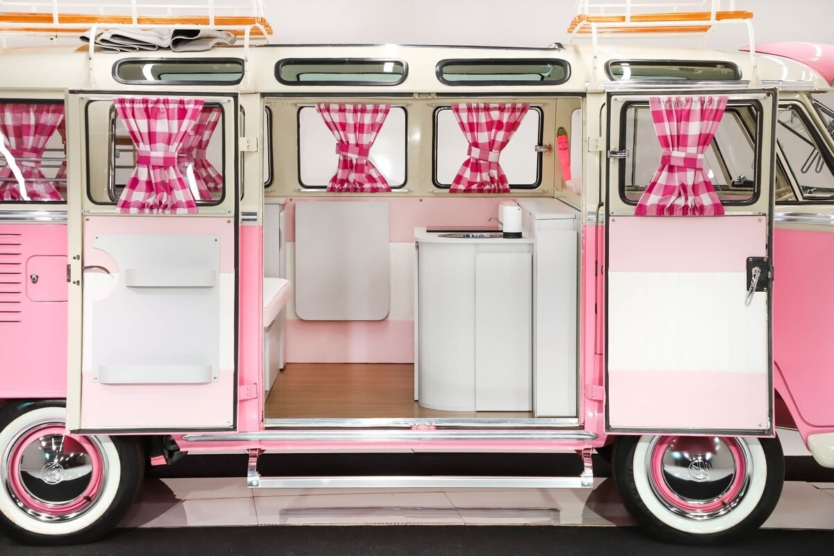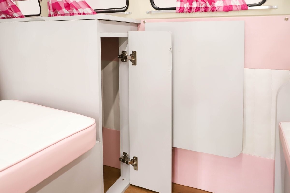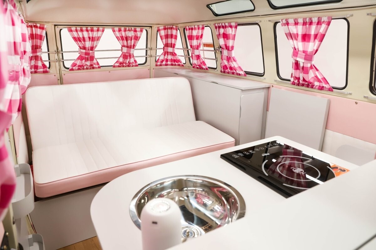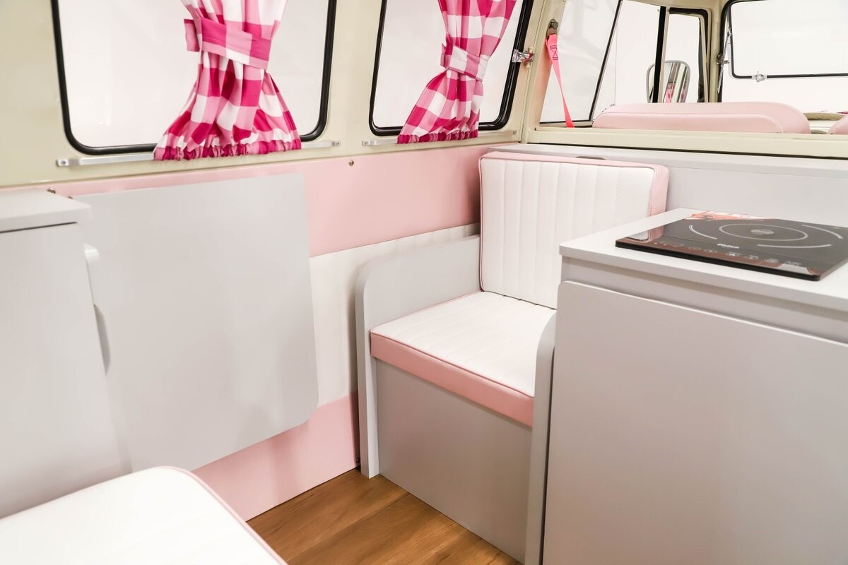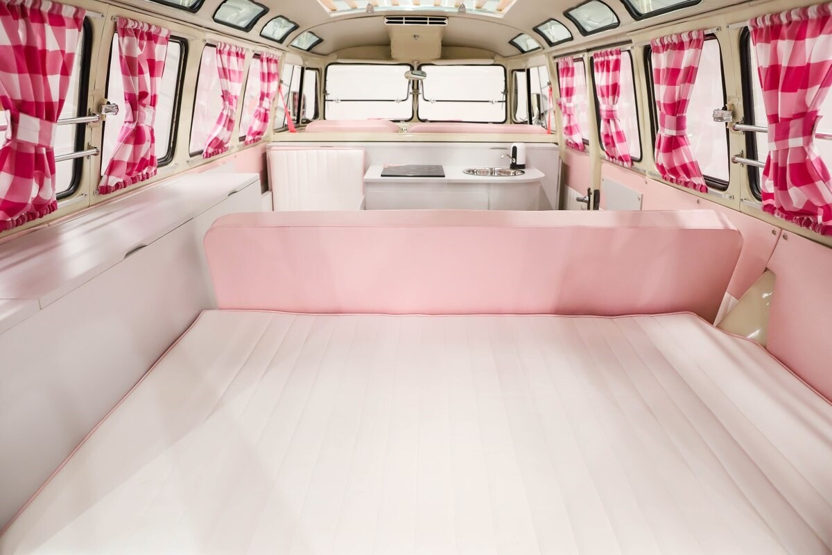 INTERIOR: It is brand new inside this camper bus. The entire inside was gutted, prepped, and painted. Up front the seats have new cushions and are reupholstered. The door panels are done to match. Overhead has the fresh air ventilation system and new visors. Down on the floor it has new carpet with bound edges. In the camper section it has professionally built custom laminate cabinets. The panels are finished on all sides and have premium hinges. There is lots of storage. There's a table that folds out. The kitchen area has a new never used sink, electric stove top and a refrigerator. The bench seat folds flat and makes a bed. It has new laminate flooring. Overhead is a new white perforated headliner that stretches front to back. It also has nice looking curtains at each window. The upholstery and cushions are all new.
