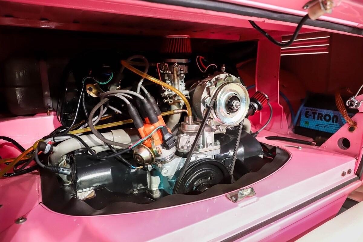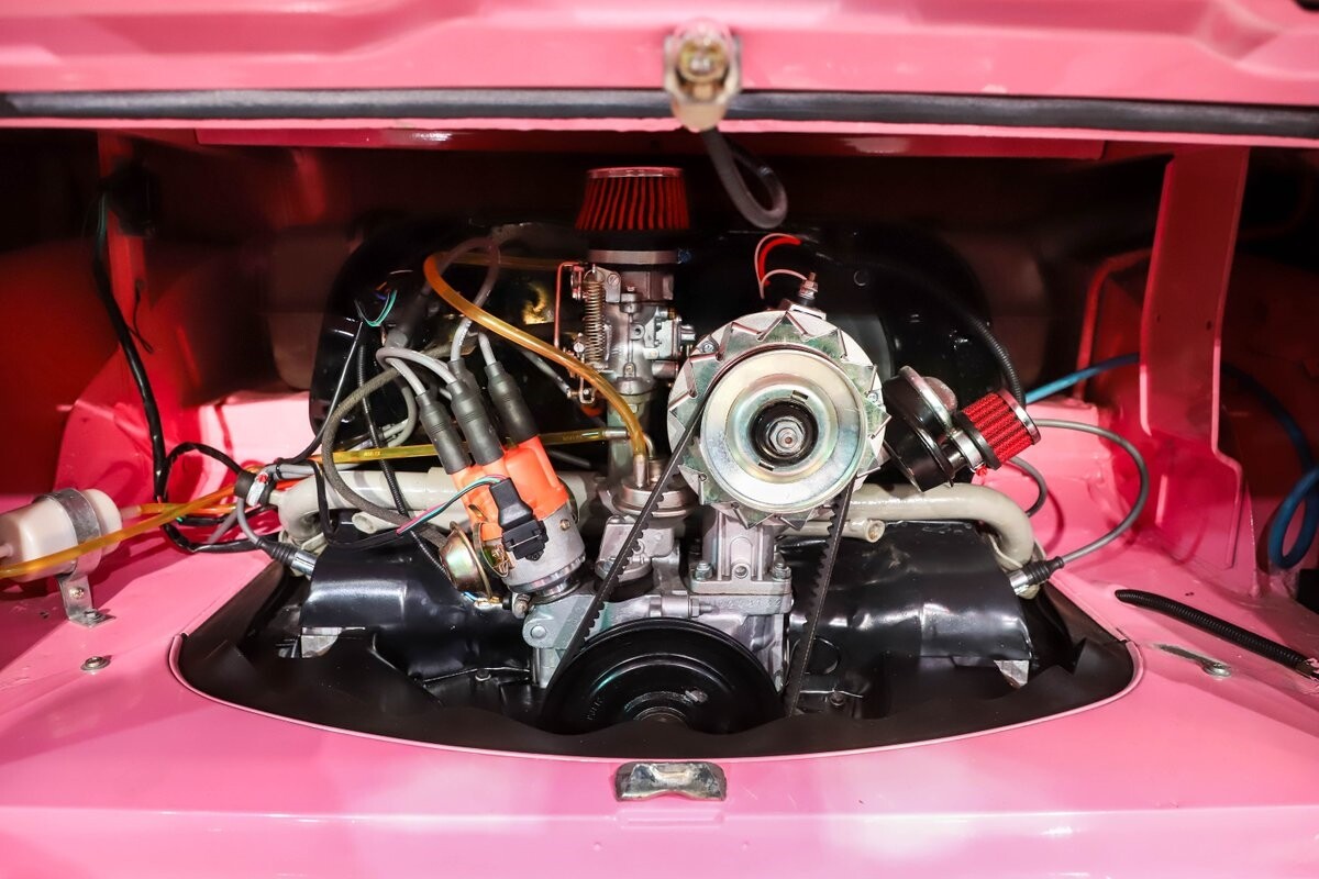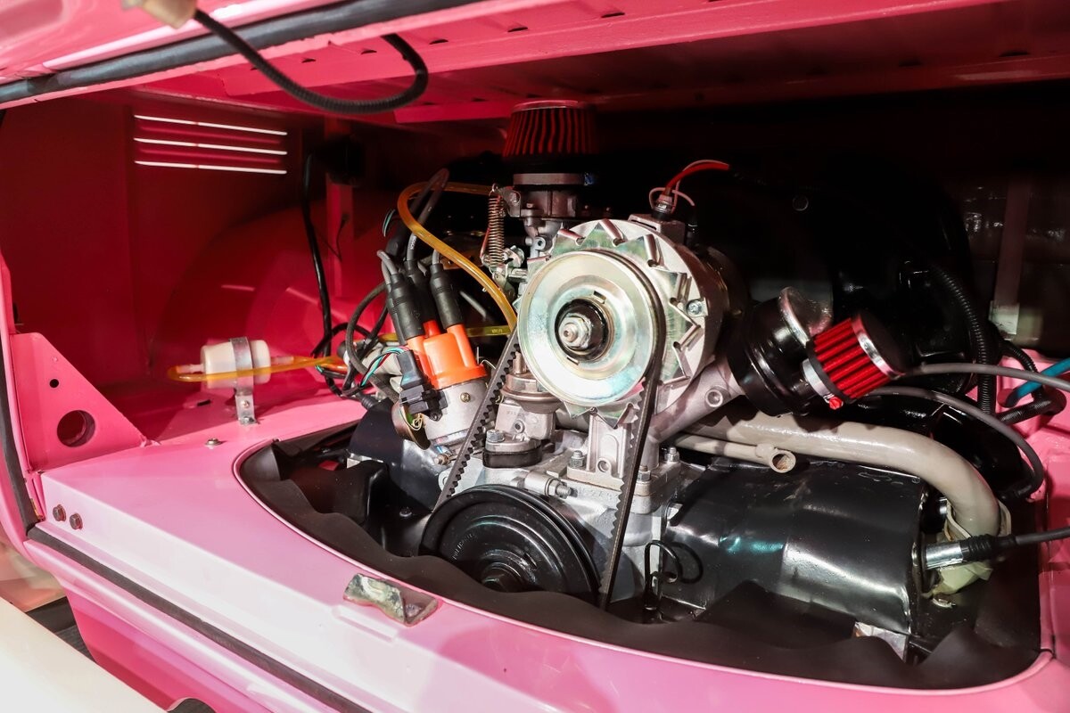ENGINE COMPARTMENT: The 4 cylinder motor was rebuilt. It fires right up and runs great. The components were restored. The alternator, carburetor, distributor look new. The engine bay is all solid metal and is painted glossy. There is a new battery and cables.