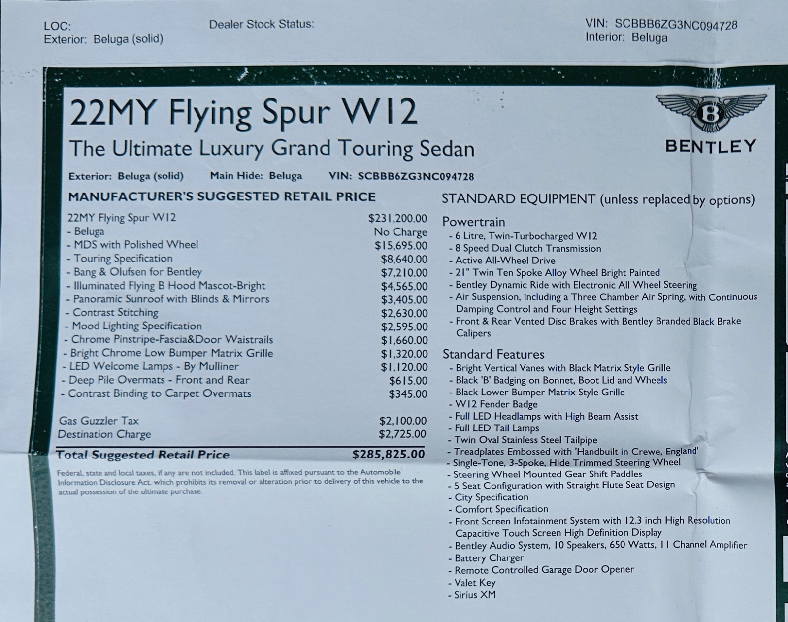 WITH 626 HORSEPOWER AND ALL THE LUXURY YOU COULD ASK FOR , THE FLYING SPUR IS ONE OF THE FINEST MACHINES EVER TO COME OUT OF THE BENTLEY FACTORY. AND WITH AN ORIGINAL STICKER PRICE OVER A QUARTER OF A MILLION DOLLARS IT IS A TREMENDOUS VALUE TODAY!