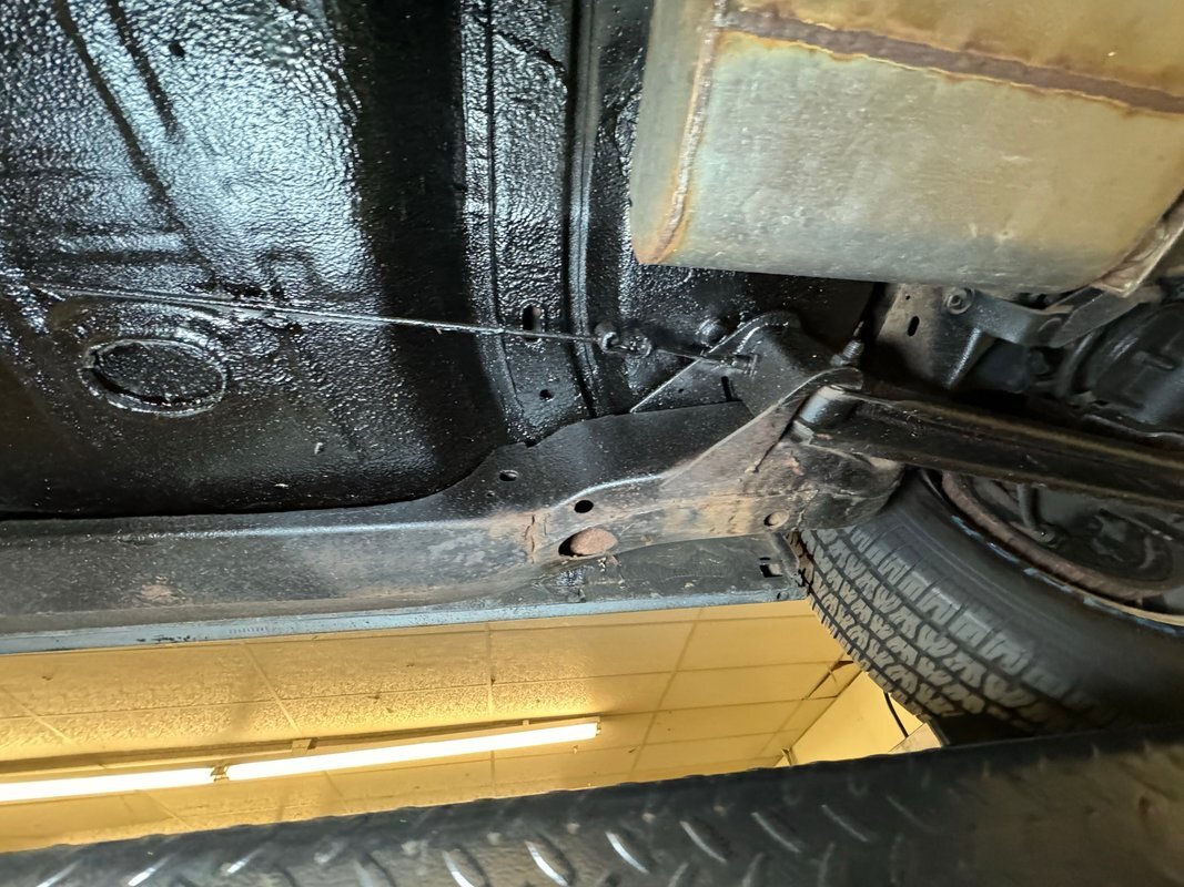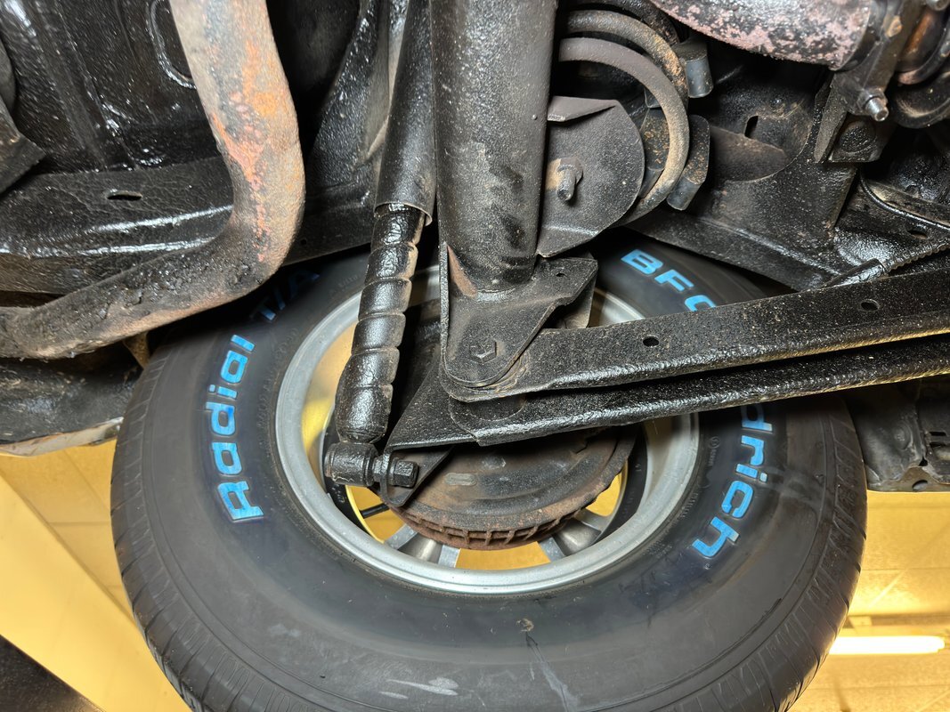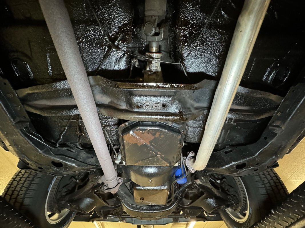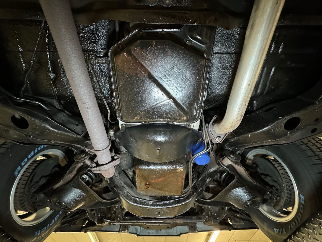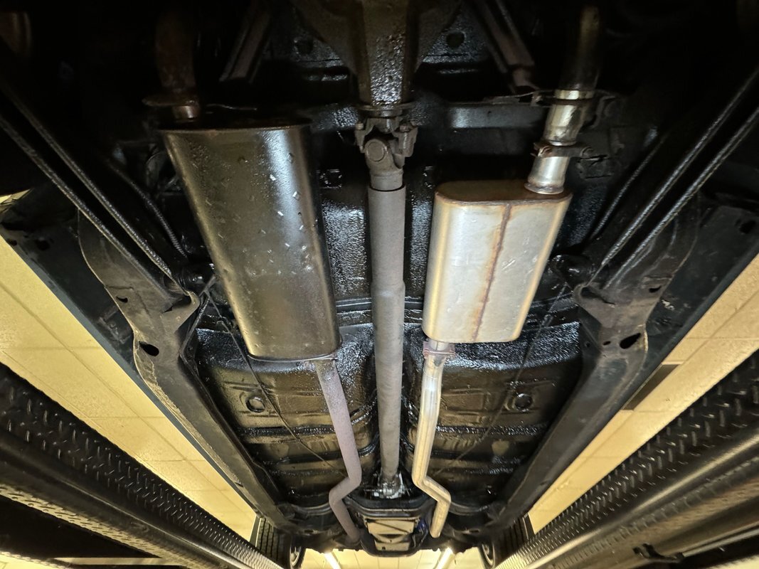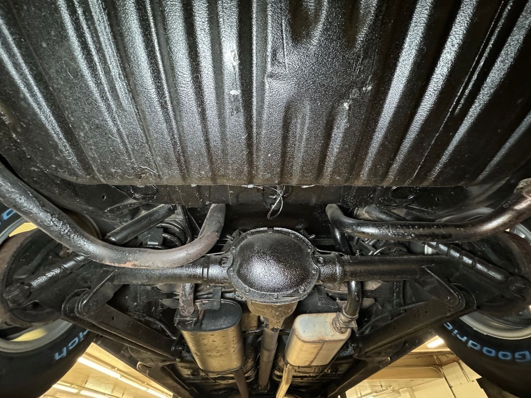 The belly pans appear to have been undercoated and there's not much surface rust underneath. One side of the dual exhaust looks newer than the other which is colored by surface rust but intact, and there's a stock muffler on that side and a Flowmaster on the newer run and they exit discreetly before reaching the back bumper. Some oil is noted on the oil pan and some residual fluid on the transmission pan and there's a bit of grime by the wheels but we've seen worse. There is some flaking rust around a body mount being the worse of the corrosion. For suspension, the car comes with coil springs up front and a four link with coil springs in the back and Delco spiral shock absorbers demonstrate more vintage hardware underneath.